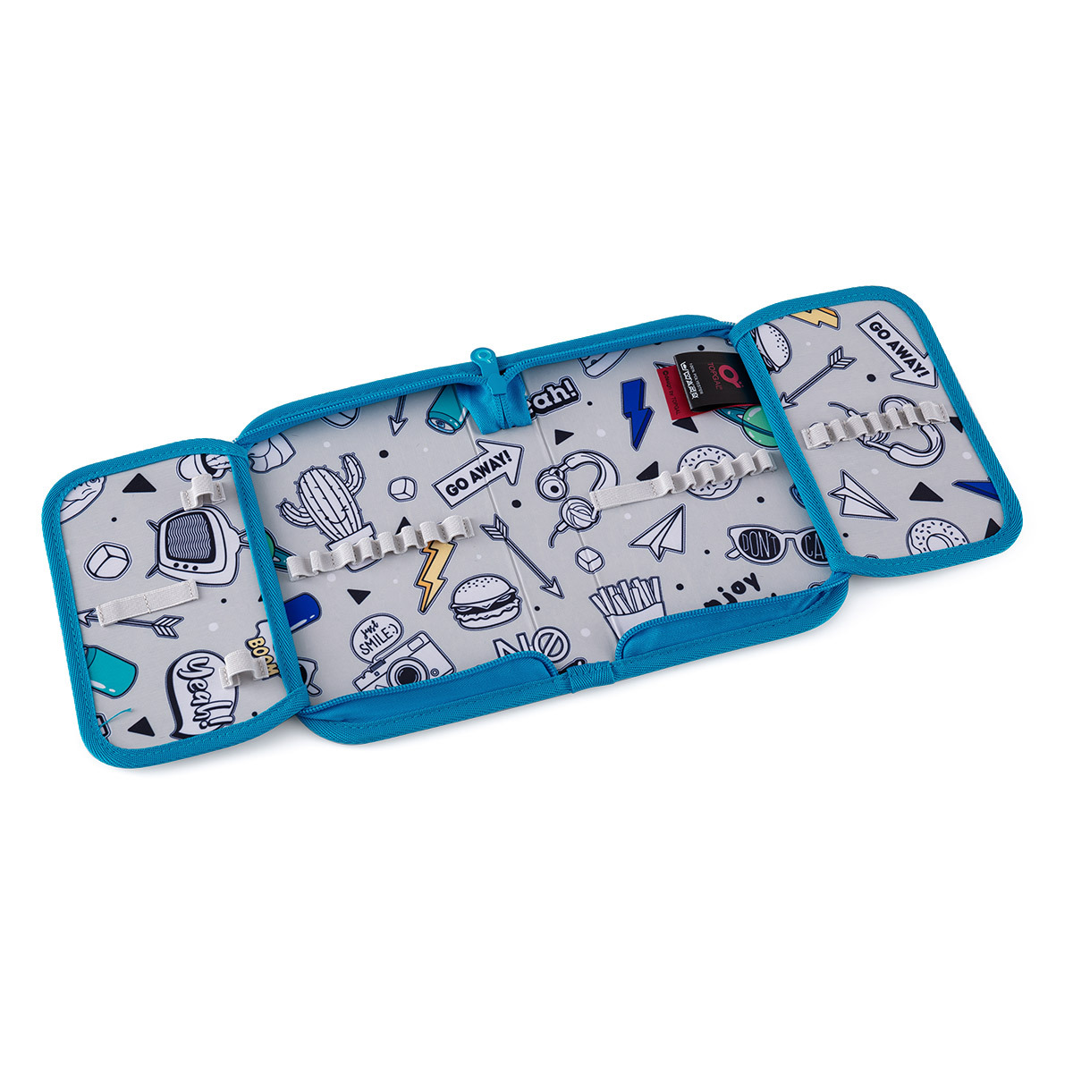 Jednokomorový školský peračník s dvoma chlopňami je vybavený 21 klasickými gumovými úchytmi na pastelky a fixky, troma širšími úchytmi na pravítka, kružidlo či nožnice, a dvoma väčšími úchytmi na gumu a strúhadlo. Pod chlopňou z priehľadnej fólie nájdete rozvrh hodín ale poslúži napríklad aj na ťaháky -)