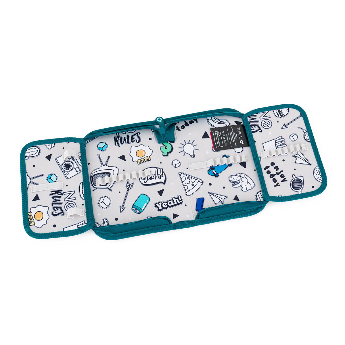 Jednopatrové školní pouzdro se dvěma klopami. Díky gumovým úchytům se do nich vejde celkem dvacetjedna pastelek, tužek a fixek. Tři širší úchyty poslouží na pravítko, kružítko či nůžky. Dva větší na gumu a ořezávátko.