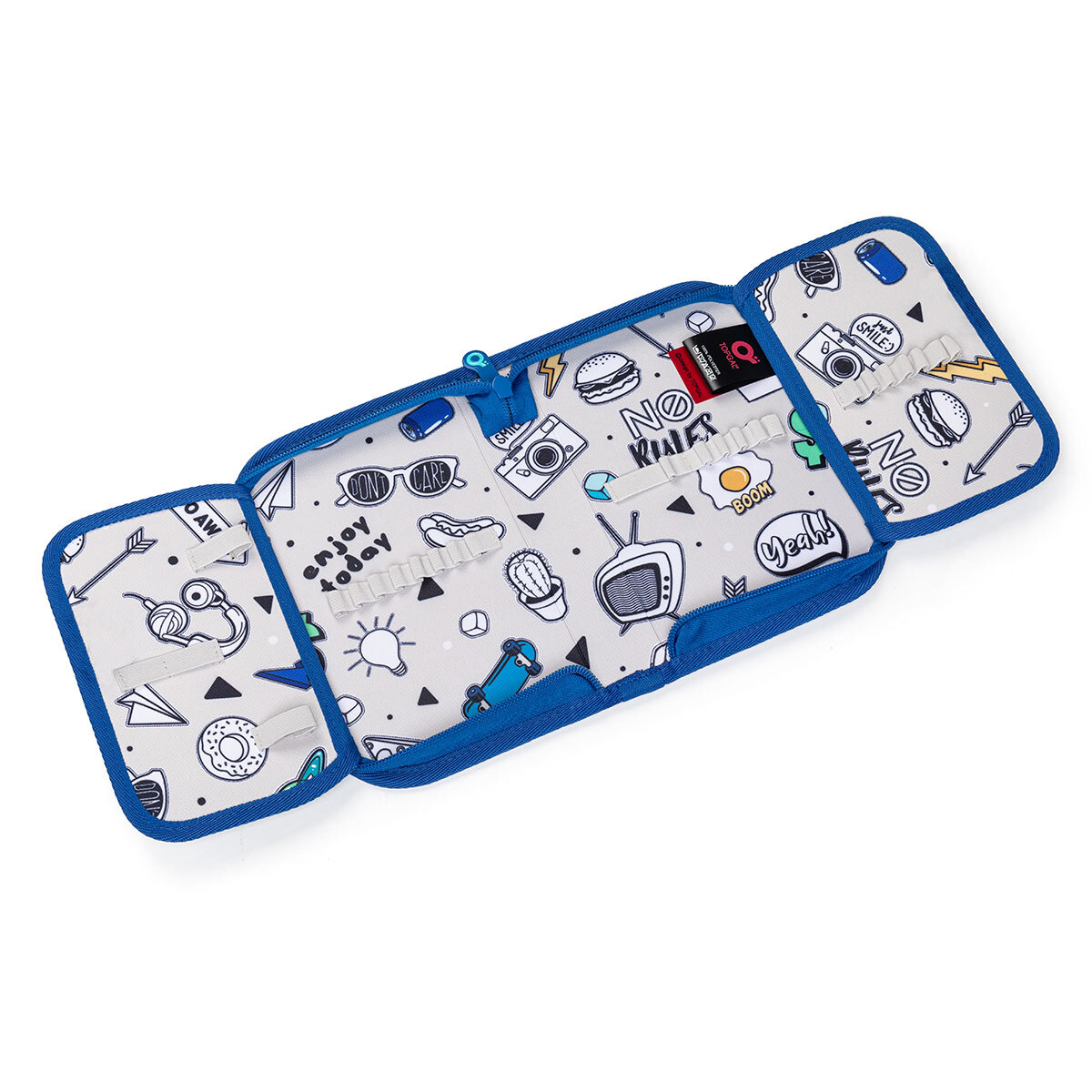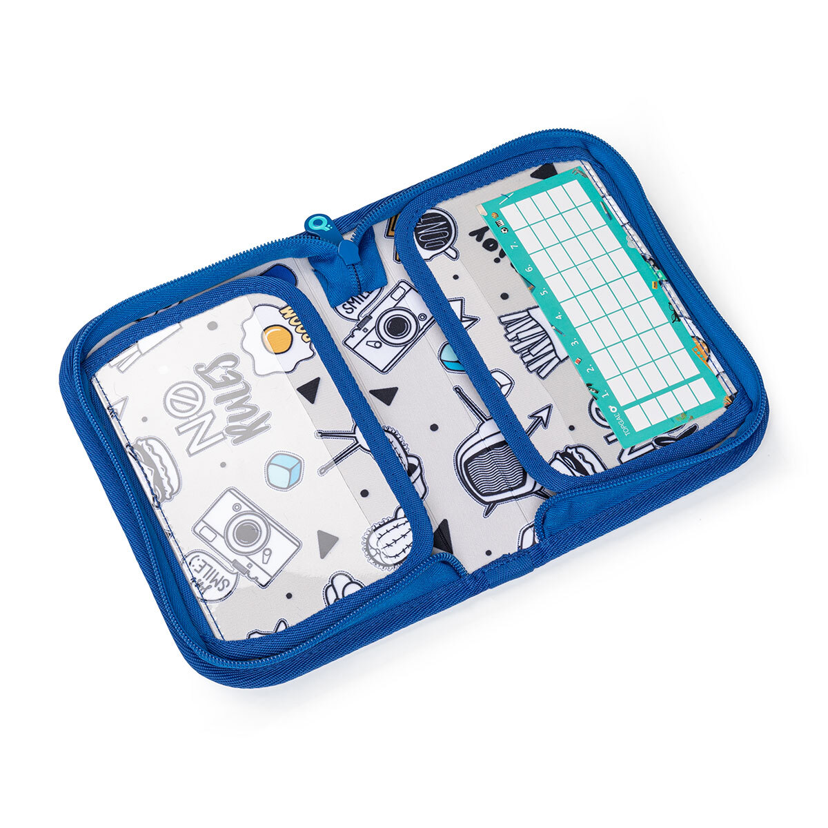 Jednokomorové školské puzdro s dvoma chlopňami je vybavené 21 klasickými gumovými úchytmi na pastelky a fixky, troma širšími úchytmi na pravítka, kružidlo či nožnice, a dvoma väčšími úchytmi na gumu a strúhadlo. Pod chlopňou z priehľadnej fólie nájdete rozvrh hodín ale poslúži napríklad aj na ťaháky -)