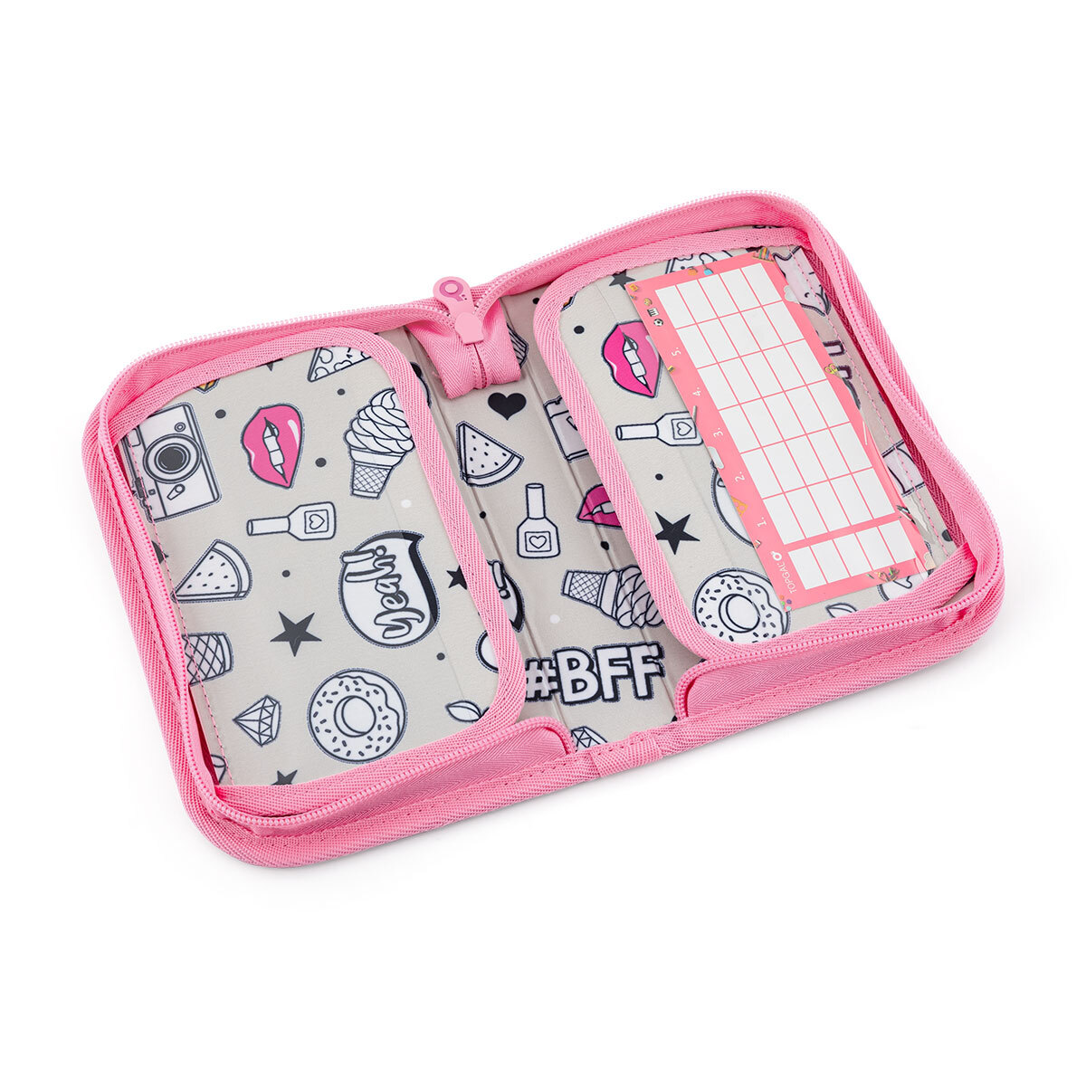 Jednokomorový školský peračník s dvoma chlopňami je vybavený 21 klasickými gumovými úchytmi na pastelky a fixky, troma širšími úchytmi na pravítka, kružidlo či nožnice, a dvoma väčšími úchytmi na gumu a strúhadlo. Pod chlopňou z priehľadnej fólie nájdete rozvrh hodín ale poslúži napríklad aj na ťaháky -)