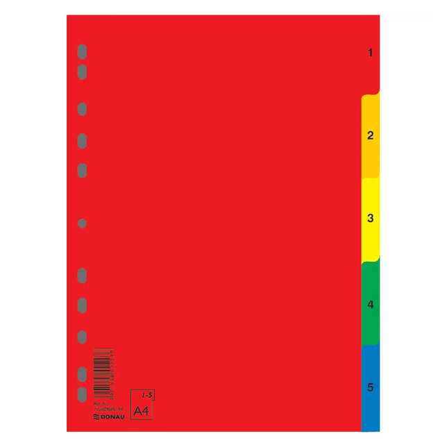 Kvalitný rozraďovač formátu A4 je vyrobený z tuhého polypropylénu, ktorý zabezpečuje vysokú odolnosť a dlhú životnosť pri každodennom používaní. Jednotlivé listy sú vyhotovené v rôznych farbách a sú prehľadne číslované od 1 do 5, čo umožňuje jednoduchú organizáciu dokumentov.