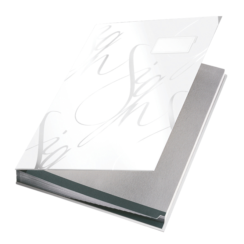 Elegantná biela podpisová kniha LEITZ na organizovanie dokumentov, ako sú zmluvy, faktúry a akékoľvek ďalšie dokumenty, ktoré vyžadujú podpísanie alebo schválenie. Vynikajúci dizajn obalu a svieže farby pre moderné kancelárske prostredie. Na poťah je aplikovaná hodvábna laminácia pre atraktívnu a dlhotrvajúcu ochranu. Štítok na pomenovanie knihy (napr. Názov oddelenia alebo nadriadeného). 18 pevných oddeľovačov kariet so špeciálnym drsným povrchom, aby sa zabránilo vysunutiu dokumentov a s okienkami v oddeľovačoch na kontrolu obsahu. 90% podpisovej knihy je vyrobená zo 100% recyklovaného materiálu.