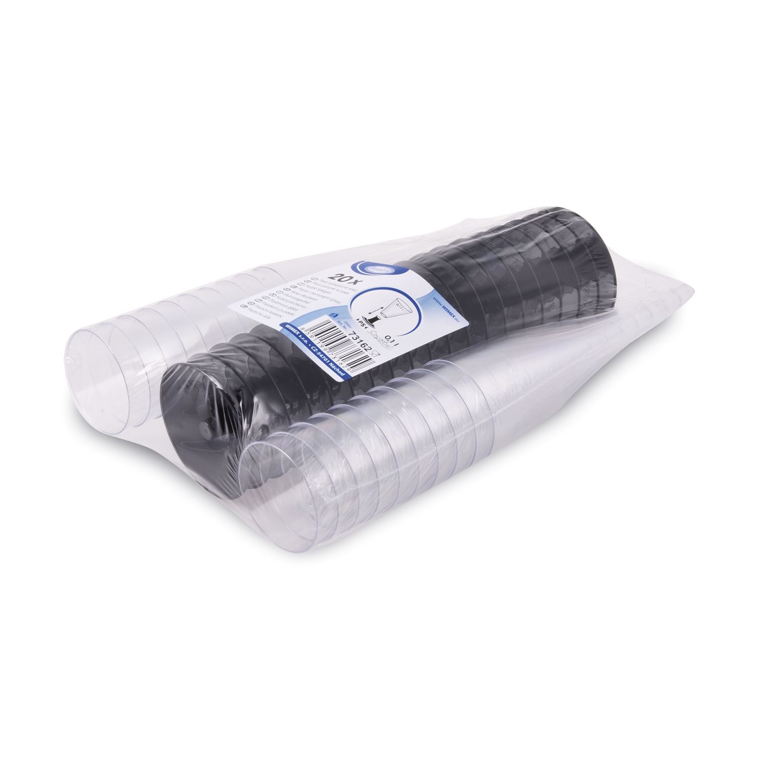Pohár dvojdielny s čiernou stopkou na sekt s ryskou 0,1l. Vyrobené z číreho plastu (PS) Priemer pohára 65mm. Výška 14,4cm. Balenie 20ks