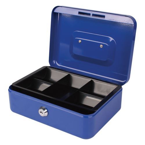 Kovová uzamykateľná pokladňa z oceľového plechu pre bezpečné uloženie bankoviek, mincí a iných cenností. Zapustená rúčka pre jednoduchý prenos a úschovu. Má vyberateľnú plastovú priehradku na mince. Dodávané s dvoma kľúčmi. Rozmer: 25,7 x 18 x 8cm. Farba: modrá