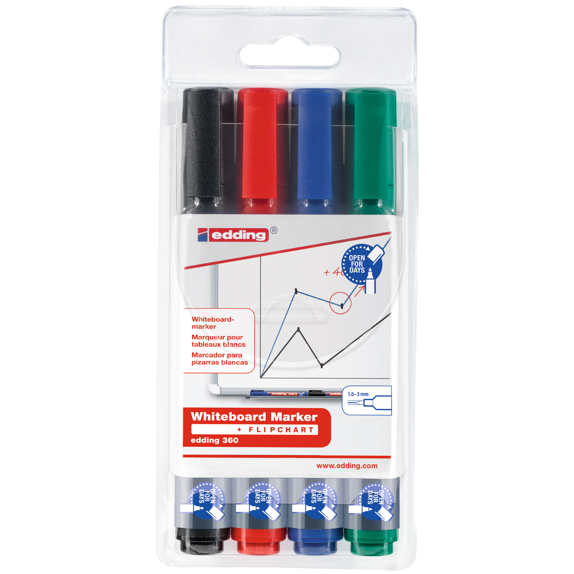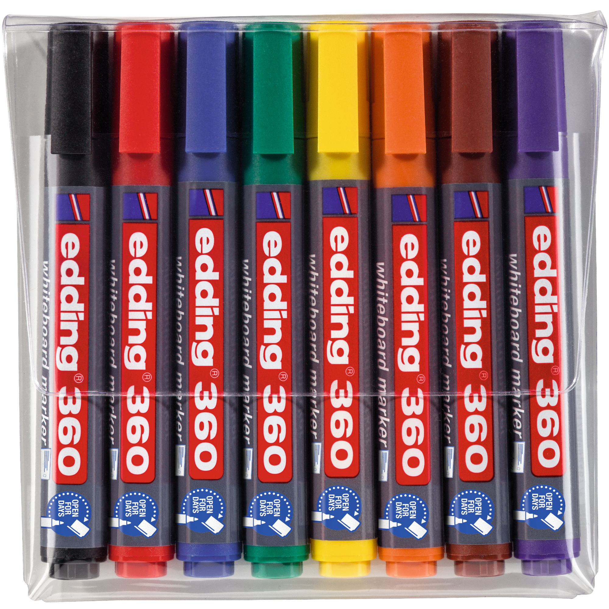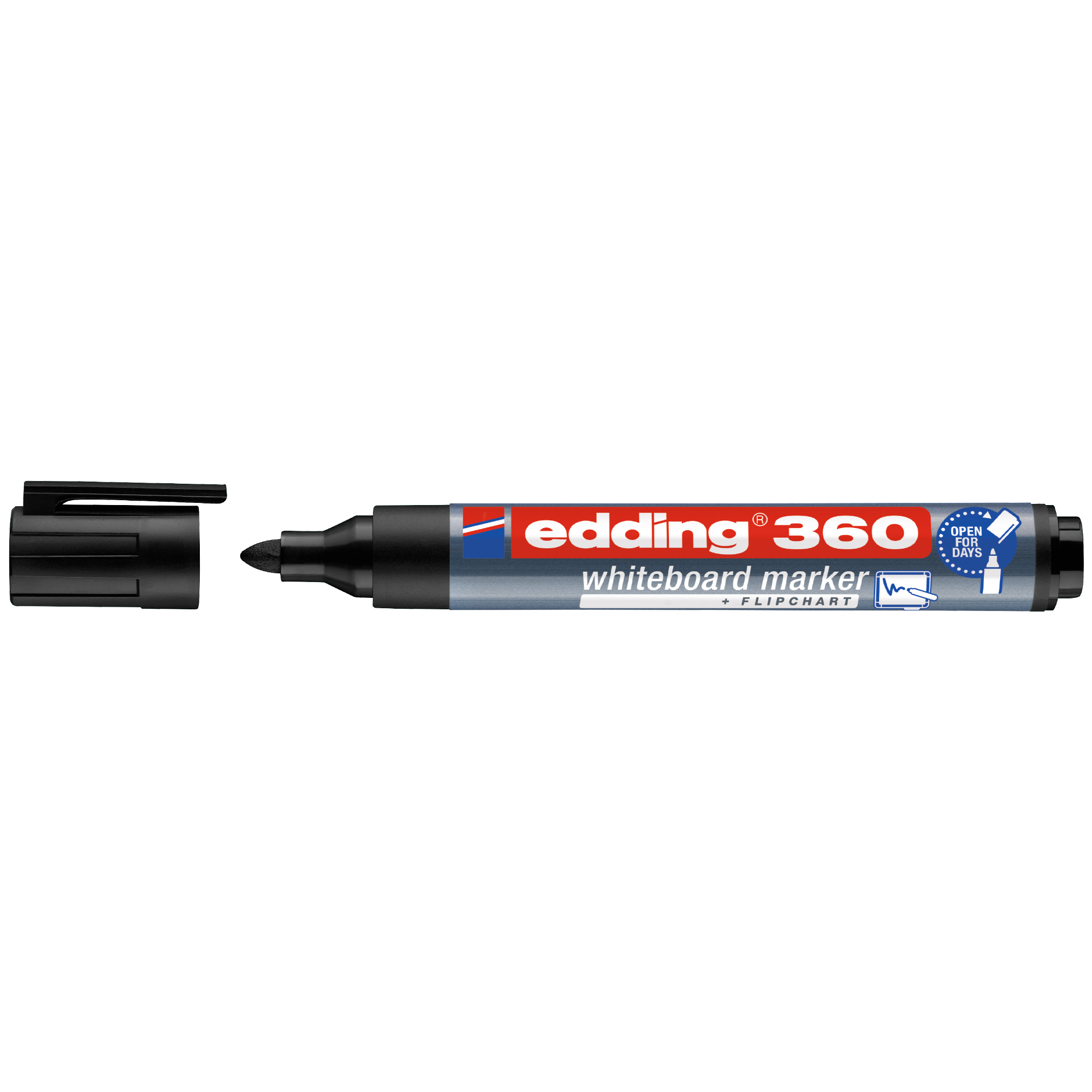 Popisovač edding 360 na biele tabule a taktiež na flipchartové tabule. Písmo je možné zasucha zotrieť prakticky zo všetkých neporéznych povrchov, ako je email, sklo alebo melamín. Šírka stopy okrúhleho hrotu je 1,5-3 mm. Vďaka technológii cap-off môžete popisovač ponechať bez uzáveru niekoľko dní bez toho, aby hrot zaschol. Atrament popisovačov na biele tabule je svetlostály, dostupný v 10 farbách. Znovu naplniteľný v čiernej, červenej, modrej a zelenej farbe pomocou doplňovacieho systému edding BTK 25. Uzáver sa dá nasadiť na koniec popisovača, aby sa zabránilo jeho strate. Vďaka praktickému klipu sa dá popisovač pripevniť na odev a predmety a neodkotúľa sa. Široký výber farieb. Vysokokvalitný značkový produkt. Vyrobené v Nemecku.