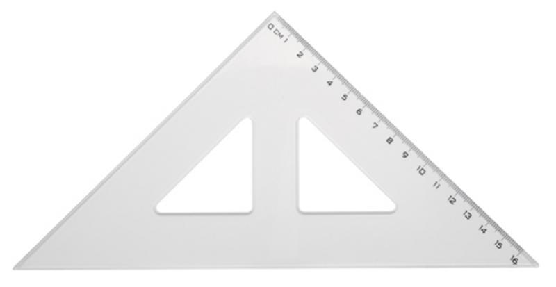 Transparentné plastové pravítko. Trojuholník s ryskou. Dĺžka: 16 cm Balenie: 1 ks Farba: číra