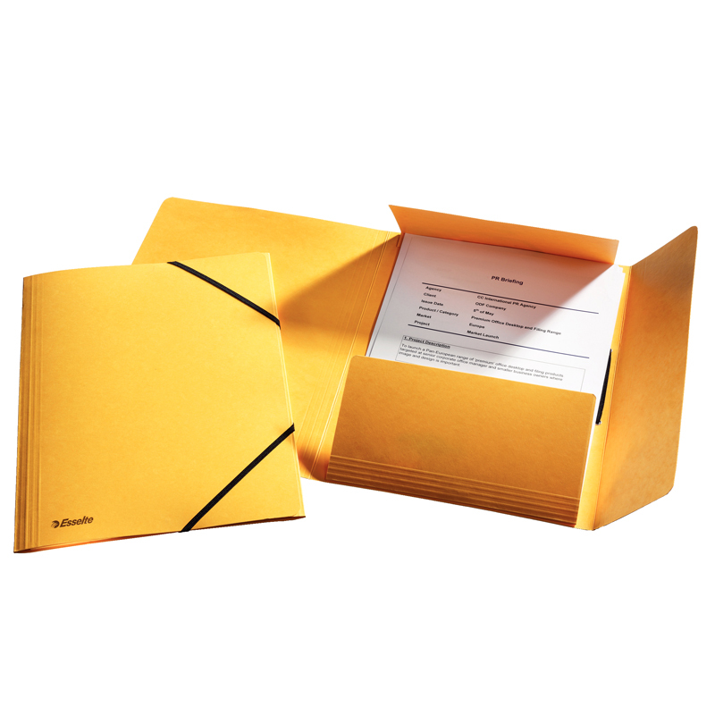 Prešpánové obaly s troma chlopňami a s gumičkou na dokumenty formátu A4. Hladký prešpán vo výrazných farbách, príjemný na dotyk. Prelisy na chlopniach a chrbte obalov zvyšujú ich kapacitu na uloženie objemnejších materiálov. Gumičky cez rohy zabraňujú vypadnutiu dokumentov, sú farebne zladené s farbou prešpánu Rozmer 320 x 233 mm Farba Žltá Balenie 10 ks