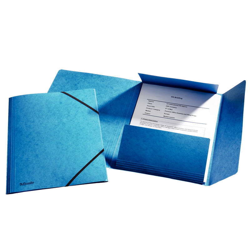 Pevný obal vyrobený z 400gr kartónu, z vonkajšej strany lesklý. Prelisy na chlopniach a chrbte zvyšujú ich kapacitu na uloženie objemnejších dokumentov. Farba modrá Väčšie balenie 50 ks