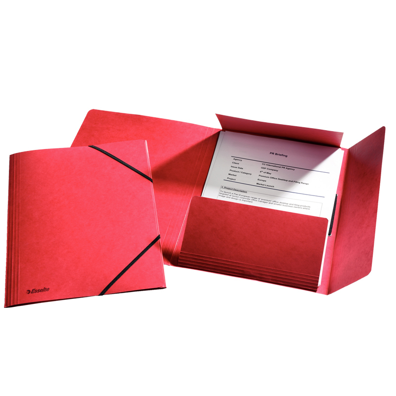 Trojchlopňová mapa s gumou vyrobená z 300g lesklého kartónu pre formáty papierov do A4. Chlopňe bránia vypadnutiu menších dokumentov. Farba:červená
