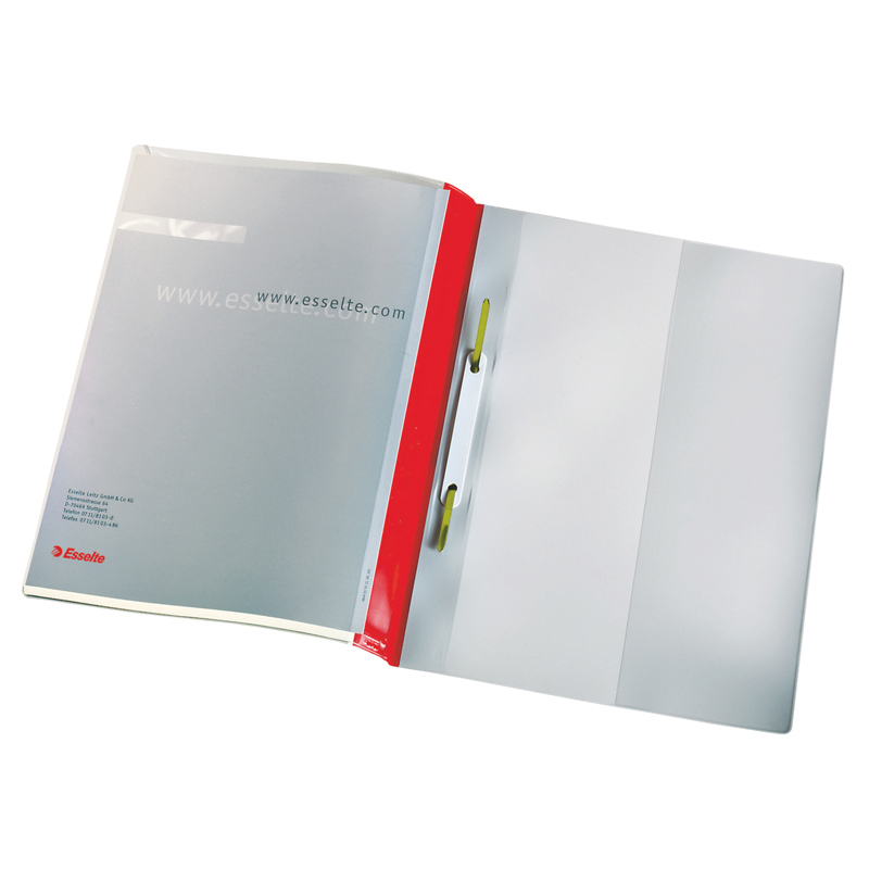 Prezentačný červený rýchloviazač s predným priehľadným vreckom pre individuálne riešenie s možnosťou vloženia listu A4. Obal slúži na uloženie dierovaných dokumentov formátu A4, sú širšie ako bežné obaly s rýchloviazačom a tak umožňujú zakladanie dokumentov uložených aj v euroobaloch. Vyrobené z kvalitného PVC. Priehľadné vrecko po celej dĺžke vnútornej zadnej strany na uloženie poznámok. Rozmery 310 x 238 mm. Farba červená.