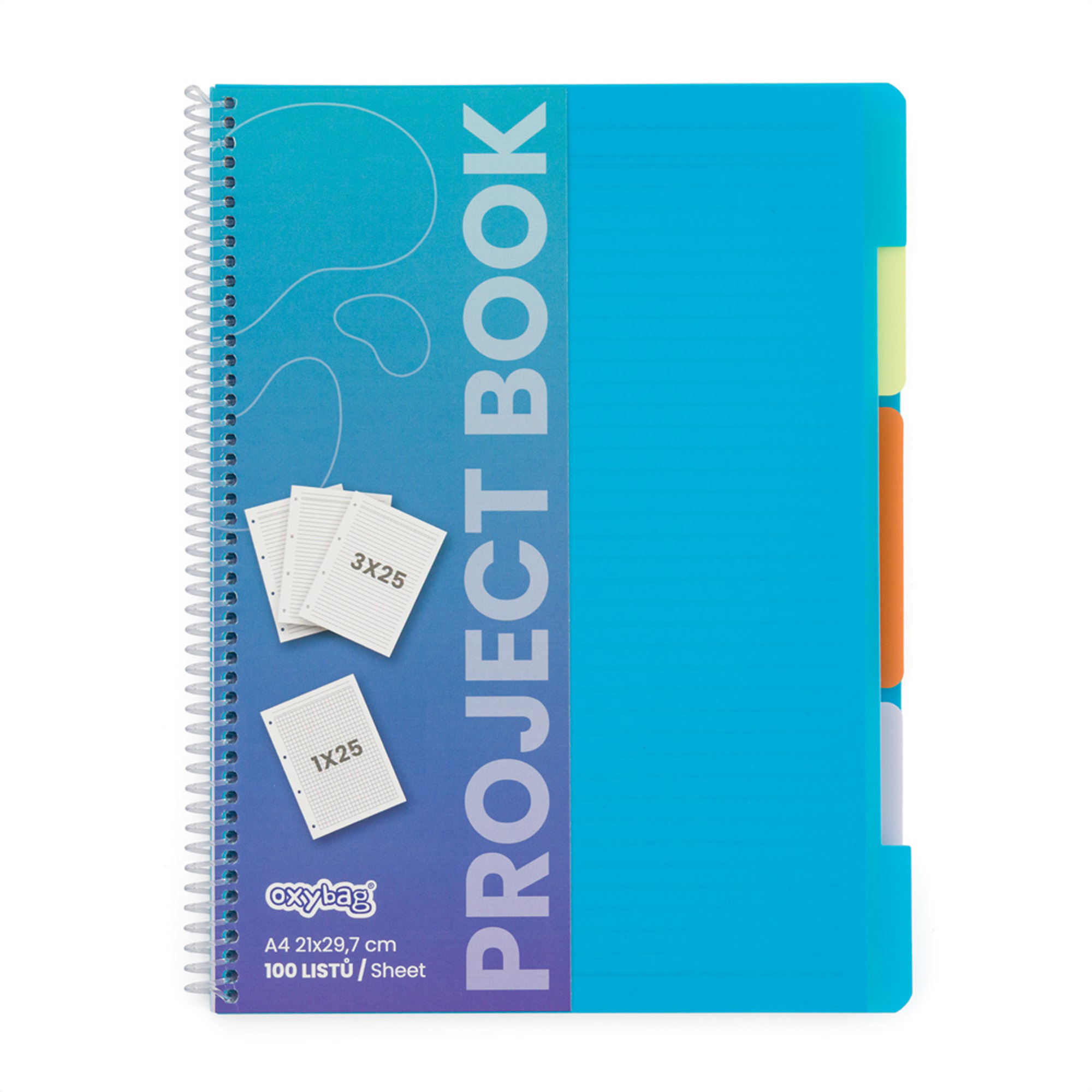 A praktikus projektkönyv négy részre van tagolva, amelyek megkönnyítik a jegyzetek szervezését. Összesen 100 lapot tartalmaz – három vonalas szekciót (3 × 25 lap) és egy négyzetrácsosat (25 lap). Az egyes részeket színes, tartós polipropilén elválasztók választják el, amelyek segítségével gyorsan megtalálhatja a szükséges jegyzeteket. A lapok perforáltak az egyszerű letépés érdekében, és négylyukú lyukasztással rendelkeznek, hogy mappába helyezhetők legyenek. Az ellenálló polipropilén borító védi a tartalmat a mindennapi használat során iskolában és irodában egyaránt. Ideális választás diákoknak és mindenkinek, aki több projektet szeretne rendezett formában tartani.