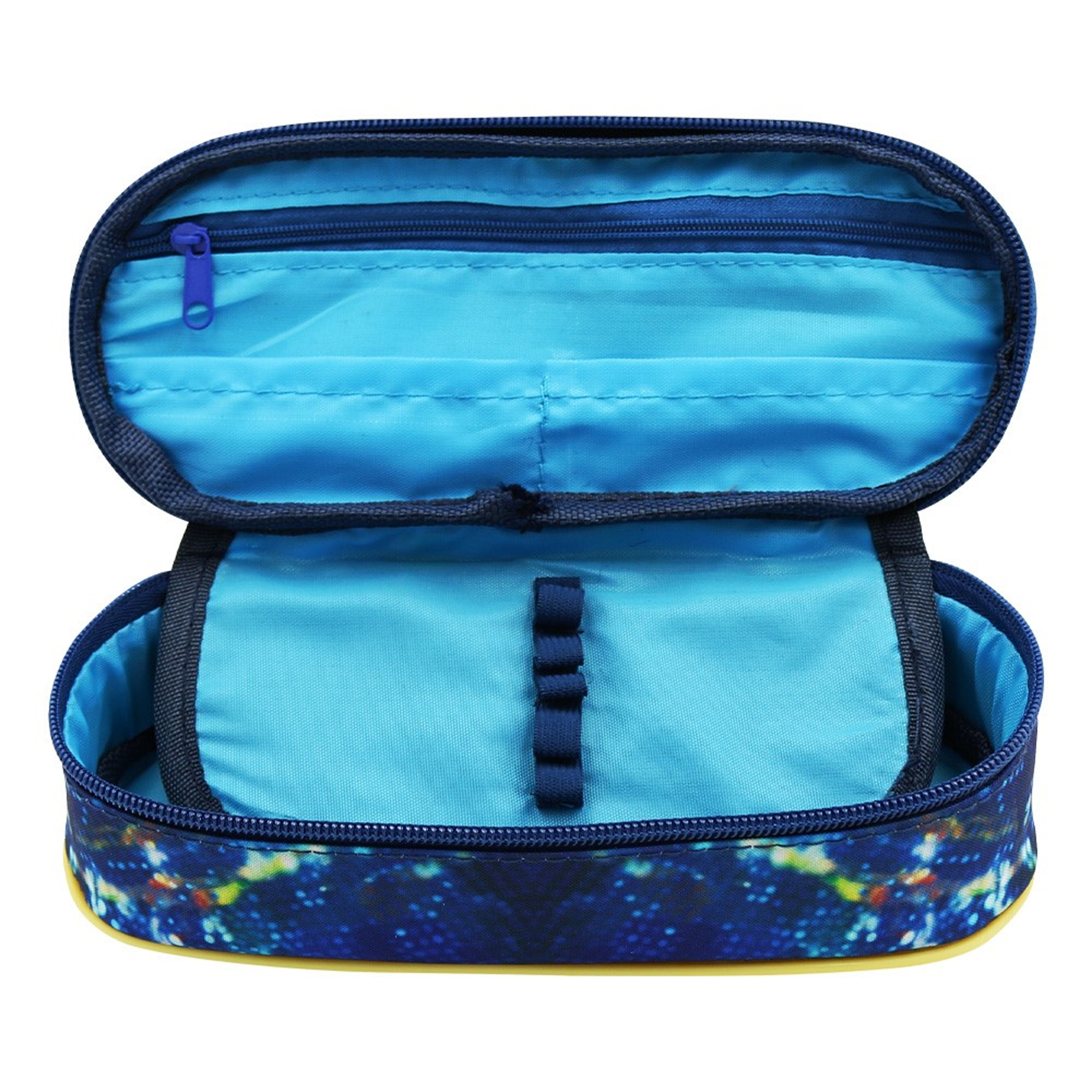 Objemný peračník s motívom moji priatelia s chlopňu so 4-mi pútkami na perá a ceruzky. Na druhej strane chlopne je 5 pútok na písacie potreby. V hornej časti je vrecko na zips. Spodná časť je určená pre voľne vložené písacie a kresliace potreby. Rozmery: 210 x 95 x 60 mm