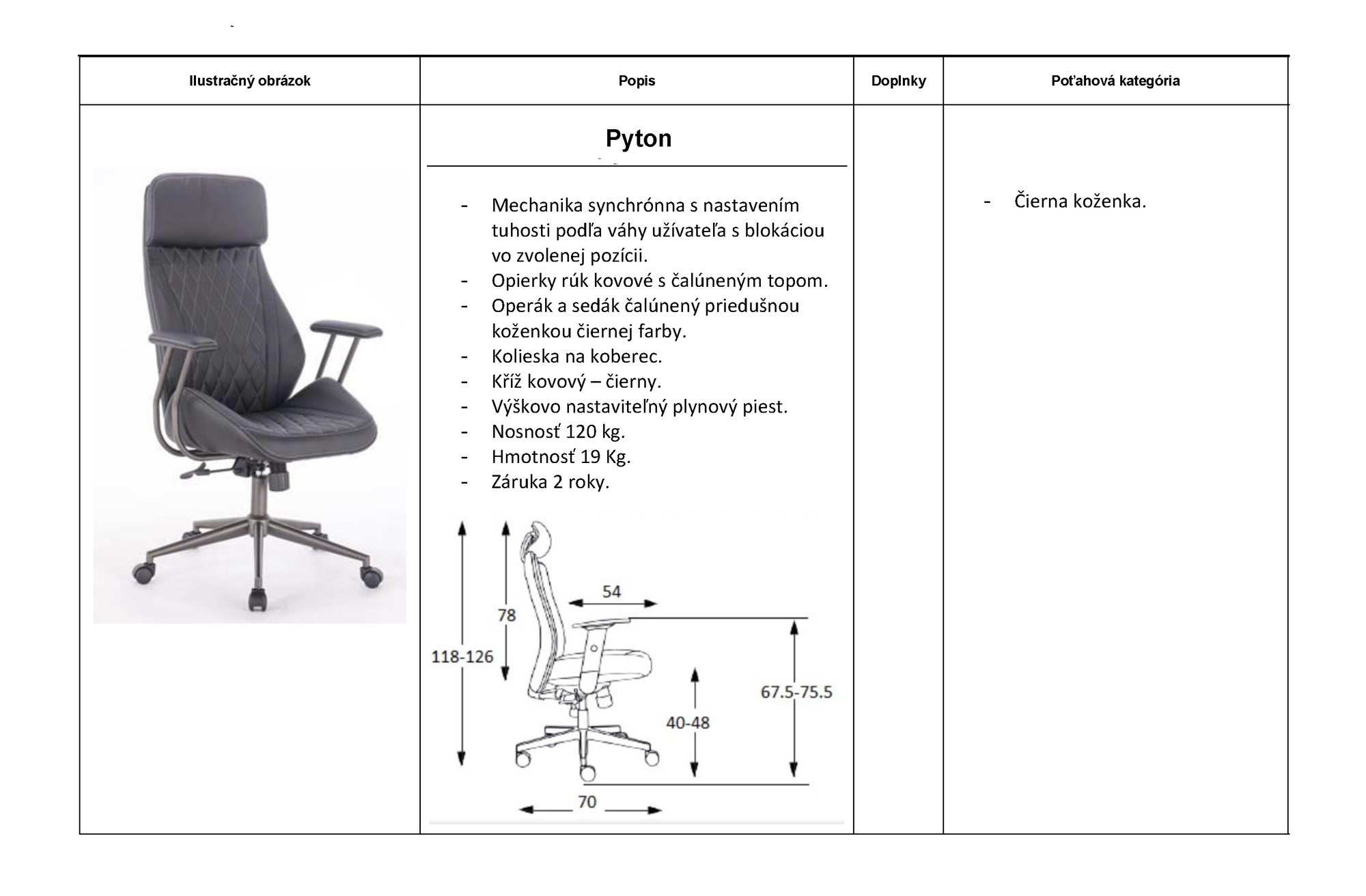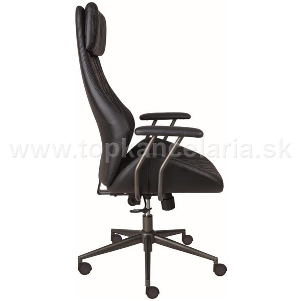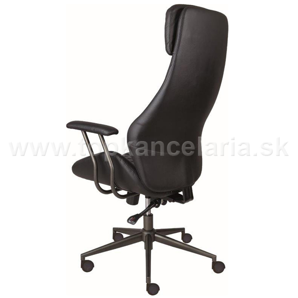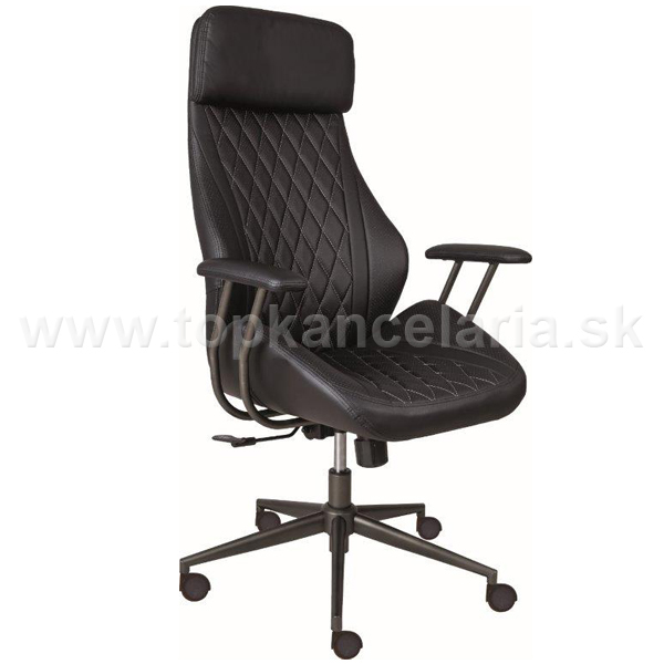 Kancelárske kreslo so synchro mechanikou s nastavením tuhosti podľa váhy užívateľa s blokáciou vo zvolenej pozícii. Stabilná kovová konštrukcia opierok rúk s čalúneným topom. Operadlo a sedadlo kancelárskeho kresla je čalúnené s priedušnou koženkou čiernej farby. Čierny kovový kríž s kolieskami na koberec. Nosnosť kresla do 120 kg. Váha stoličky 19kg. Záruka 2 roky.