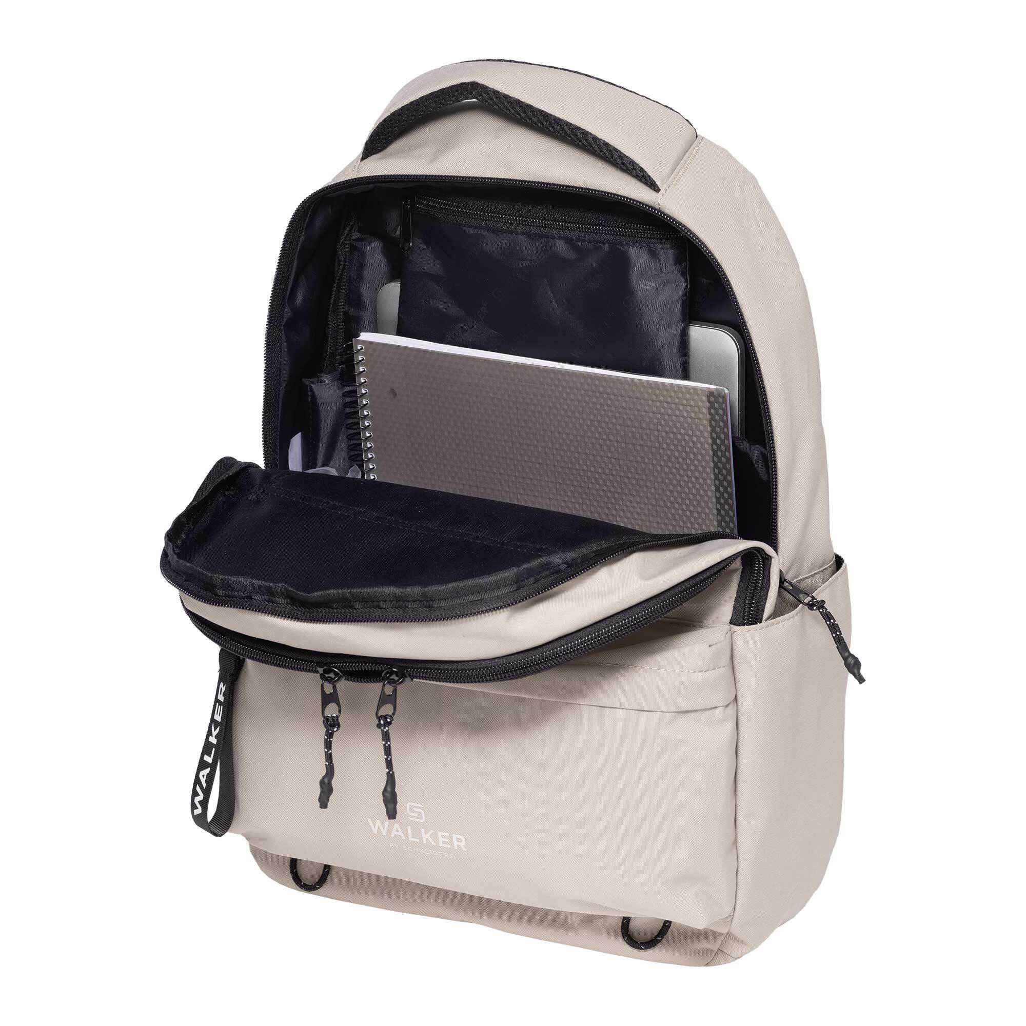 Voľnočasový ruksak s prešívaným chrbtom a anatomicky tvarovanými, výškovo nastaviteľnými ramennými popruhmi ponúka komfortné nosenie a praktické usporiadanie priestoru. Zadná komora na zips obsahuje vystužené vrecko na notebook do veľkosti 15" a malé vrecko na zips na bezpečné uloženie drobností. Predná komora je vybavená organizérom a sieťovaným vreckom na zips, ktoré umožňujú prehľadné uskladnenie vecí.