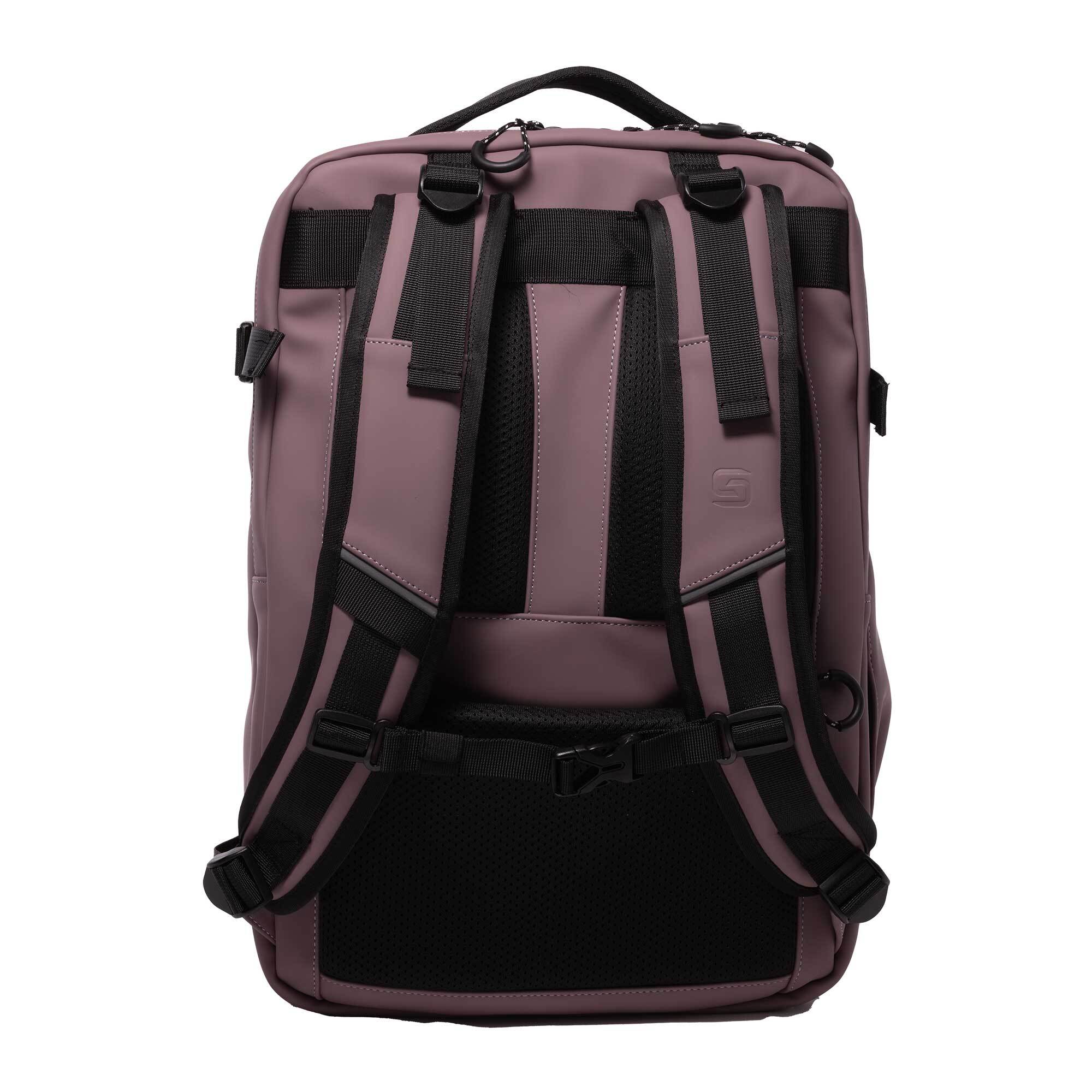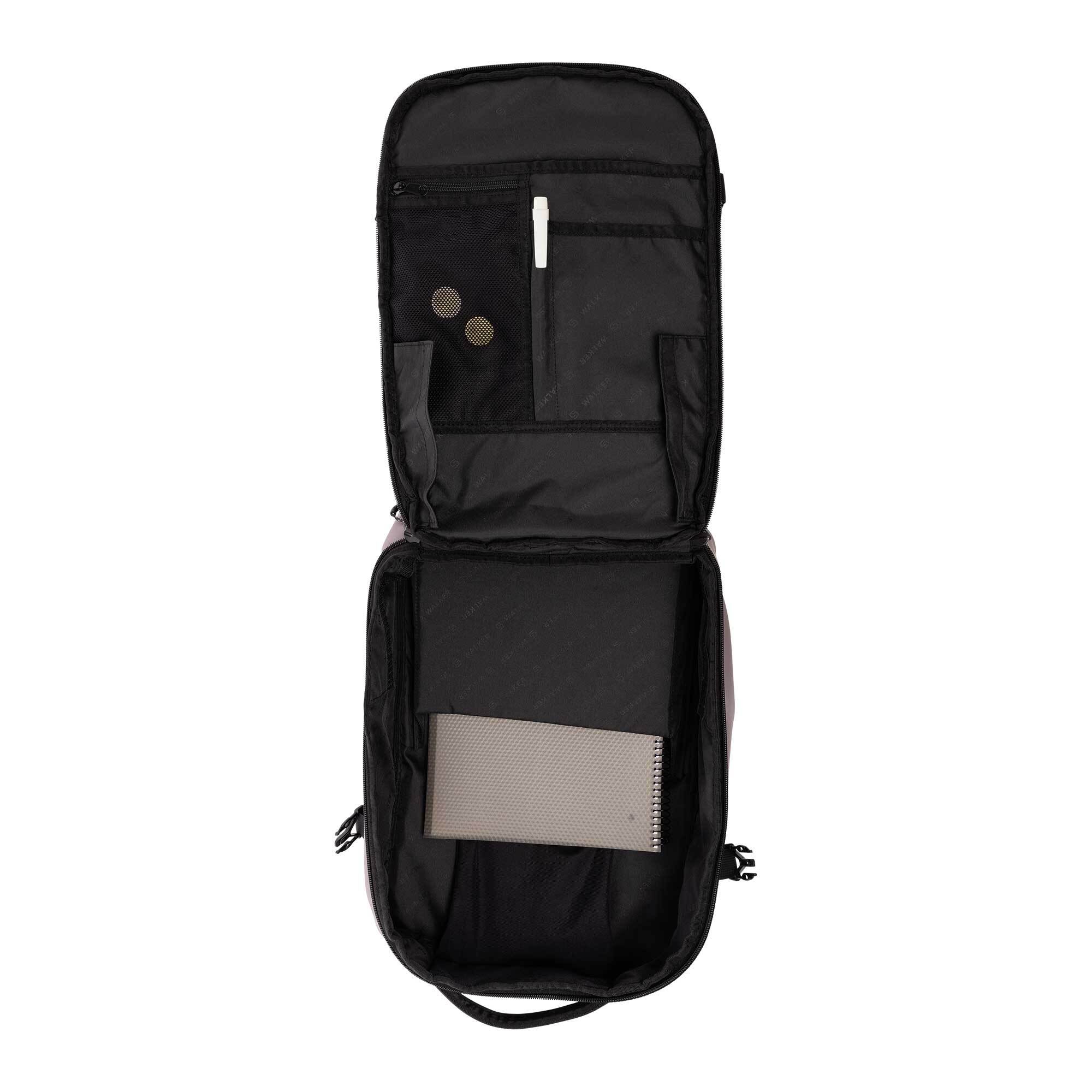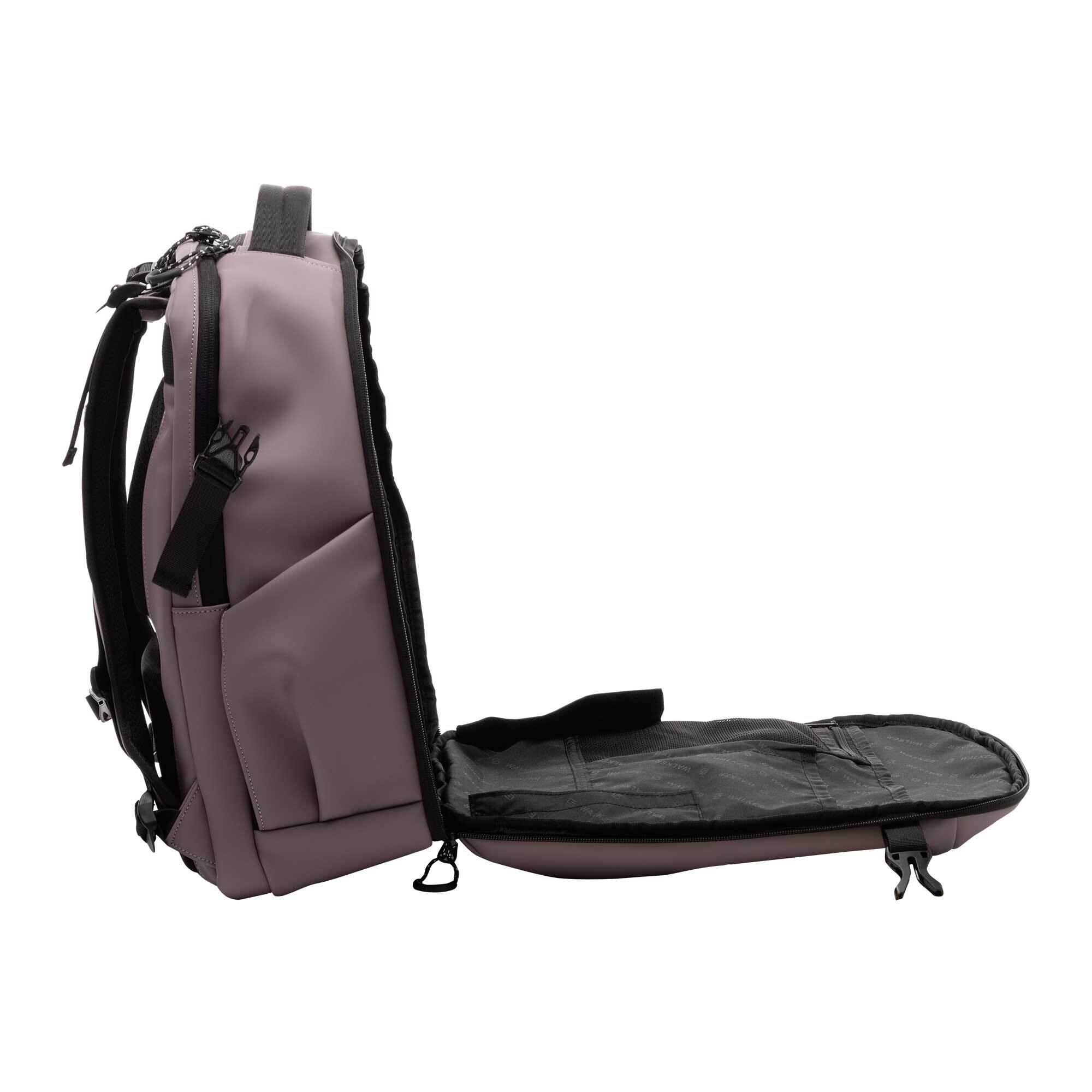 Ruksak má bezpečnostné prvky, ako je tajné vrecko v bedrovej časti s RFID ochranou, ktorá blokuje bezdrôtové komunikácie a zabraňuje neoprávnenému čítaniu dát z kreditných kariet. Zadná vystužená komora je určená na notebook do veľkosti 15" a obsahuje aj samostatné vrecko na tablet. Hlavná komora má ďalšie vystužené vrecko na notebook a tablet, organizér s vreckom na zips a priestor na dokumenty formátu A4. Ruksak je navrhnutý na maximálne pohodlie a funkčnosť – vďaka suchým zipsom vo vnútri hlavná komora sa dá úplne roztvoriť o 180°. Na bezpečné uloženie drobností slúži horné fleecom podšité vrecko na okuliare, dve skryté predné vrecká na zips a jedno bočné vrecko vhodné na fľašu. Ruksak je vybavený bočnými sťahovacími popruhmi na reguláciu objemu a praktickým držadlom na pohodlné nosenie. Vyrobený je zo špeciálneho materiálu Dull-PU, ktorý kombinuje odolnosť, flexibilitu a trvanlivosť s moderným matným vzhľadom. Materiál je impregnovaný proti vode a nečistotám. Zároveň je odolný aj voči mechanickému poškodeniu, ako sú škrabance. Ruksak má rozmery 30 × 44 × 22 cm. Objem 29 l. Hmotnosť približne 1100g.
