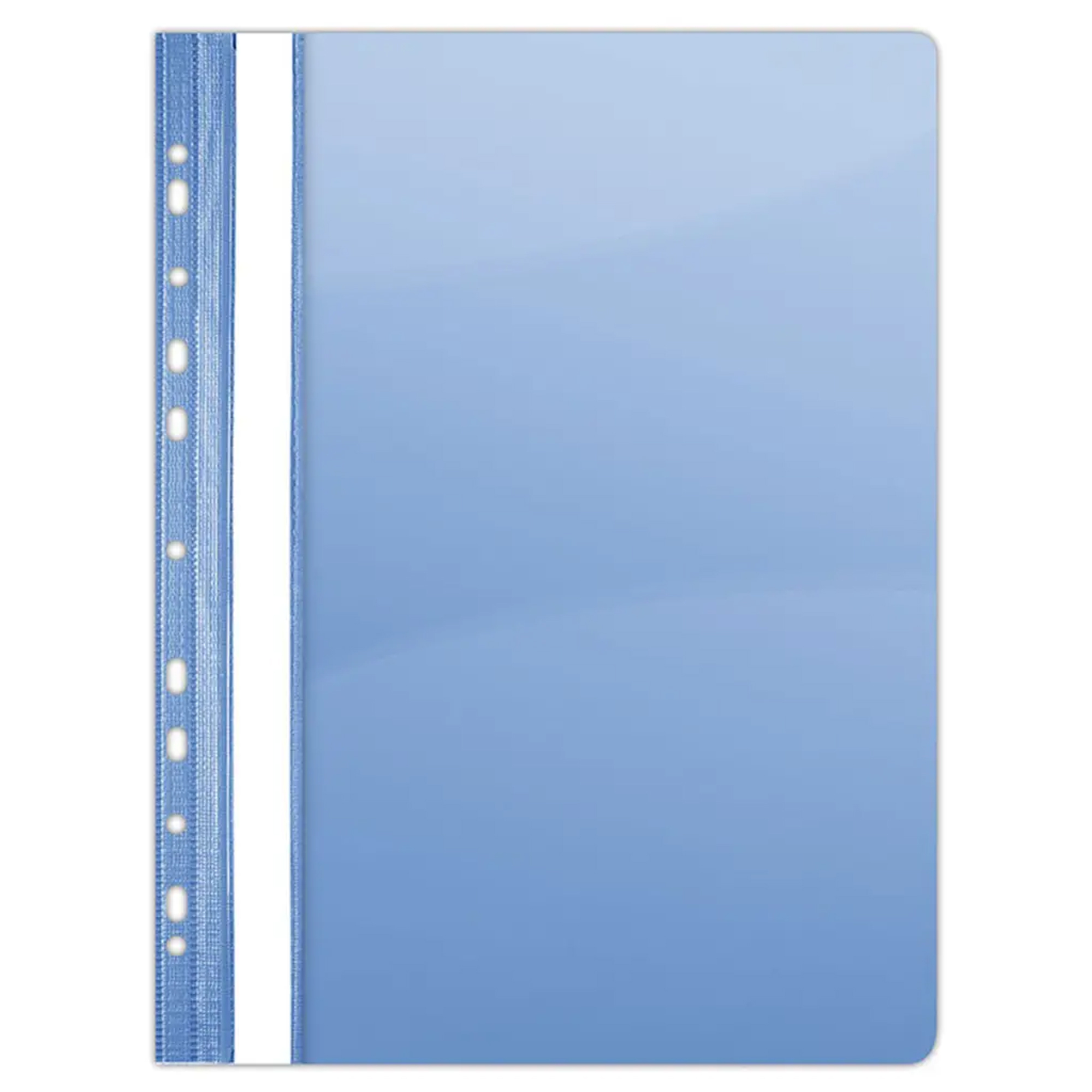 Predná strana je priehľadná a lesklá, čo umožňuje rýchlu orientáciu v obsahu bez potreby otvárania. Pozdĺž chrbta sa nachádza biely papierový zasúvací štítok, ktorý uľahčuje označenie a organizáciu dokumentov. Obal je vhodný na použitie v pákových aj krúžkových zakladačoch.