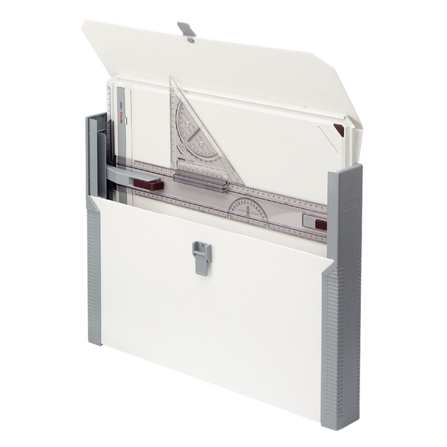 A párhuzamos vonalzó rögzítéssel és a praktikus L-rendszer lehetővé teszi a vonalak pontos vezetését a tábla teljes felületén. A rajzot megbízhatóan rögzíti két mágneses sín és egy sarkalatos fogantyú, miközben a vonalzó könnyen és simán mozog a vezető hornyában. A csomag tartalmaz egy védő bőröndöt, egy Rapid háromszöget és egy pár támaszt.