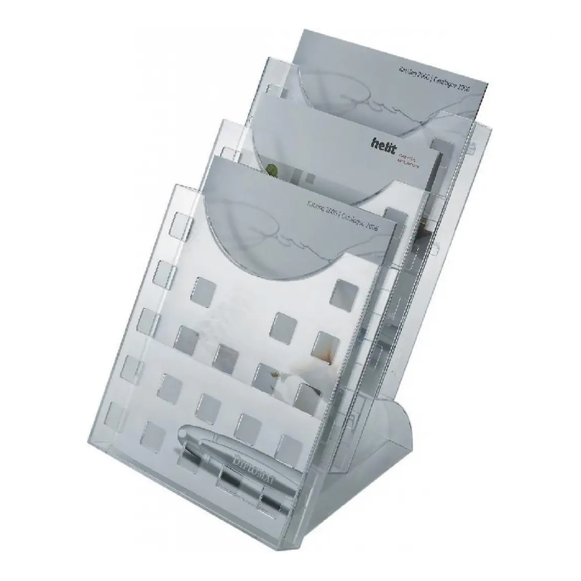 Jednoliate stojančeky vyrobené z číreho plastu pre buletiny a propagačné materiály pre formáty do A4. Priečinky: 4 Vnútorné priečinky (šxh): 230 x 32 mm