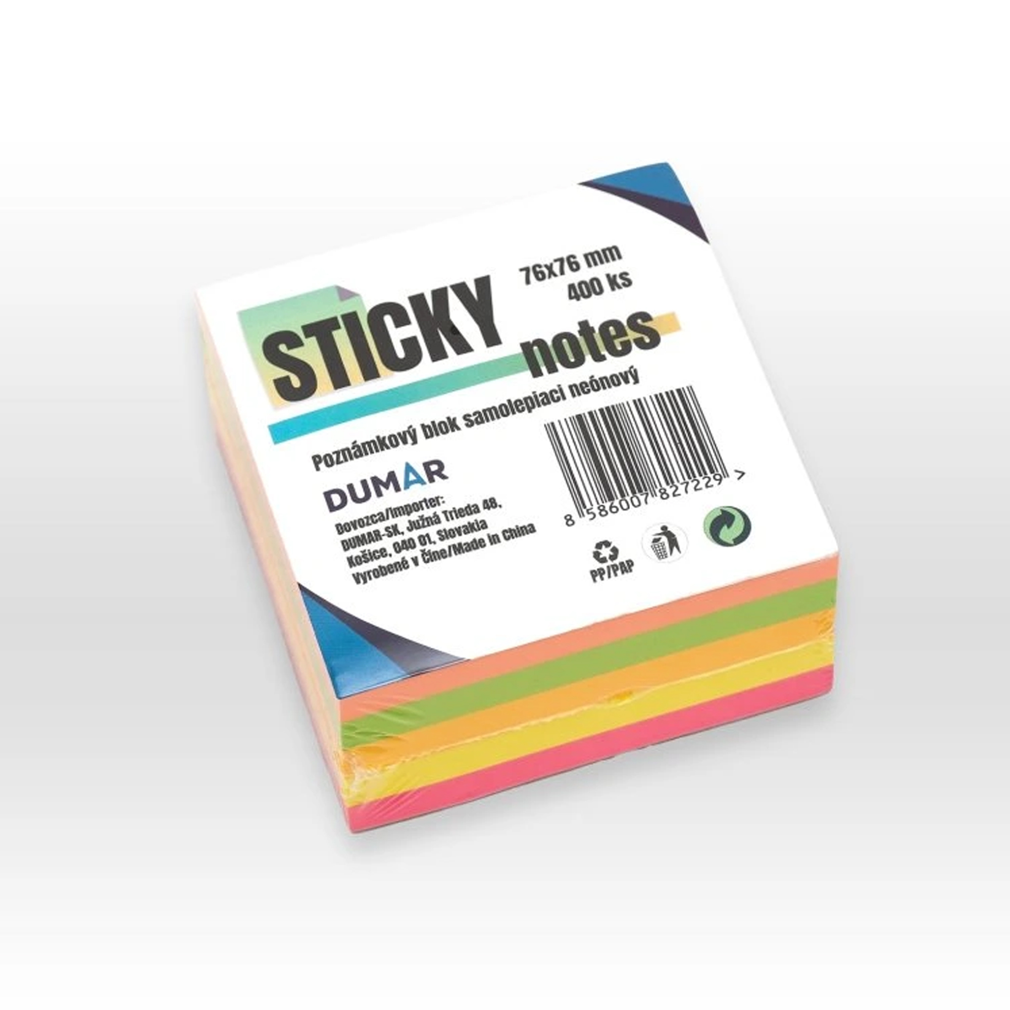 Kvalitné samolepiace bločky v neónových farbách, ktoré spoľahlivo držia na väčšine povrchov. Ich samolepiaca schopnosť zabezpečuje, že sa neodlepia. Po odlepení na povrchu nezanechávajú žiadne stopy a dajú sa opätovne nalepiť. S rozmermi 76 x 76 mm sú ideálne pre rôzne použitia, zviditeľnenie dôležitých poznámok či úloh. Počet listov 400ks v piatich farbách.