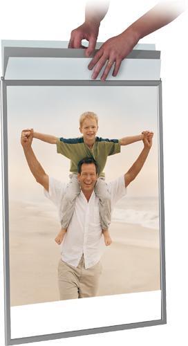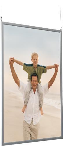 Praktická a lacná alternatíva pre obojstrannú prezentáciu. Ľahký 20 mm hliníkový rám, do ktorého jednoducho vložíte váš plagát, je skvelým riešením pre zavesenie pútača na strop. Slide in Frame je dodávaný s dvoma antireflexnými fóliami, ktoré chránia plagát pred UV žiarením a následnému vyblednutiu. Kompletné vybavenie obsahuje taktiež vnútorný spevňujúci panel a dva háčiky pre jednoduché zavesenie rámu. Oceľové závesné lanko nie je súčasťou balenia. Rozmer plagátu: A2 (420 x 594 mm)