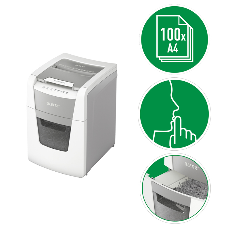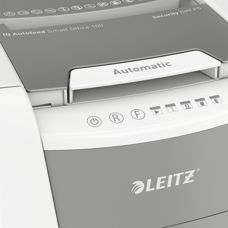 Plnoautomatická skartovačka na papier s mikrorezom DIN P-5 ( 2×15mm) od firmy Leitz s funkciou automatického podávania na 100 hárkov A4, otvor na manuálne plnenie až po 6 listoch 80 g/m2. Je veľmy inteligentná, potichu pracuje sama. Stačí vložíť stoh papiera (vrátane kancelárskych sponiek a sponiek do zošívačky), zatvorit veko a môžete ísť za svojou robotou. Ideálna na používanie v malej kancelárii. Má jedinečne čistú vyprázdňovaciu funkciu (rezací mechanizmus obráti chod po každom použití) na zabránenie zapadnutia skartovaného papiera za kôš pri jeho vysúvaní. Infračervený snímač plného koša a pri jeho naplnení na 80 % upozornenie na nutnosť vyprázdnenia, aby sa predišlo vzniku neporiadku. Technológia proti zaseknutiu papiera na nepretržitú skartáciu – pri vložení príliš veľkého množstva papiera sa automaticky zastaví a vysunie papier späť. Nepretržitý chod počas 20 minút, umožňujúci skartáciu plnej komory naraz, ECO režim spánku sa aktivuje po 3 minútach nečinnosti. Objemný 34l odnímateľný kôš, umožňujúci skartáciu plnej komory. Dotykové ovládanie – jednoduché a intuitívne na ľahké obsluhovanie. Skartuje aj kreditné karty, kancelárske sponky a sponky do zošívačiek. Záruka 2 + 1 rok (aj na rezací mechanizmus) – zaregistrujte sa a získate rok navyše. Rozmery 365 x 530 x 430mm. Váha 15,5kg
