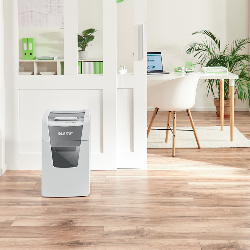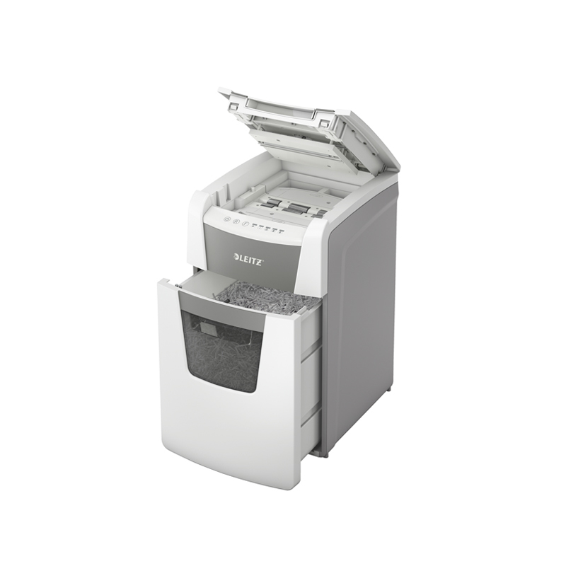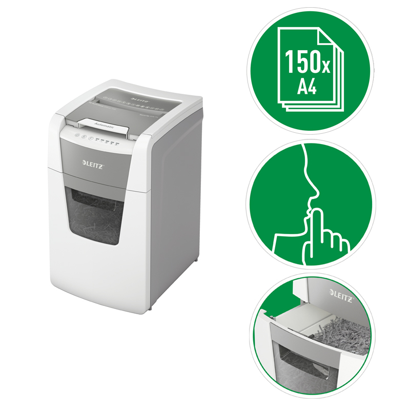 Plnoautomatická skartovačka na papier s mikrorezom DIN P-5 ( 2×15mm) od firmy Leitz s funkciou automatického podávania na 150 hárkov A4, otvor na manuálne plnenie až po 6 listoch 80 g/m2. Je veľmy inteligentná, potichu pracuje sama. Stačí vložíť stoh papiera (vrátane kancelárskych sponiek a sponiek do zošívačky), zatvorit veko a môžete ísť za svojou robotou. Ideálna na používanie v malej kancelárii. Má jedinečne čistú vyprázdňovaciu funkciu (rezací mechanizmus obráti chod po každom použití) na zabránenie zapadnutia skartovaného papiera za kôš pri jeho vysúvaní. Infračervený snímač plného koša a pri jeho naplnení na 80 % upozornenie na nutnosť vyprázdnenia, aby sa predišlo vzniku neporiadku. Technológia proti zaseknutiu papiera na nepretržitú skartáciu – pri vložení príliš veľkého množstva papiera sa automaticky zastaví a vysunie papier späť. Nepretržitý chod počas 30 minút, umožňujúci skartáciu plnej komory naraz, ECO režim spánku sa aktivuje po 3 minútach nečinnosti. Objemný 44l odnímateľný kôš, umožňujúci skartáciu plnej komory. Dotykové ovládanie – jednoduché a intuitívne na ľahké obsluhovanie. Skartuje aj kreditné karty, kancelárske sponky a sponky do zošívačiek. Záruka 2 + 1 rok (aj na rezací mechanizmus) – zaregistrujte sa a získate rok navyše. Rozmery 435 x 695 x 500mm. Váha 15,5kg