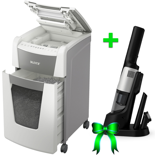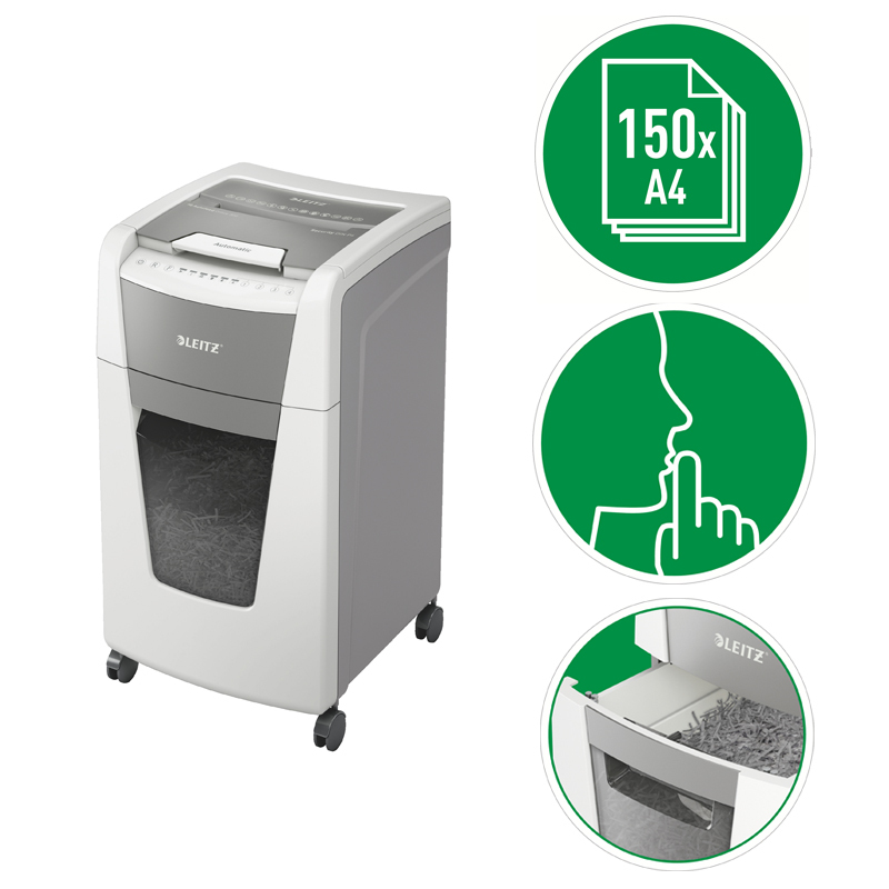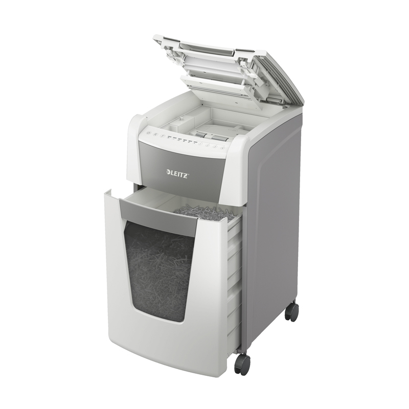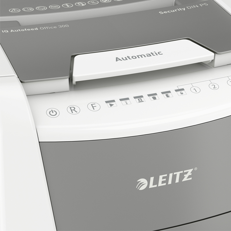Plnoautomatická skartovačka na papier s mikrorezom DIN P-5 ( 2×15mm) od firmy Leitz s funkciou automatického podávania na 300 hárkov A4, otvor na manuálne plnenie až po 8 listoch 80 g/m2. Je veľmy inteligentná, potichu pracuje sama. Stačí vložíť stoh papiera (vrátane kancelárskych sponiek a sponiek do zošívačky), zatvorit veko a môžete ísť za svojou robotou. Dotykové ovládanie – jednoduché a intuitívne na ľahké obsluhovanie, so zamykaním pomocou PIN kódu pre maximálne utajenie a bezpečnosť. Má jedinečne čistú vyprázdňovaciu funkciu (rezací mechanizmus obráti chod po každom použití) na zabránenie zapadnutia skartovaného papiera za kôš pri jeho vysúvaní. Infračervený snímač plného koša a pri jeho naplnení na 80 % upozornenie na nutnosť vyprázdnenia, aby sa predišlo vzniku neporiadku. Technológia proti zaseknutiu papiera na nepretržitú skartáciu – pri vložení príliš veľkého množstva papiera sa automaticky zastaví a vysunie papier späť. Nepretržitý chod počas 60 minút, umožňujúci skartáciu plnej komory naraz, ECO režim spánku sa aktivuje po 3 minútach nečinnosti. Objemný 60l odnímateľný kôš, umožňujúci skartáciu plnej komory. Skartuje aj kreditné karty, kancelárske sponky a sponky do zošívačiek. Záruka 2 + 1 rok (aj na rezací mechanizmus) – zaregistrujte sa a získate rok navyše. Rozmery 465 x 735 x 415mm. Váha 22,6kg