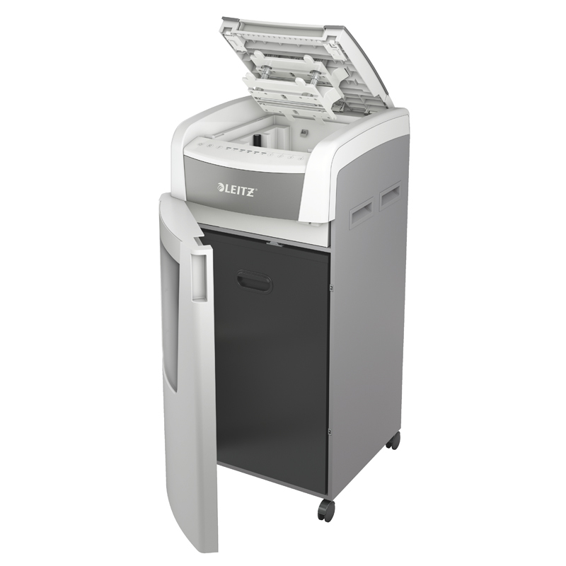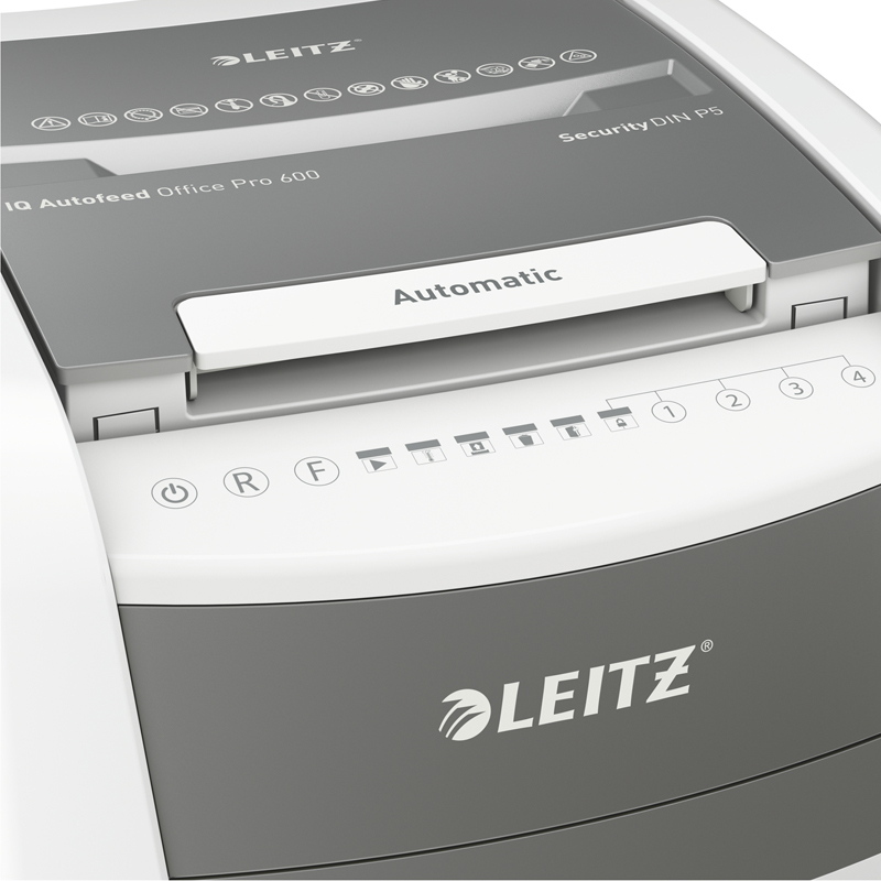 Plnoautomatická skartovačka na papier s mikrorezom DIN P-5 ( 2×15mm) od firmy Leitz s funkciou automatického podávania na 600 hárkov A4, otvor na manuálne plnenie až po 10 listoch 80 g/m2. Je veľmy inteligentná, potichu pracuje sama. Stačí vložíť stoh papiera (vrátane kancelárskych sponiek a sponiek do zošívačky), zatvorit veko a môžete ísť za svojou robotou. Dotykové ovládanie – jednoduché a intuitívne na ľahké obsluhovanie, so zamykaním pomocou PIN kódu pre maximálne utajenie a bezpečnosť. Má jedinečne čistú vyprázdňovaciu funkciu (rezací mechanizmus obráti chod po každom použití) na zabránenie zapadnutia skartovaného papiera za kôš pri jeho vysúvaní. Infračervený snímač plného koša a pri jeho naplnení na 80 % upozornenie na nutnosť vyprázdnenia, aby sa predišlo vzniku neporiadku. Technológia proti zaseknutiu papiera na nepretržitú skartáciu – pri vložení príliš veľkého množstva papiera sa automaticky zastaví a vysunie papier späť. Nepretržitý chod počas 240 minút, umožňujúci skartáciu plnej komory naraz, ECO režim spánku sa aktivuje po 3 minútach nečinnosti. Objemný 110l odnímateľný kôš, umožňujúci skartáciu plnej komory. Skartuje aj kreditné karty, kancelárske sponky a sponky do zošívačiek. Záruka 2 + 1 rok (aj na rezací mechanizmus) – zaregistrujte sa a získate rok navyše. Rozmery 675 x 1130 x 750 mm. Váha 45,5kg