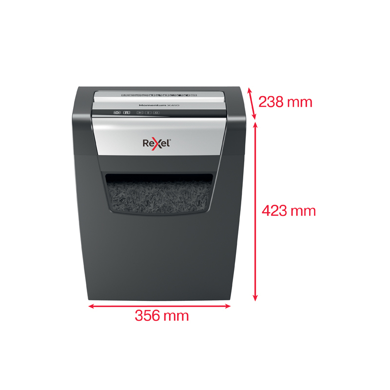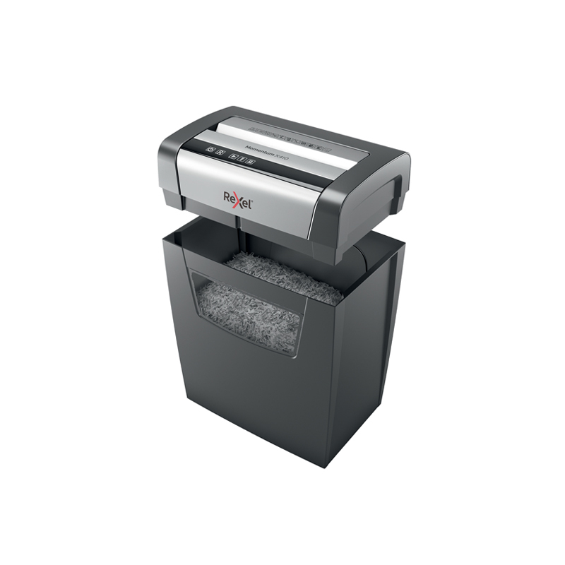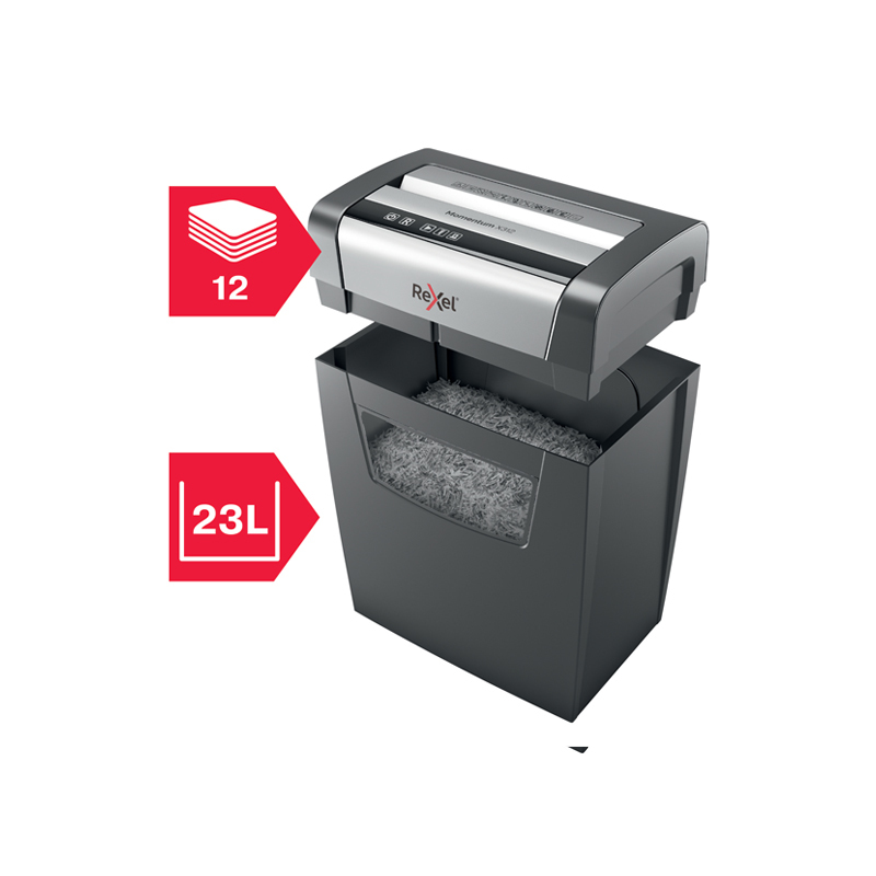 .Nezastaviteľný skartovač! Rexel Momentum X312 skartuje až 12 hárkov naraz a vydrží v nepretržitom chode 6 minút. Tichý chod pre minimálne vyrušovanie okolia. Technológia proti zaseknutiu papiera garantuje neprerušované skartovanie. Krížový rez na úrovni zabezpečenia P3 reže papier na časti s veľkosťou 5 × 42 mm. Technológia Anti-jam automaticky zastaví a spustí spätný chod pri vložení príliš veľkého množstva papiera. Dotykové ovládanie pre jednoduché a intuitívne ovládanie. Objemný kôš s kapacitou 23 l pojme 200 hárkov A4. Váha 6,5kg. Rozmery 356 x 423 x 238 (mm)