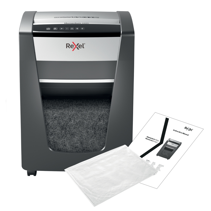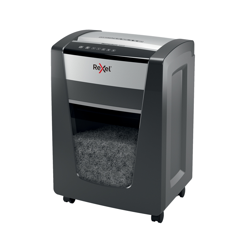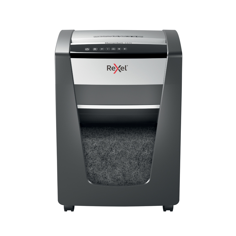 Nezastaviteľný skartovač! Rexel Momentum X420 skartuje až 20 hárkov naraz a vydrží v nepretržitom chode 4 hodiny, vhodný na použitie v kanceláriách. Tichý chod pre minimálne vyrušovanie okolia. Technológia proti zaseknutiu papiera garantuje neprerušované skartovanie. Krížový rez na úrovni zabezpečenia P4 reže papier na mikročasti s veľkosťou 4 x 40 mm, takže sa ich vojde viac do odpadového koša, než sa zaplní. Dotykové ovládanie pre jednoduché a intuitívne ovládanie. Objemný kôš s kapacitou 30 l pojme 275 hárkov A4.. Váha 22kg. Rozmery 406 x 594 x 320 (mm)