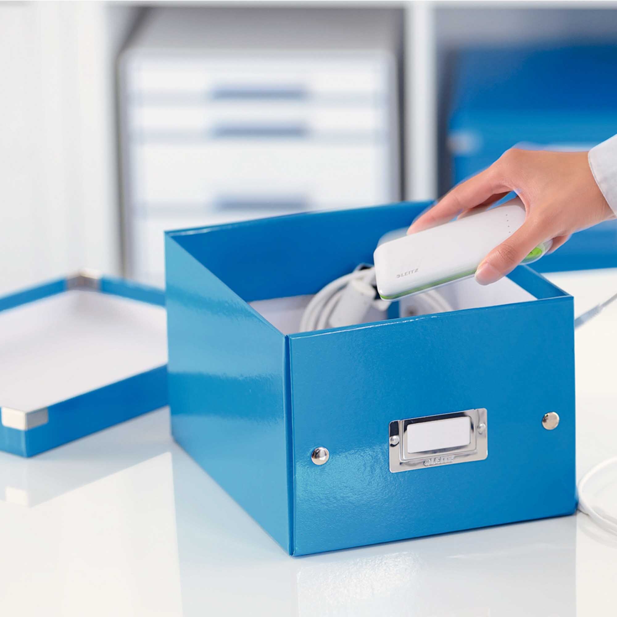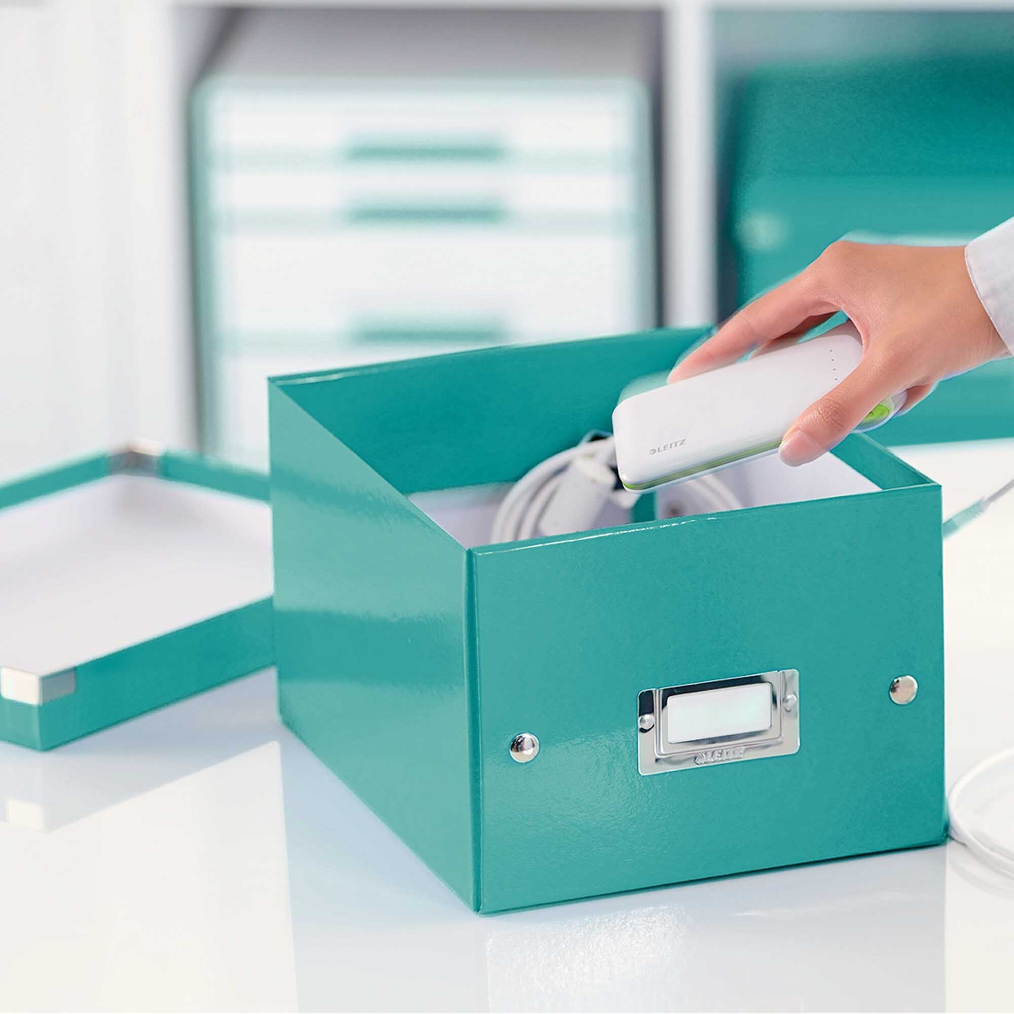 Stredne velká ľadová modrá štýlová škatuľa na prehľadné ukladanie drobností. Lesklé PP vyhotovenie vytvára prvotriedny vzhľad škatule a umožňuje dlhodobé používanie a jednoduché utieranie prachu. Má kvalitné kovové rámčeky na popis obsahu s kontrastnými bielymi štítkami. Moderný dizajn, ktorý sa vyníma v každej kancelárii. Dodajte svojmu pracovnému miestu alebo domácnosti farbu a skombinujte škatuľu s ostatnými kancelárskymi výrobkami z radu Leitz WOW. Vyrobené z hrubého kartónu s laminovaným povrchom a kovovými rohmi pre spoľahlivú ochranu. Patentovaná konštrukcia zaručuje stohovateľnosť a vyššiu ochranu proti náhodnému rozloženiu škatule pri prenášaní ťažkých vecí. Premyslená skladacia konštrukcia na rýchle a jednoduché zloženie bez nutnosti použitia skrutiek. Možnosť opätovného rozloženia a uloženie do veka keď škatuľu práve nepotrebujete. Váha 0,57 kg. Rozmery 206 x 147 x 352 (mm).