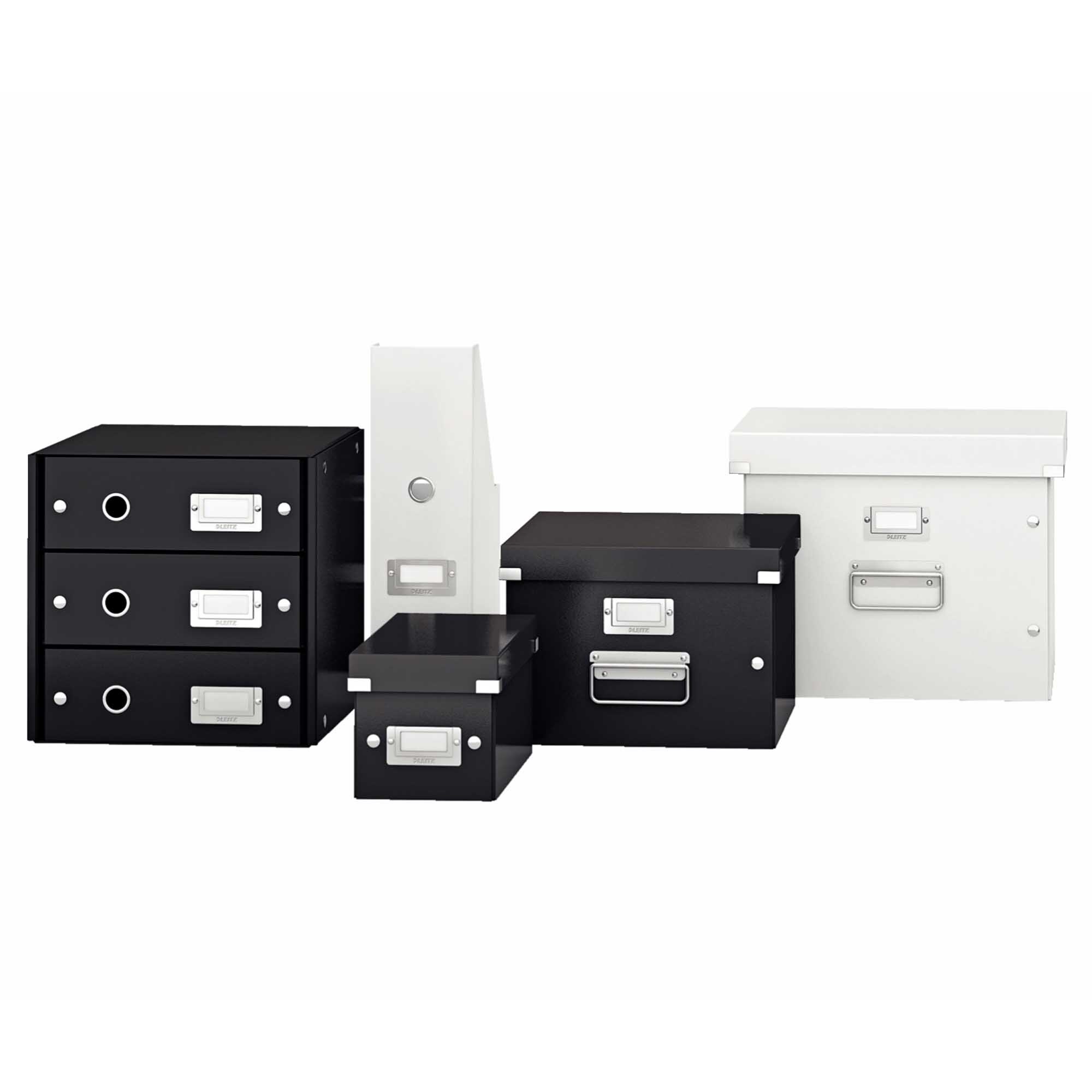 Univerzálna čierna štýlová škatuľa na prehľadné ukladanie dokumentov A4, alebo napr. na rozrobené štrikovanie.. Lesklé PP vyhotovenie vytvára prvotriedny vzhľad škatule a umožňuje dlhodobé používanie a jednoduché utieranie prachu. Má kvalitné kovové rámčeky na popis obsahu s kontrastnými bielymi štítkami. Moderný dizajn, ktorý sa vyníma v každej kancelárii. Dodajte svojmu pracovnému miestu alebo domácnosti farbu a skombinujte škatuľu s ostatnými kancelárskymi výrobkami z radu Leitz WOW. Vyrobené z hrubého kartónu s laminovaným povrchom a kovovými rohmi pre spoľahlivú ochranu. Má pevné kovové držadlá na pohodlnú manipuláciu a prenášanie. Patentovaná konštrukcia zaručuje stohovateľnosť a vyššiu ochranu proti náhodnému rozloženiu škatule pri prenášaní ťažkých vecí. Premyslená skladacia konštrukcia na rýchle a jednoduché zloženie bez nutnosti použitia skrutiek. Možnosť opätovného rozloženia a uloženie do veka keď škatuľu práve nepotrebujete. Váha 0,9 kg. Rozmery 281 x 200 x 370 (mm).