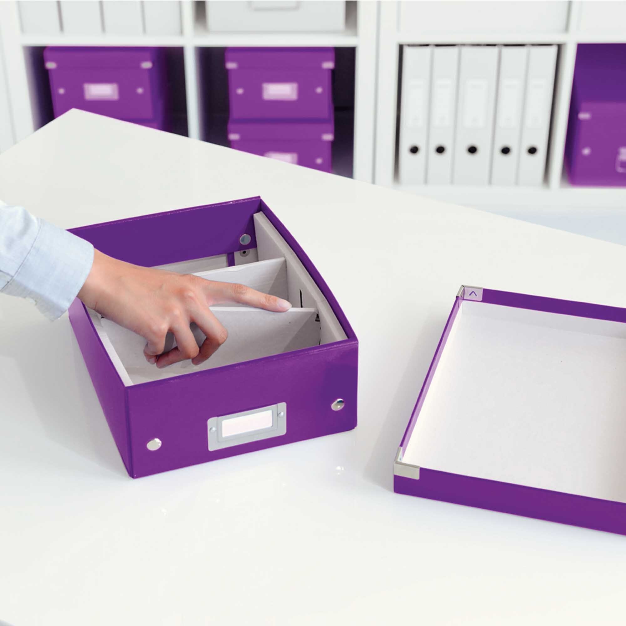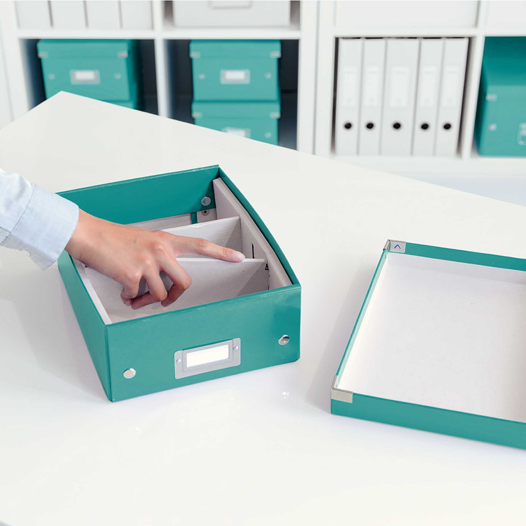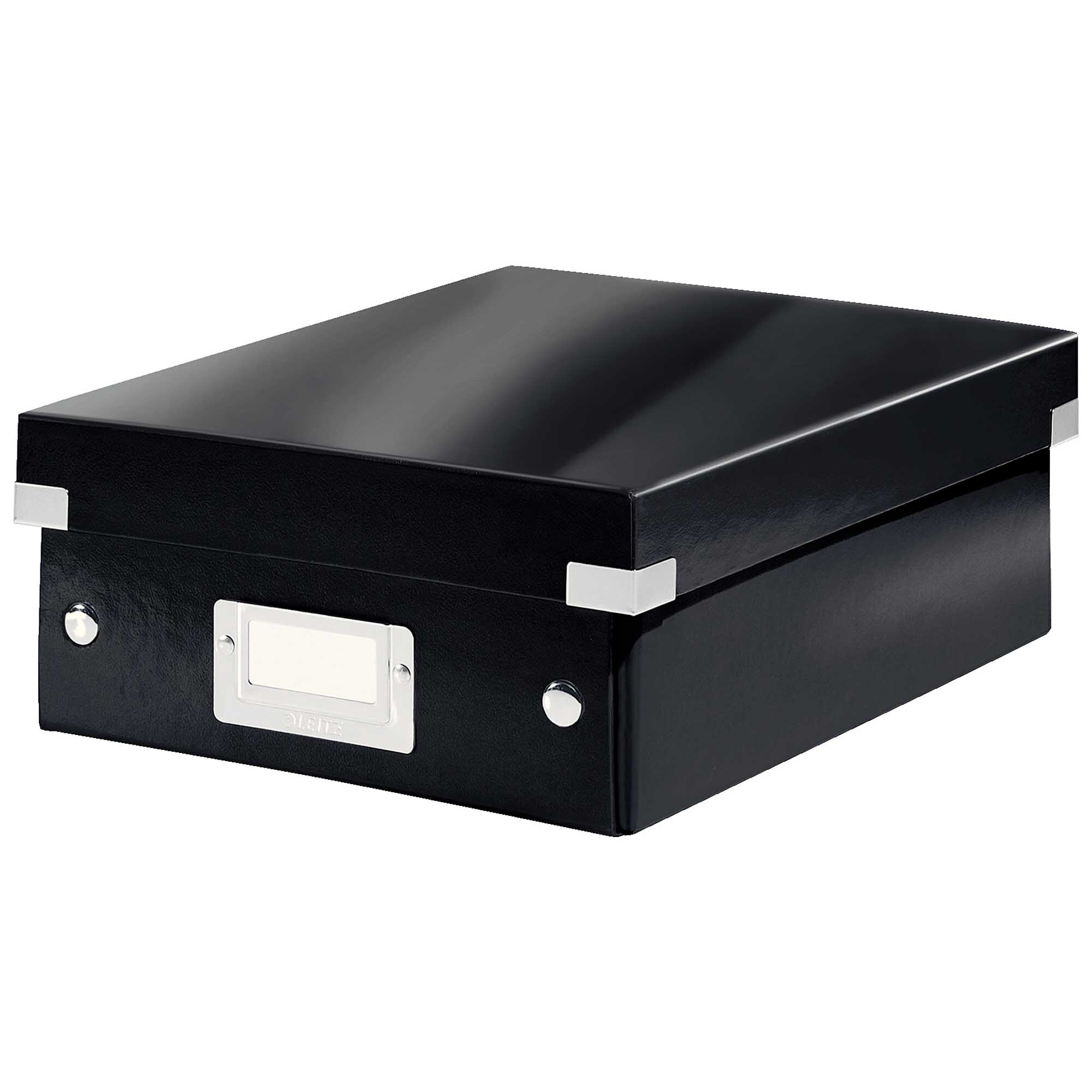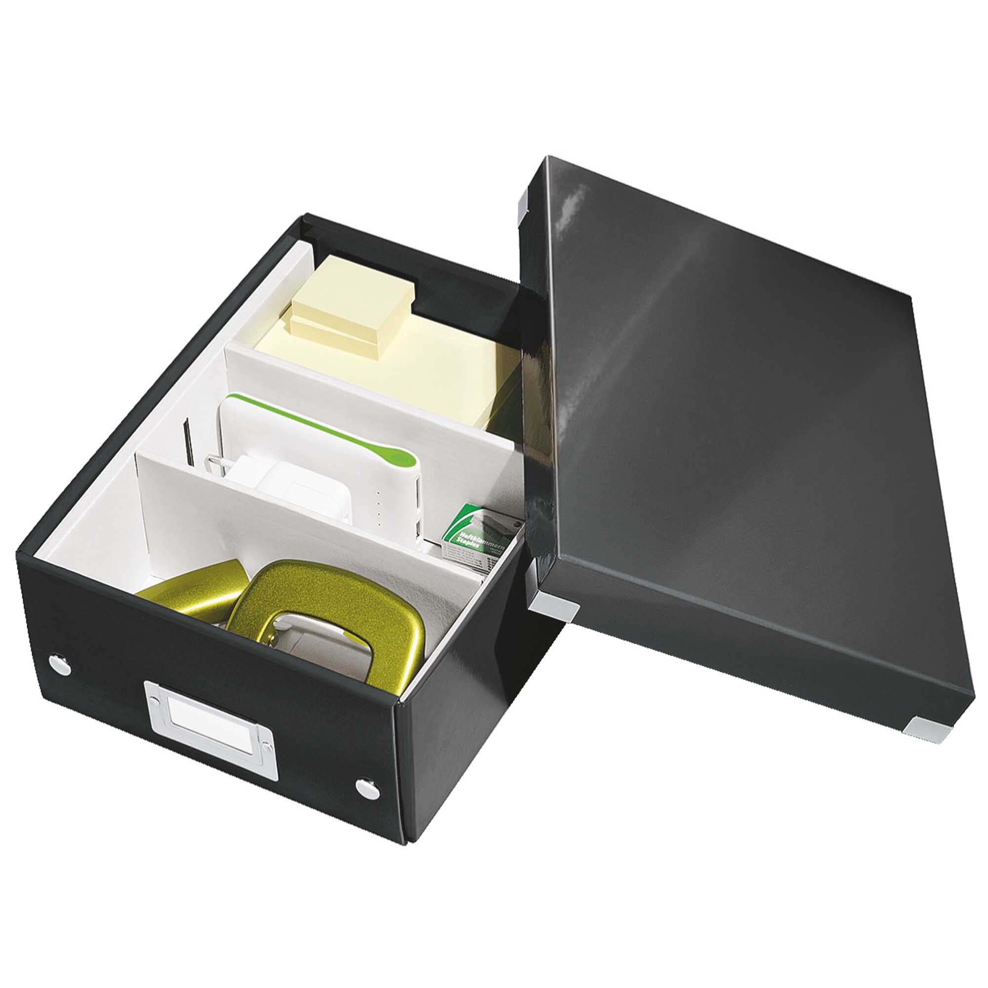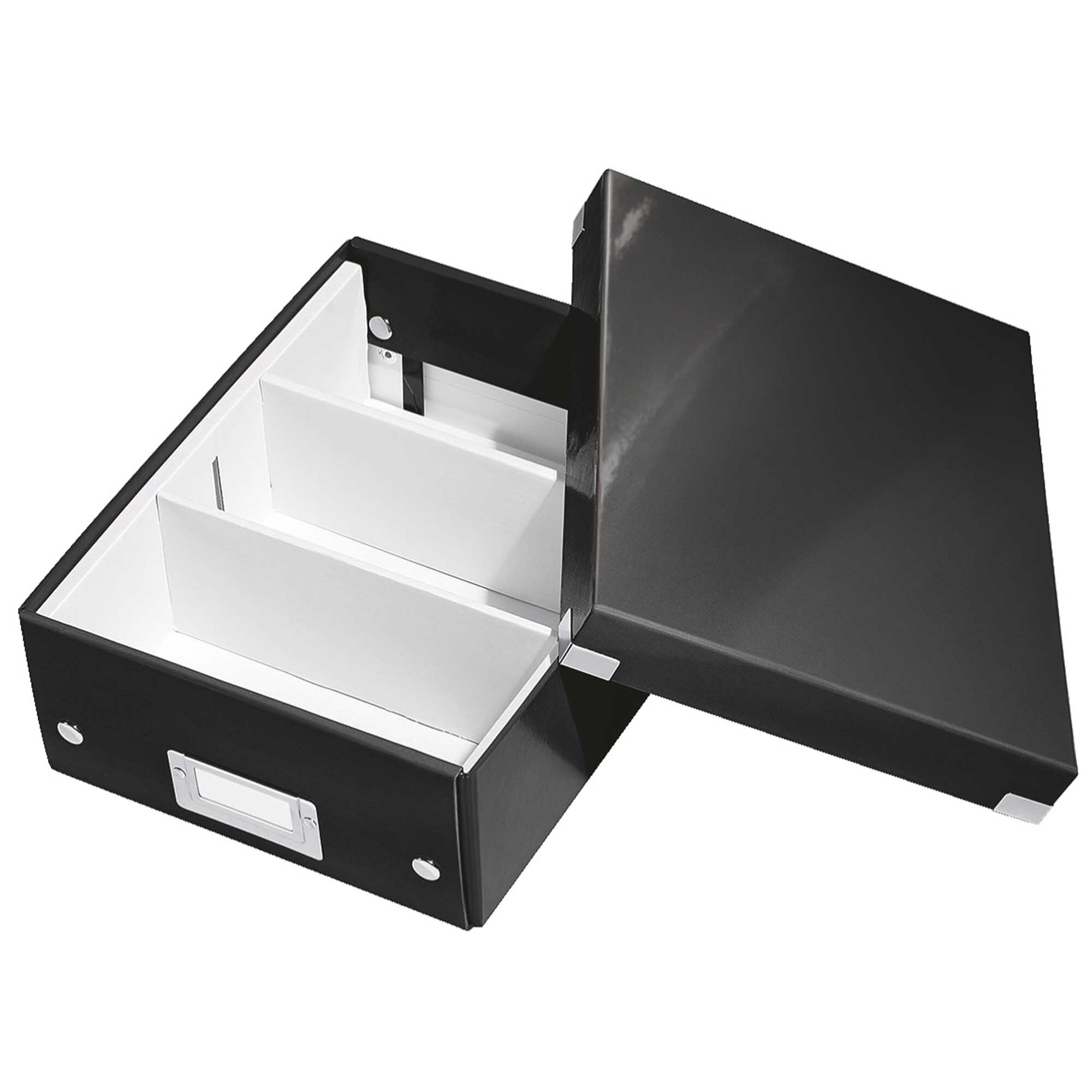 Atraktívna a štýlová čierna škatuľa s 2 – 3 flexibilnými priehradkami. Vhodná na prehľadné a efektívne riešenie, ukladanie a organizáciu predmetov. Pomocou priložených priehradiek škatuľu Leitz Click & Store môžete rozdeliť podľa potreby na 2 alebo 3 časti. Zabránite tak zamotaniu káblov od nabíjačiek alebo pomiešaniu fotiek a ďalších drobností. Lesklé PP vyhotovenie vytvára prvotriedny vzhľad škatule a umožňuje dlhodobé používanie a jednoduché utieranie prachu. Má kvalitné kovové rámčeky s kontrastnými bielymi štítkami na jednoduché rozpoznanie obsahu škatule. Moderný dizajn, ktorý sa bude skvele vynímať v každej kancelárii. Dodajte svojmu pracovnému miestu alebo domácnosti farbu a skombinujte škatuľu s ostatnými kancelárskymi výrobkami z radu Leitz WOW. Vyrobené z hrubého kartónu s laminovaným povrchom a kovovými rohmi pre spoľahlivú ochranu. Patentovaná konštrukcia zaručuje stohovateľnosť, vyššiu ochranu proti náhodnému rozloženiu škatule pri prenášaní ťažkých vecí. Premyslená skladacia konštrukcia na rýchle a jednoduché zloženie bez nutnosti použitia skrutiek. Možnosť opätovného rozloženia a uloženie do veka keď škatuľu práve nepotrebujete. Váha 0,58 kg. Rozmery 220 x 100 x 282 (mm).