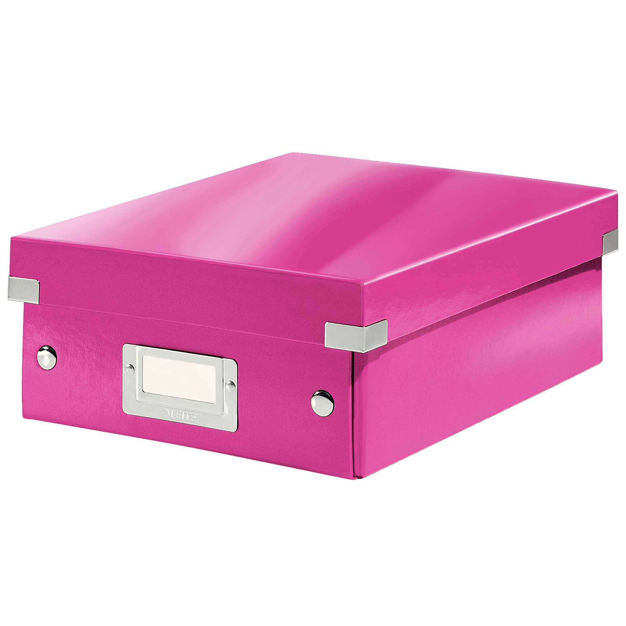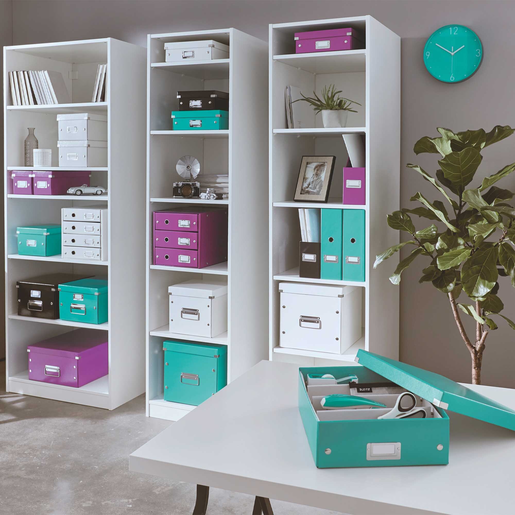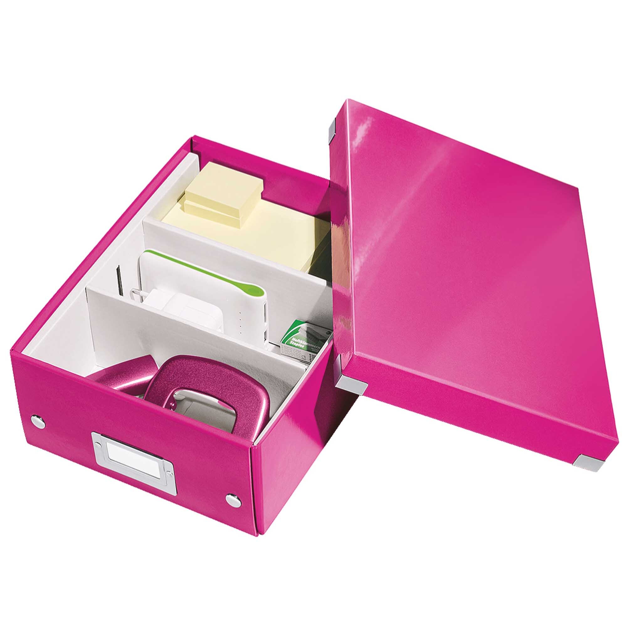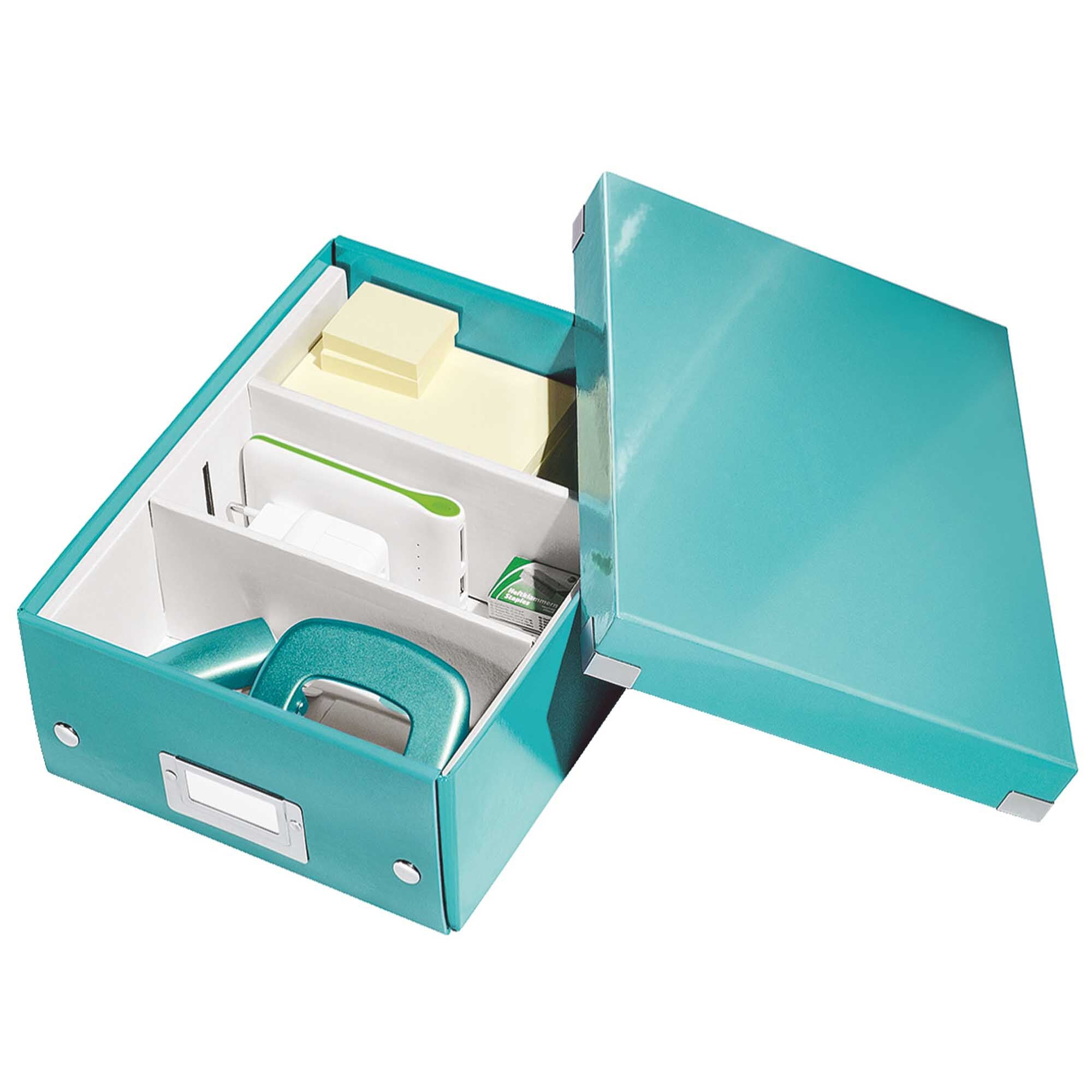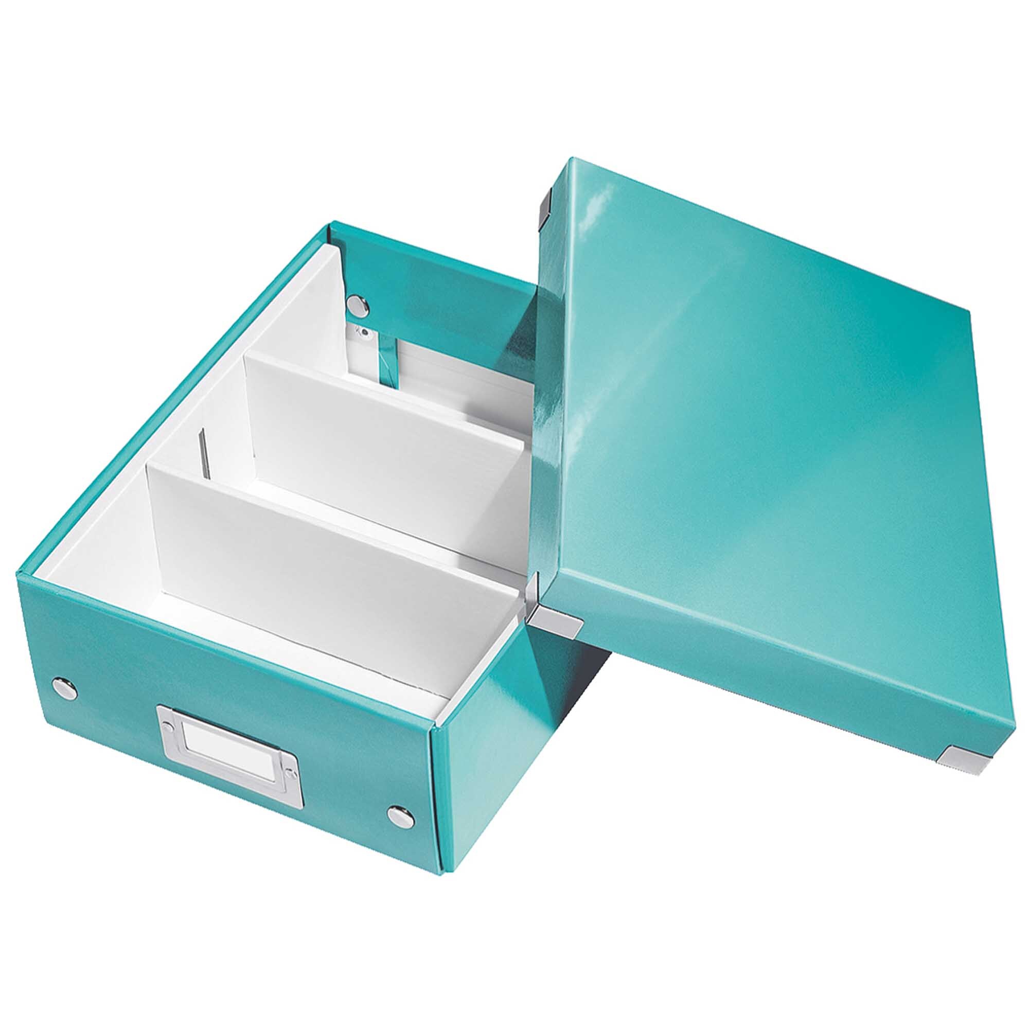 Atraktívna a štýlová čierna škatuľa s 2 – 3 flexibilnými priehradkami. Vhodná na prehľadné a efektívne riešenie, ukladanie a organizáciu predmetov. Pomocou priložených priehradiek škatuľu Leitz Click & Store môžete rozdeliť podľa potreby na 2 alebo 3 časti. Zabránite tak zamotaniu káblov od nabíjačiek alebo pomiešaniu fotiek a ďalších drobností. Lesklé PP vyhotovenie vytvára prvotriedny vzhľad škatule a umožňuje dlhodobé používanie a jednoduché utieranie prachu. Má kvalitné kovové rámčeky s kontrastnými bielymi štítkami na jednoduché rozpoznanie obsahu škatule. Moderný dizajn, ktorý sa bude skvele vynímať v každej kancelárii. Dodajte svojmu pracovnému miestu alebo domácnosti farbu a skombinujte škatuľu s ostatnými kancelárskymi výrobkami z radu Leitz WOW. Vyrobené z hrubého kartónu s laminovaným povrchom a kovovými rohmi pre spoľahlivú ochranu. Patentovaná konštrukcia zaručuje stohovateľnosť, vyššiu ochranu proti náhodnému rozloženiu škatule pri prenášaní ťažkých vecí. Premyslená skladacia konštrukcia na rýchle a jednoduché zloženie bez nutnosti použitia skrutiek. Možnosť opätovného rozloženia a uloženie do veka keď škatuľu práve nepotrebujete. Váha 0,58 kg. Rozmery 220 x 100 x 282 (mm).