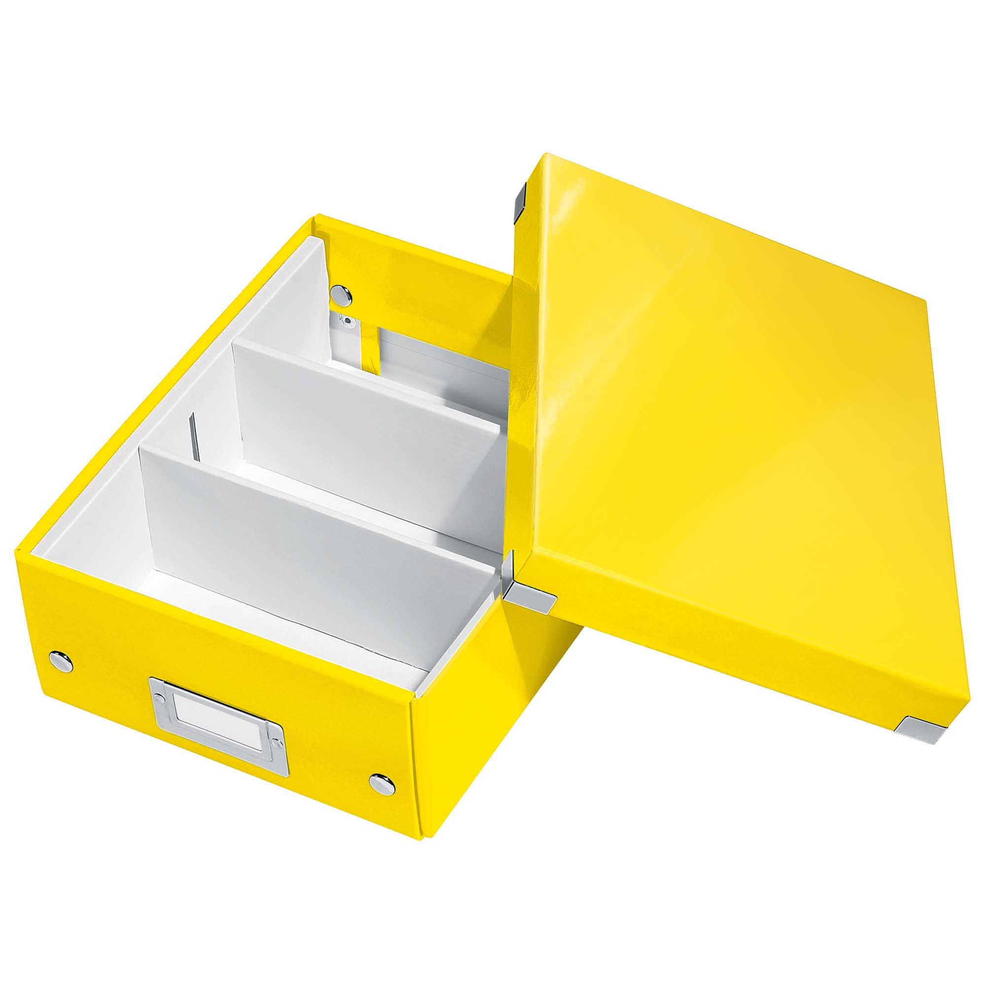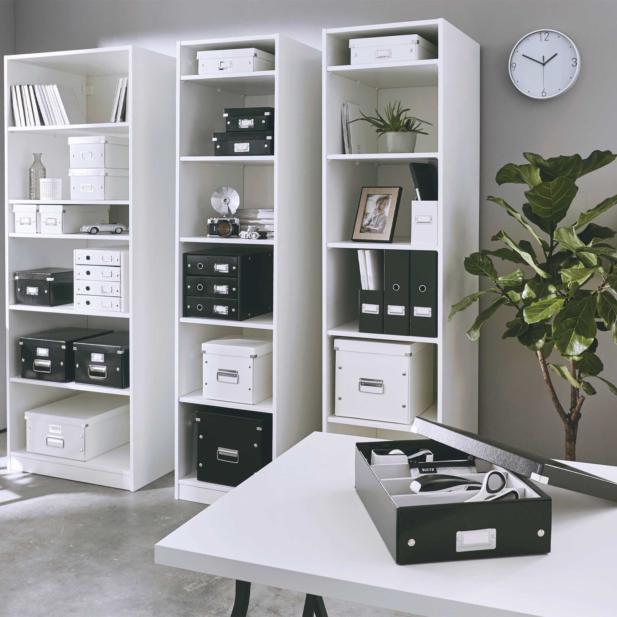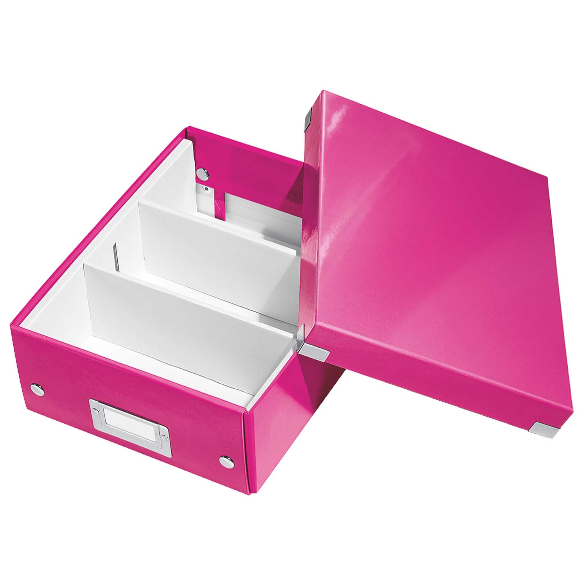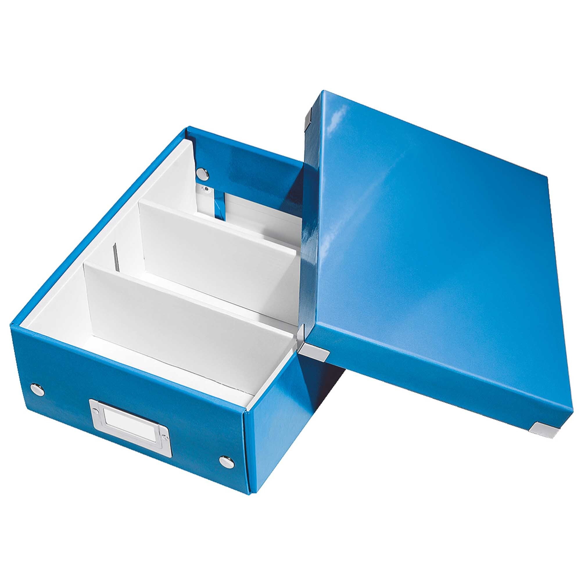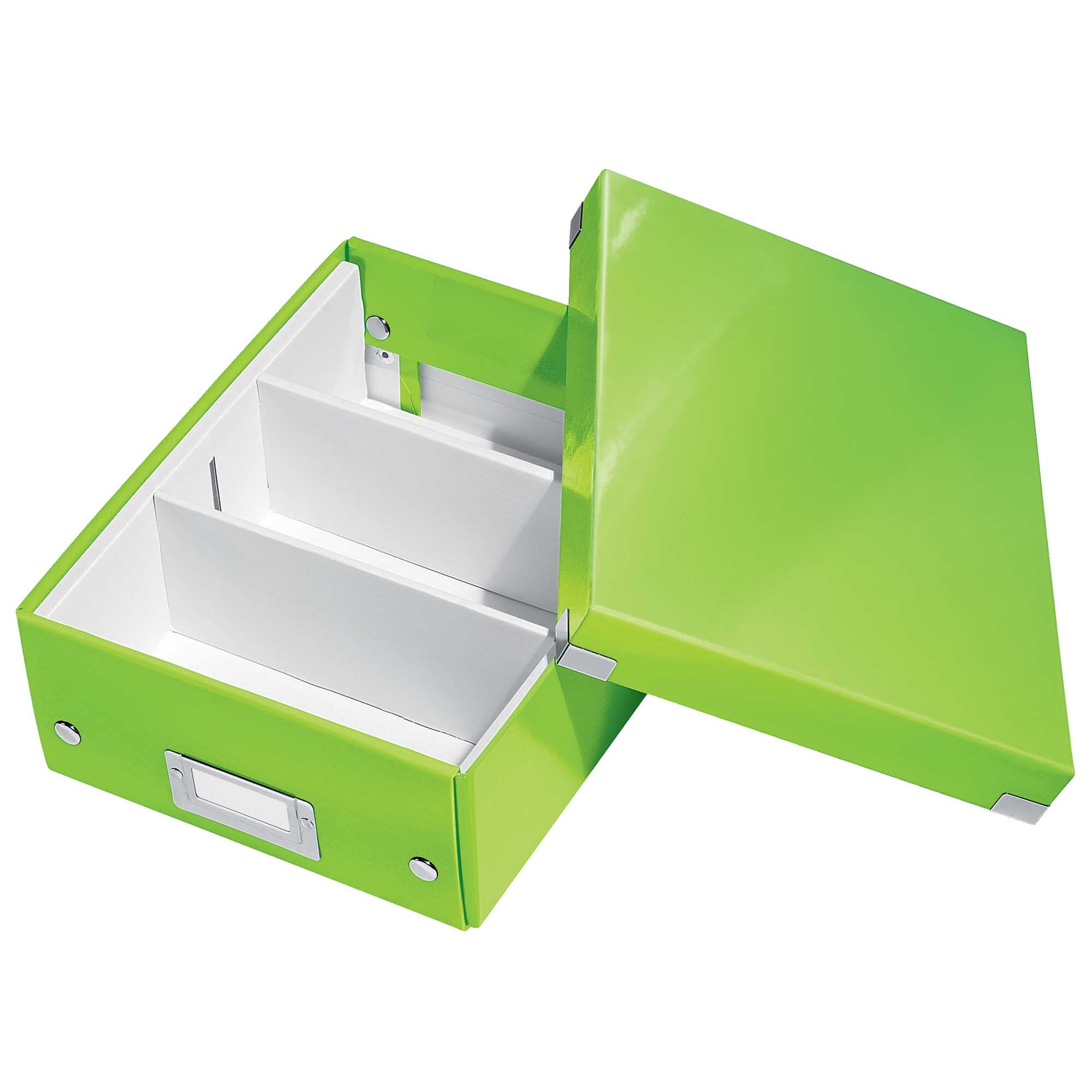 Atraktívna a štýlová čierna škatuľa s 2 – 3 flexibilnými priehradkami. Vhodná na prehľadné a efektívne riešenie, ukladanie a organizáciu predmetov. Pomocou priložených priehradiek škatuľu Leitz Click & Store môžete rozdeliť podľa potreby na 2 alebo 3 časti. Zabránite tak zamotaniu káblov od nabíjačiek alebo pomiešaniu fotiek a ďalších drobností. Lesklé PP vyhotovenie vytvára prvotriedny vzhľad škatule a umožňuje dlhodobé používanie a jednoduché utieranie prachu. Má kvalitné kovové rámčeky s kontrastnými bielymi štítkami na jednoduché rozpoznanie obsahu škatule. Moderný dizajn, ktorý sa bude skvele vynímať v každej kancelárii. Dodajte svojmu pracovnému miestu alebo domácnosti farbu a skombinujte škatuľu s ostatnými kancelárskymi výrobkami z radu Leitz WOW. Vyrobené z hrubého kartónu s laminovaným povrchom a kovovými rohmi pre spoľahlivú ochranu. Patentovaná konštrukcia zaručuje stohovateľnosť, vyššiu ochranu proti náhodnému rozloženiu škatule pri prenášaní ťažkých vecí. Premyslená skladacia konštrukcia na rýchle a jednoduché zloženie bez nutnosti použitia skrutiek. Možnosť opätovného rozloženia a uloženie do veka keď škatuľu práve nepotrebujete. Váha 0,58 kg. Rozmery 220 x 100 x 282 (mm).