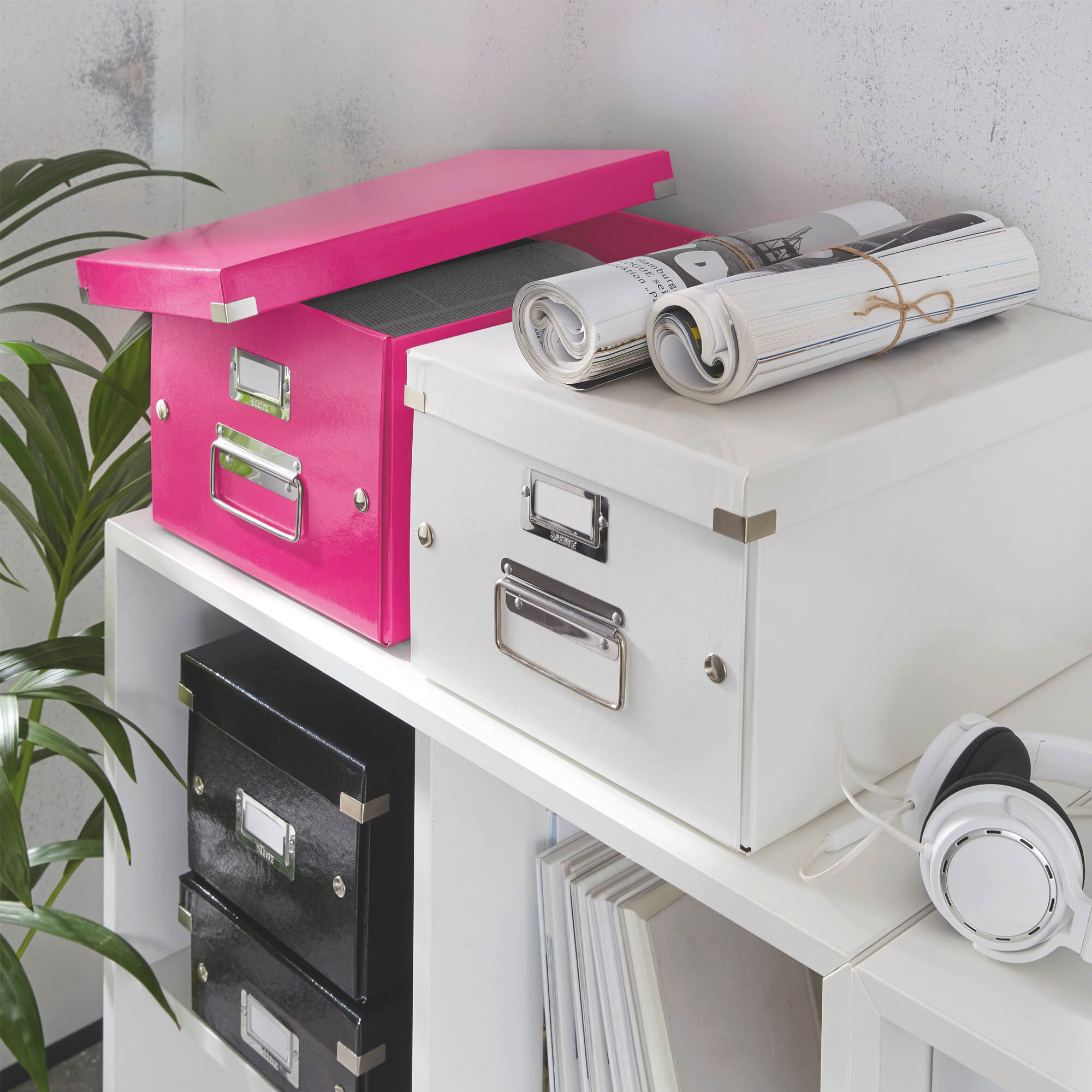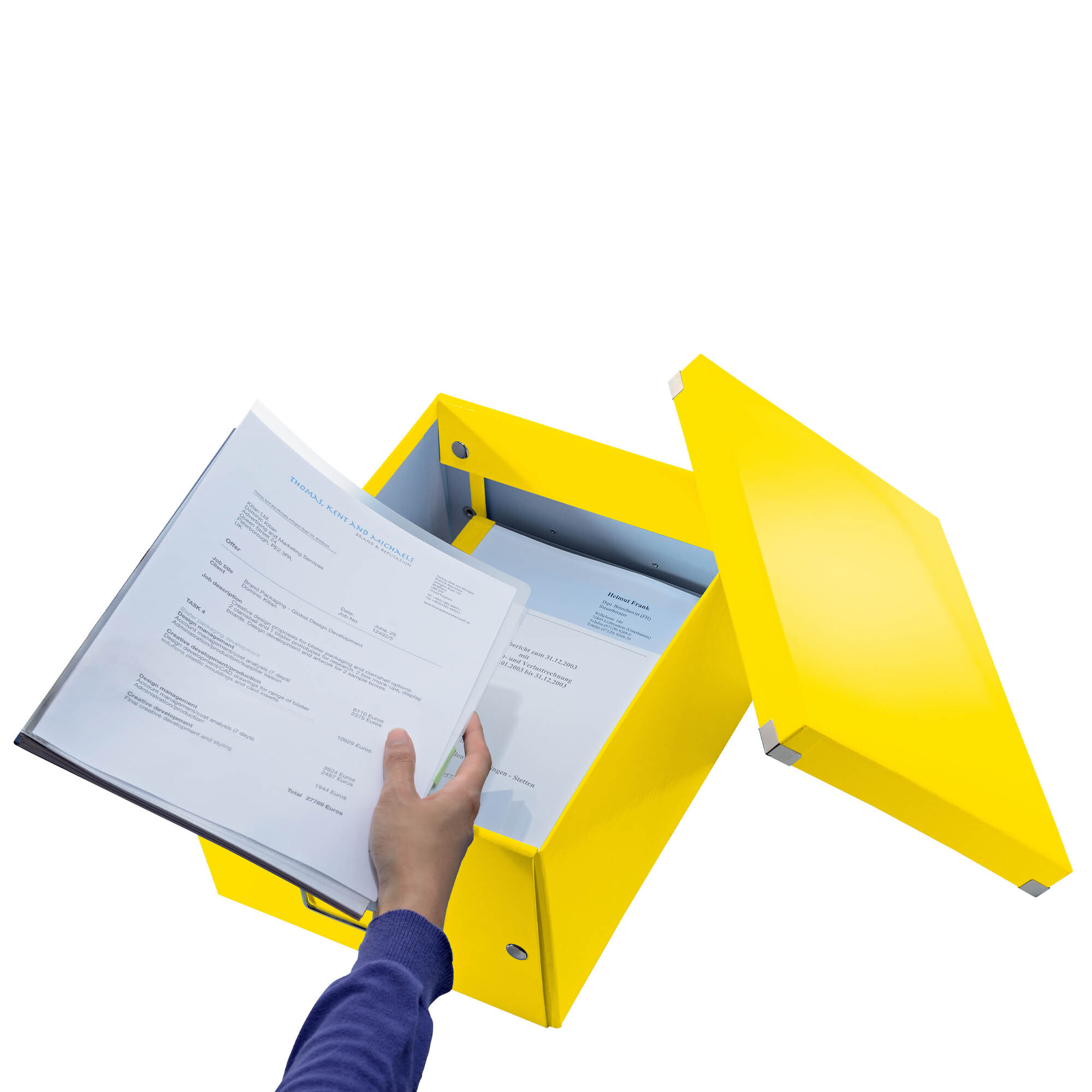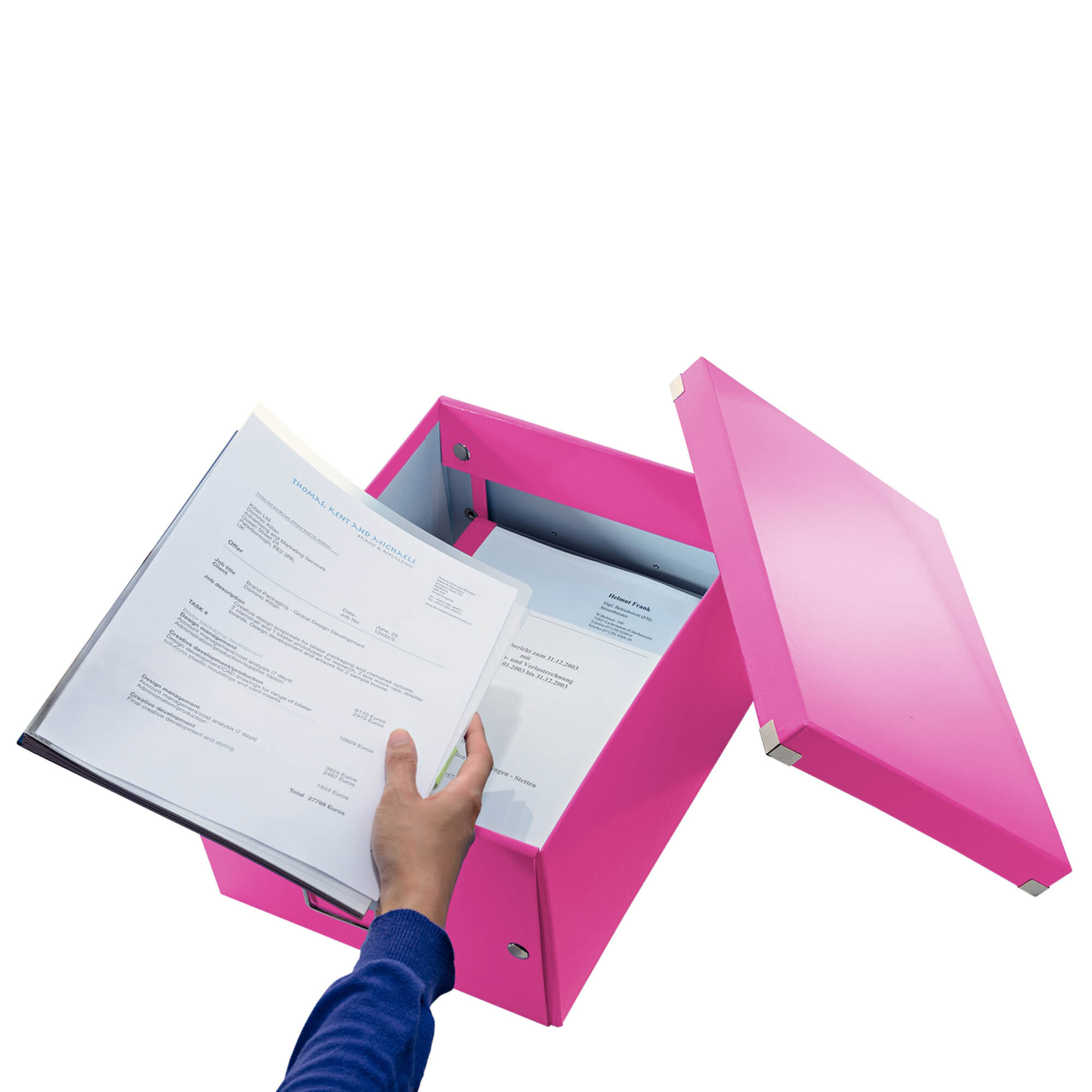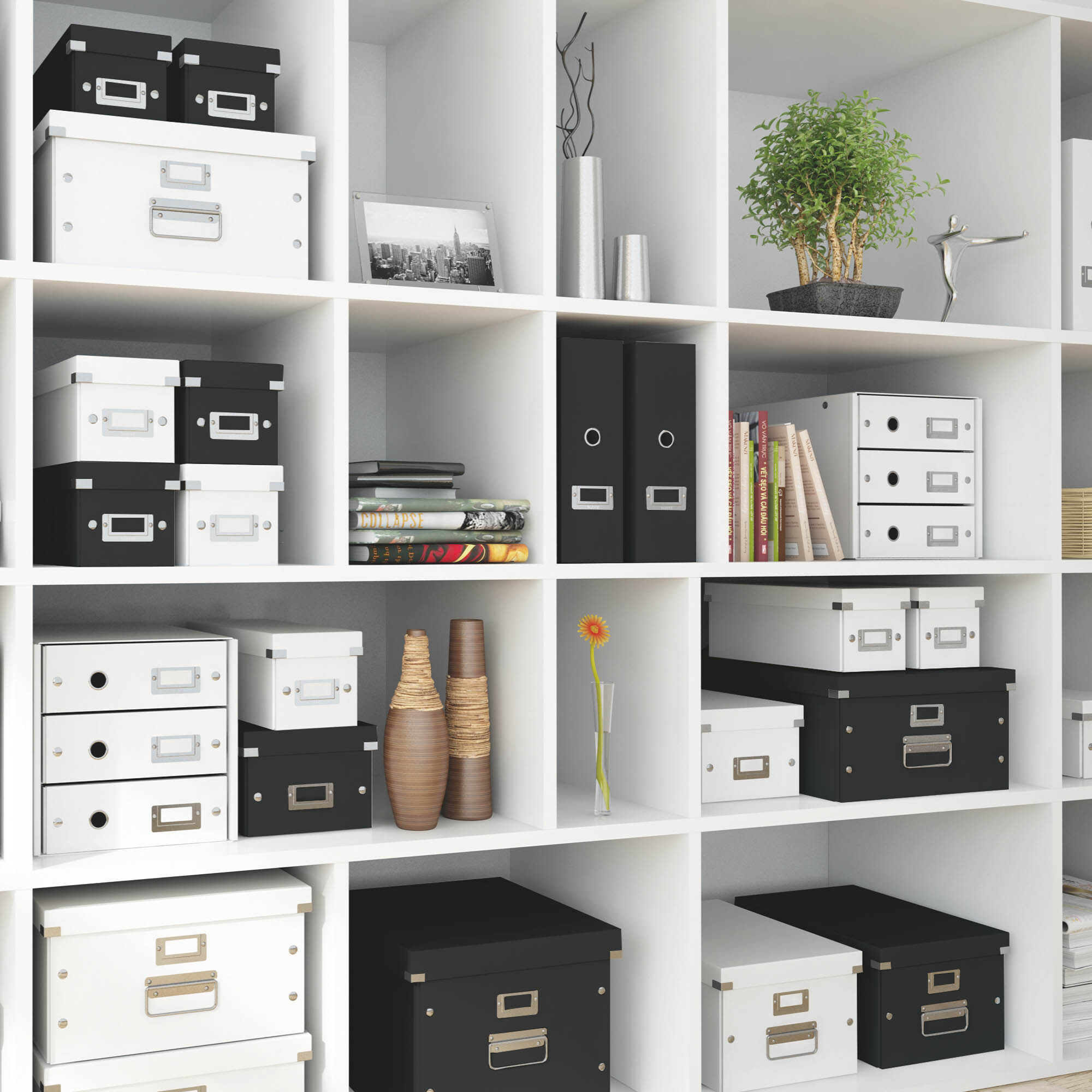 Univerzálna čierna štýlová škatuľa na prehľadné ukladanie dokumentov A4, alebo napr. na rozrobené štrikovanie.. Lesklé PP vyhotovenie vytvára prvotriedny vzhľad škatule a umožňuje dlhodobé používanie a jednoduché utieranie prachu. Má kvalitné kovové rámčeky na popis obsahu s kontrastnými bielymi štítkami. Moderný dizajn, ktorý sa vyníma v každej kancelárii. Dodajte svojmu pracovnému miestu alebo domácnosti farbu a skombinujte škatuľu s ostatnými kancelárskymi výrobkami z radu Leitz WOW. Vyrobené z hrubého kartónu s laminovaným povrchom a kovovými rohmi pre spoľahlivú ochranu. Má pevné kovové držadlá na pohodlnú manipuláciu a prenášanie. Patentovaná konštrukcia zaručuje stohovateľnosť a vyššiu ochranu proti náhodnému rozloženiu škatule pri prenášaní ťažkých vecí. Premyslená skladacia konštrukcia na rýchle a jednoduché zloženie bez nutnosti použitia skrutiek. Možnosť opätovného rozloženia a uloženie do veka keď škatuľu práve nepotrebujete. Váha 0,9 kg. Rozmery 281 x 200 x 370 (mm).
