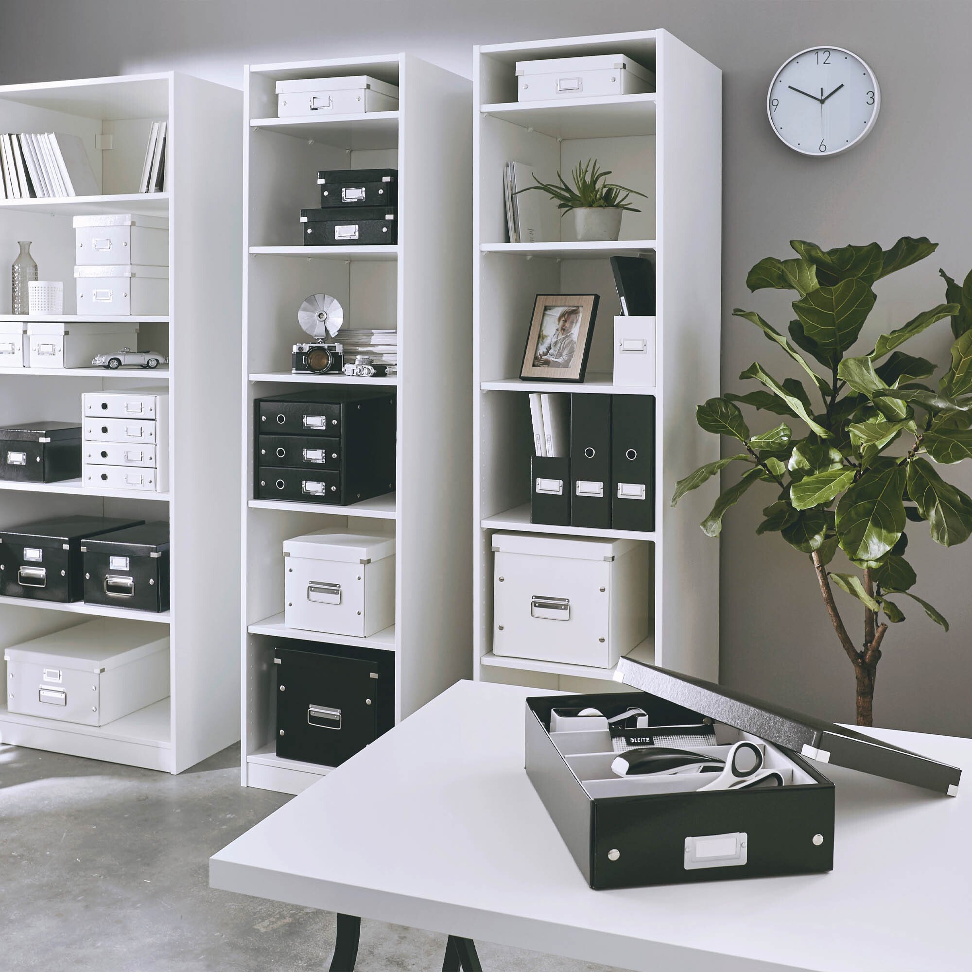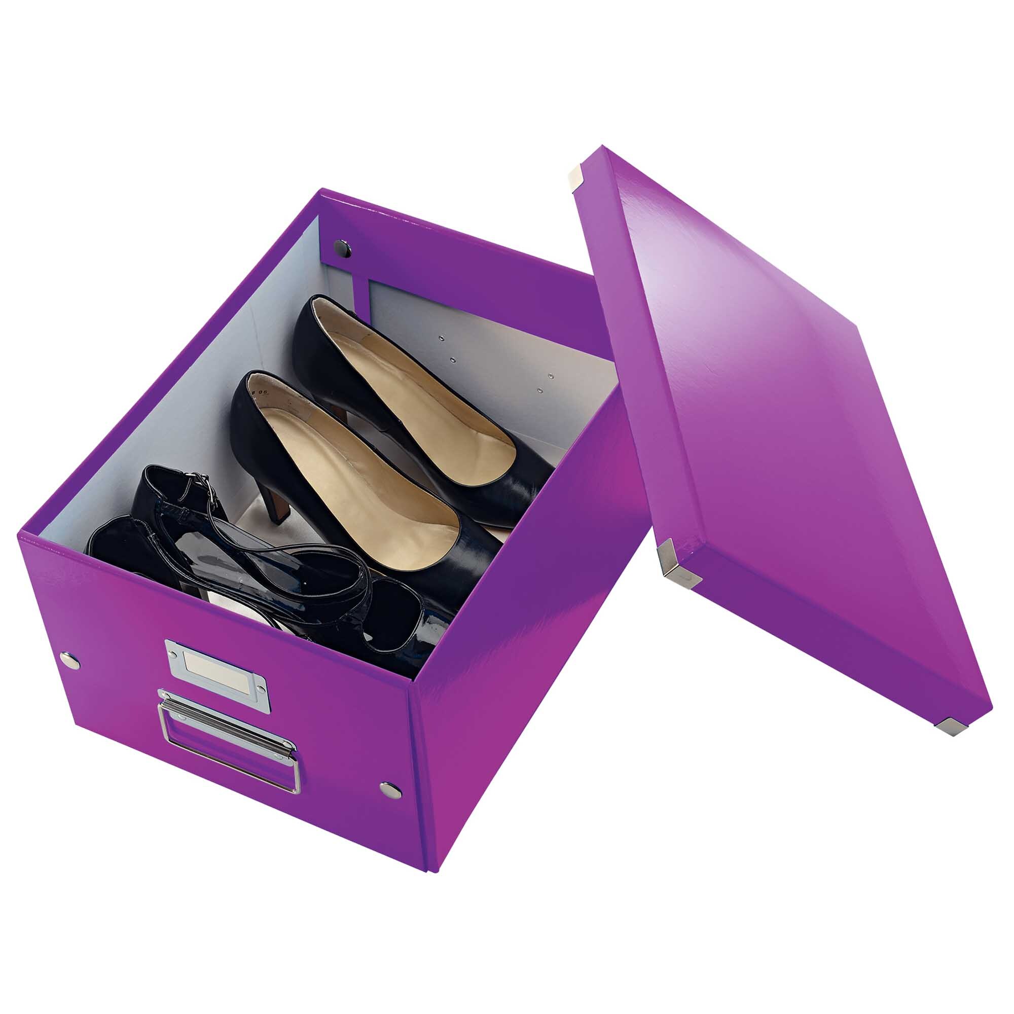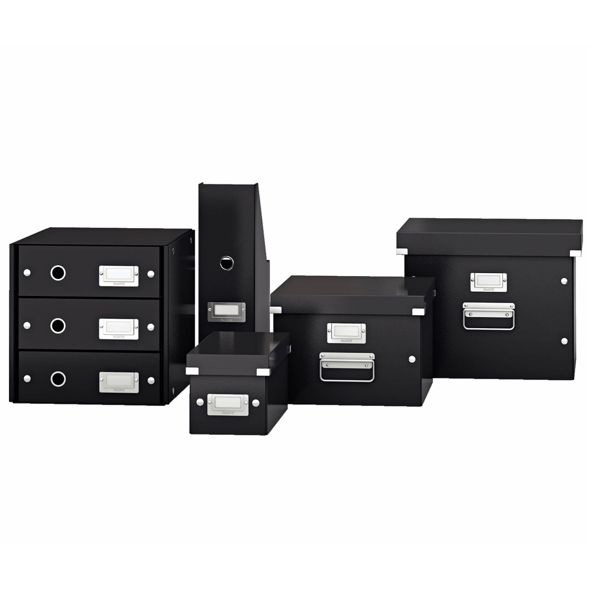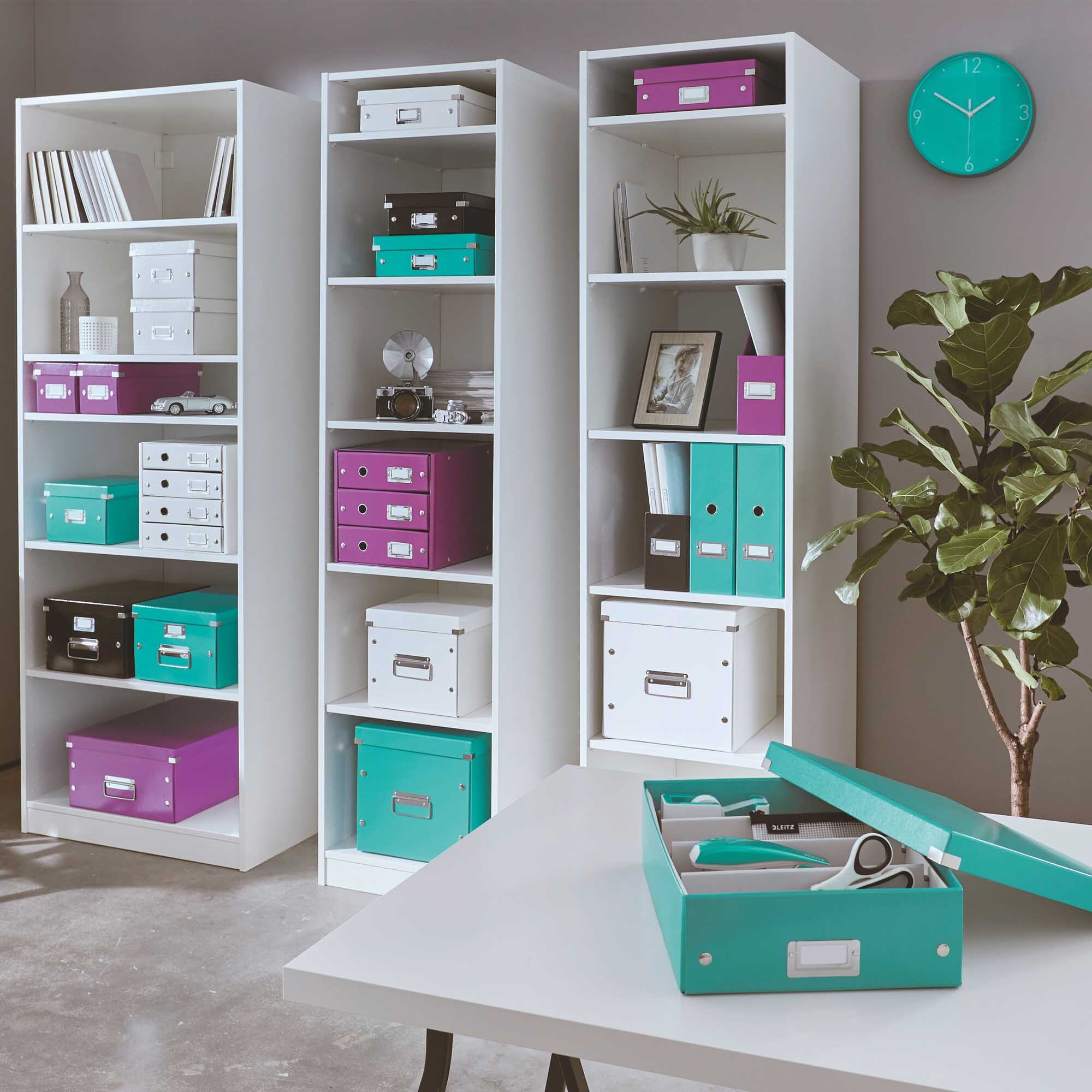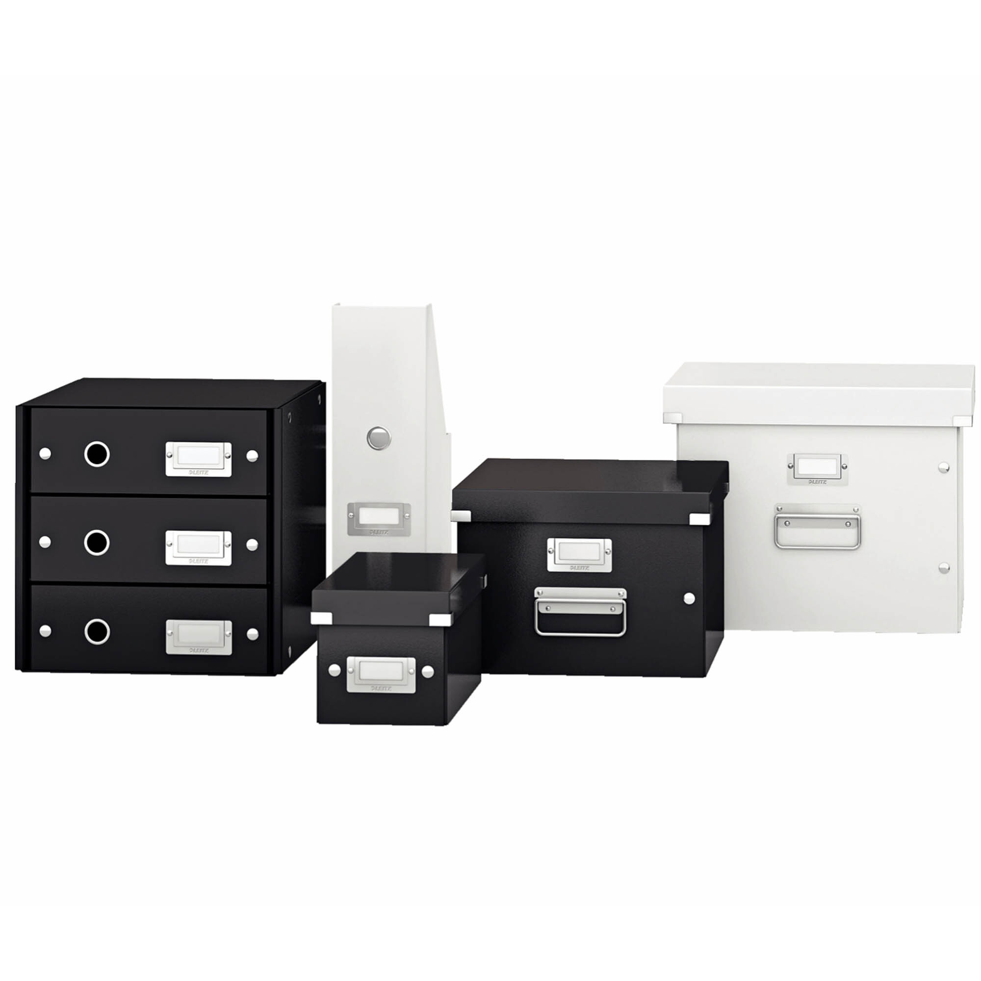 Univerzálna čierna štýlová škatuľa na prehľadné ukladanie dokumentov A4, alebo napr. na rozrobené štrikovanie.. Lesklé PP vyhotovenie vytvára prvotriedny vzhľad škatule a umožňuje dlhodobé používanie a jednoduché utieranie prachu. Má kvalitné kovové rámčeky na popis obsahu s kontrastnými bielymi štítkami. Moderný dizajn, ktorý sa vyníma v každej kancelárii. Dodajte svojmu pracovnému miestu alebo domácnosti farbu a skombinujte škatuľu s ostatnými kancelárskymi výrobkami z radu Leitz WOW. Vyrobené z hrubého kartónu s laminovaným povrchom a kovovými rohmi pre spoľahlivú ochranu. Má pevné kovové držadlá na pohodlnú manipuláciu a prenášanie. Patentovaná konštrukcia zaručuje stohovateľnosť a vyššiu ochranu proti náhodnému rozloženiu škatule pri prenášaní ťažkých vecí. Premyslená skladacia konštrukcia na rýchle a jednoduché zloženie bez nutnosti použitia skrutiek. Možnosť opätovného rozloženia a uloženie do veka keď škatuľu práve nepotrebujete. Váha 0,9 kg. Rozmery 281 x 200 x 370 (mm).