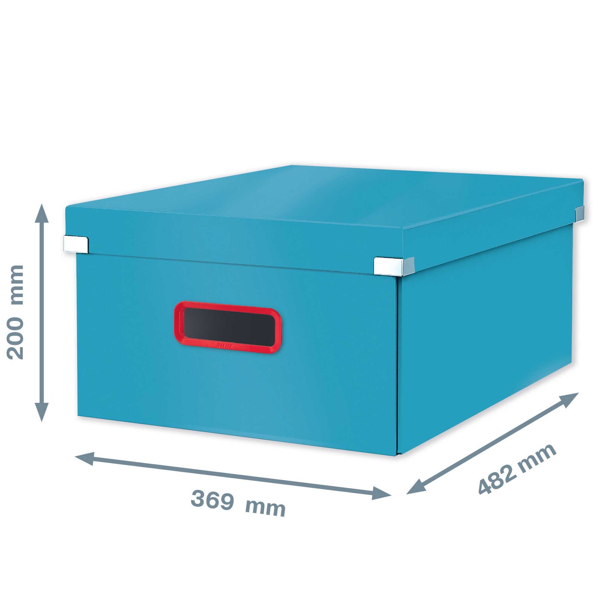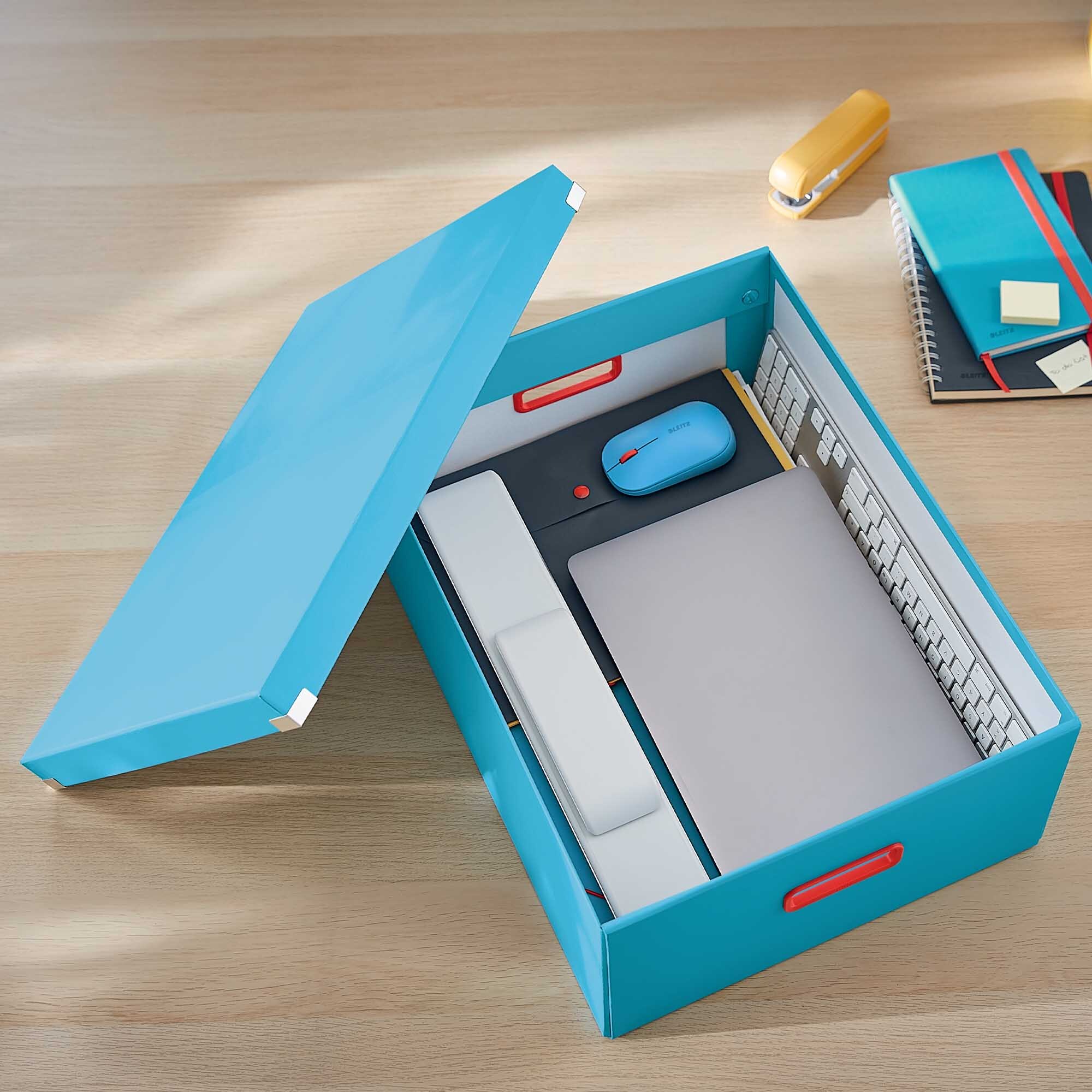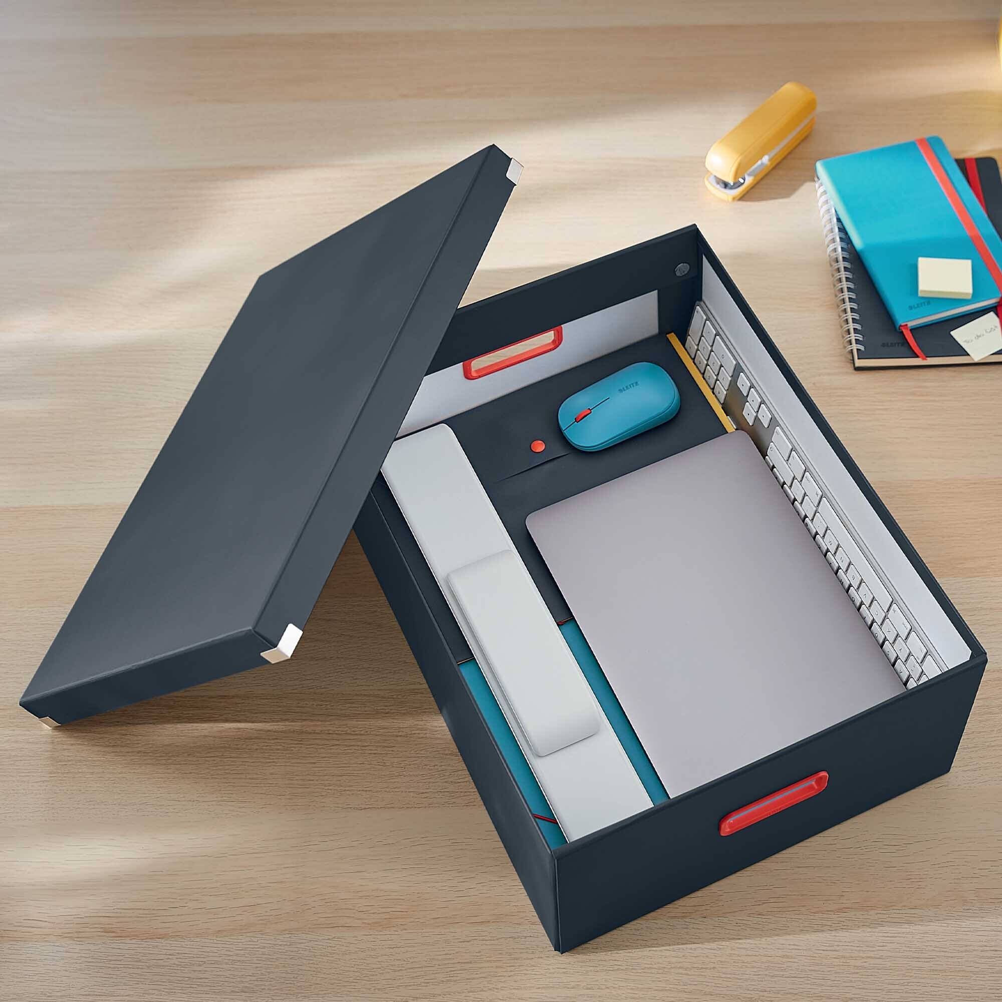 Velká skladacia škatuľa Click & Store COSY s vekom. Vhodná na ukladanie dokumentov až do veľkosti A3 alebo iných väčšie a objemnejších predmetov ako je klávesnica alebo stojan pod notebook. Škatuľa je vybavená s praktickým štýlovým červeným otvorom na uchopenie a bezpečné prenášanie. Odnímateľné veko uchováva obsah v bezpečí a ukrytý pred zvedavými pohľadmi. Rýchle a jednoduché skladanie/rozkladanie pomocou patentov. Rozloženú škatuľu je možné umiestniť do veka a šetriť tak miesto. Prémiová kartónová škatuľa Leitz Cosy Click & Store je ideálna na udržiavanie poriadku doma i v kancelárii a pomáha vám rýchlo a jednoducho si zorganizovať prácu. Vďaka minimalistickému dizajnu a príjemným matným farbám môžete svojmu pracovnému priestoru pridať štýl a farbu. Kolekcia Leitz Cosy kombinuje komfort domáceho pohodlia s prvotriednou kvalitou a vytvára tak pozitívne a produktívne pracovné prostredie. Vyrobené z pevného vysokokvalitného kartónu pre dlhú životnosť, čistá, polomatná PP povrchová úprava. Váha 1,28 kg. Rozmery 369 x 200 x 482 mm.