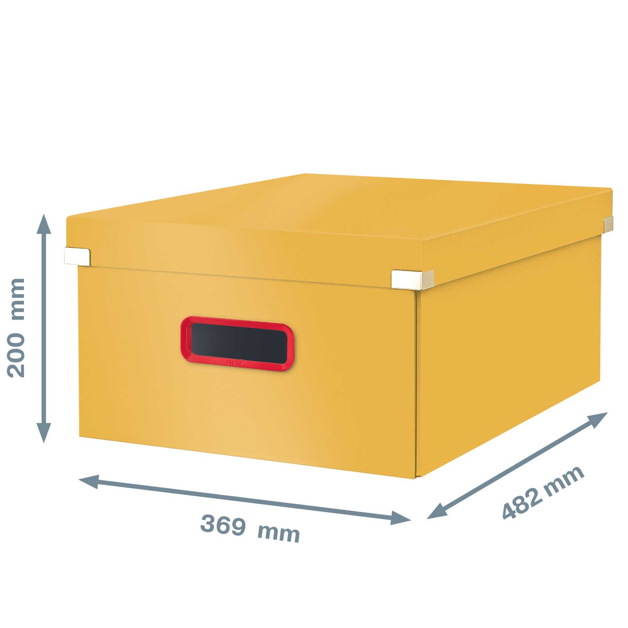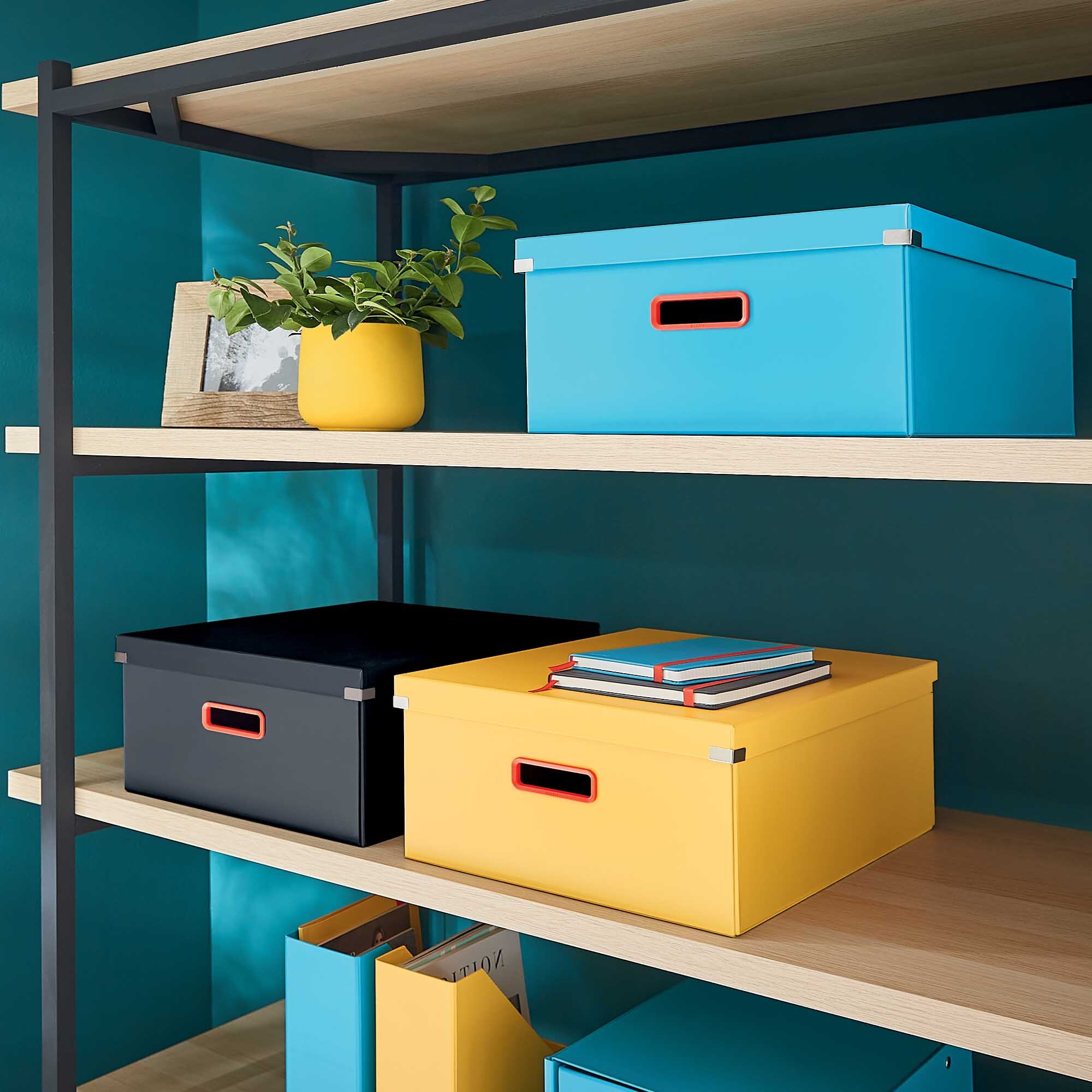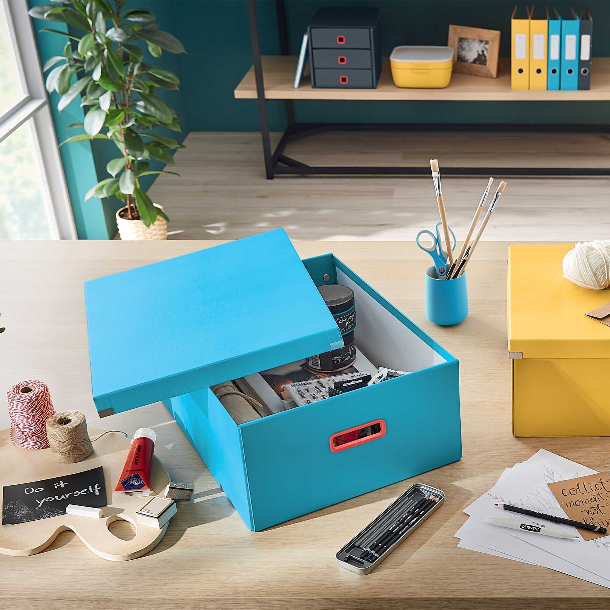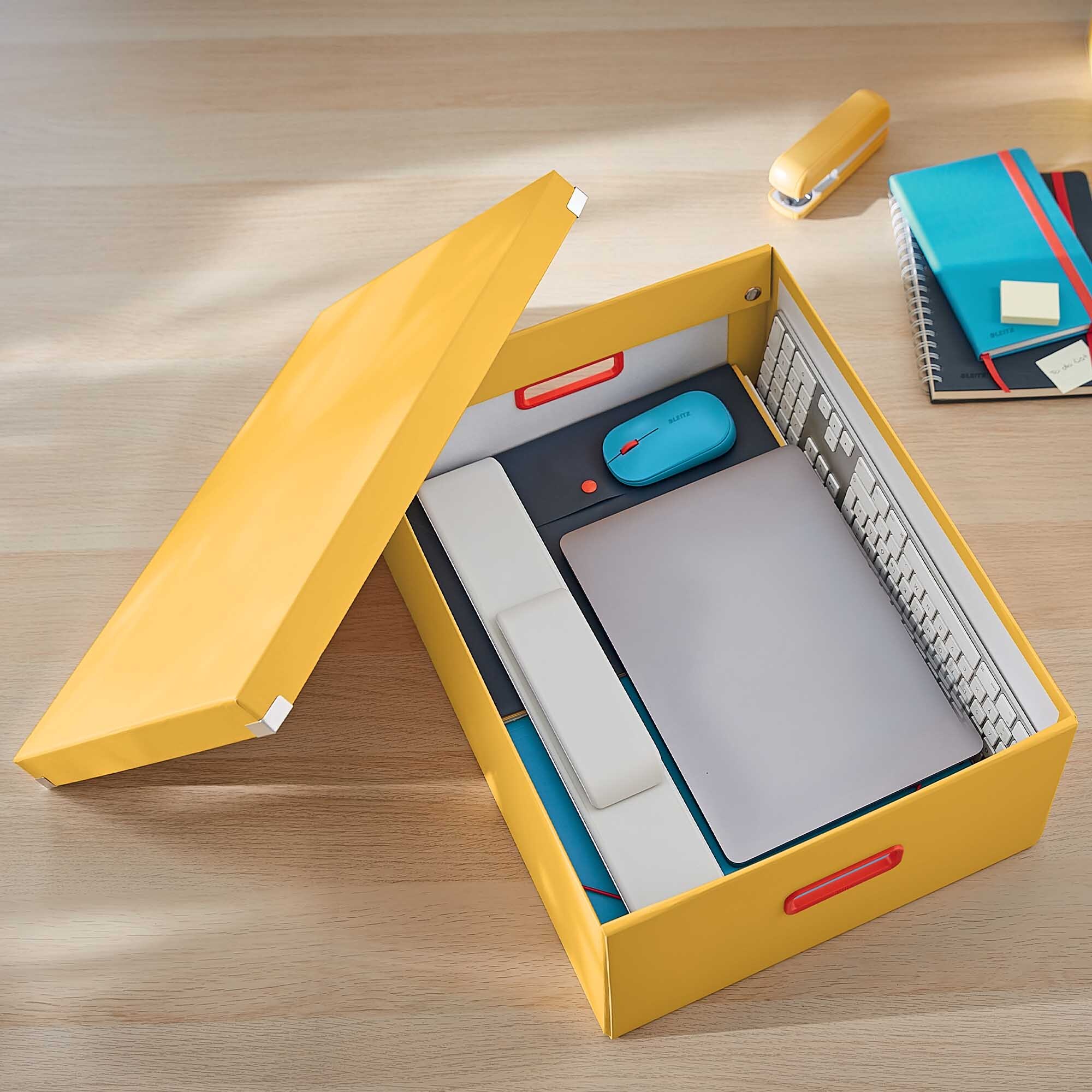 Velká skladacia škatuľa Click & Store COSY s vekom. Vhodná na ukladanie dokumentov až do veľkosti A3 alebo iných väčšie a objemnejších predmetov ako je klávesnica alebo stojan pod notebook. Škatuľa je vybavená s praktickým štýlovým červeným otvorom na uchopenie a bezpečné prenášanie. Odnímateľné veko uchováva obsah v bezpečí a ukrytý pred zvedavými pohľadmi. Rýchle a jednoduché skladanie/rozkladanie pomocou patentov. Rozloženú škatuľu je možné umiestniť do veka a šetriť tak miesto. Prémiová kartónová škatuľa Leitz Cosy Click & Store je ideálna na udržiavanie poriadku doma i v kancelárii a pomáha vám rýchlo a jednoducho si zorganizovať prácu. Vďaka minimalistickému dizajnu a príjemným matným farbám môžete svojmu pracovnému priestoru pridať štýl a farbu. Kolekcia Leitz Cosy kombinuje komfort domáceho pohodlia s prvotriednou kvalitou a vytvára tak pozitívne a produktívne pracovné prostredie. Vyrobené z pevného vysokokvalitného kartónu pre dlhú životnosť, čistá, polomatná PP povrchová úprava. Váha 1,28 kg. Rozmery 369 x 200 x 482 mm.