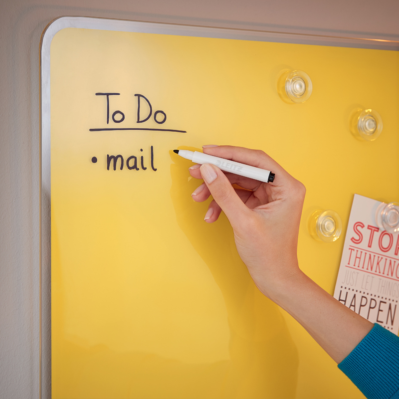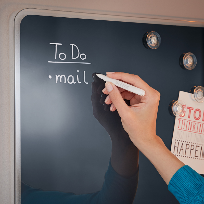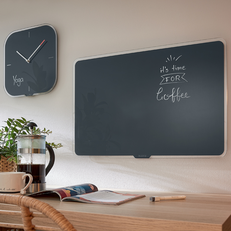Sklenená magnetická tabuľa Leitz Cosy v príjemnej farbe na písanie je nástroj na písanie poznámok. Píšete jednoducho pomocou priloženej suchej fixky, potom stačí zotrieť. Sklenený dizajn tabule je perfektným doplnkom vášho domova alebo kancelárie. (pomôže vám bez stresu zvýšiť produktivitu práce.) Kolekcia Leitz Cosy kombinuje komfort domáceho pohodlia s prvotriednou kvalitou a vytvára tak pozitívne a produktívne pracovné prostredie.