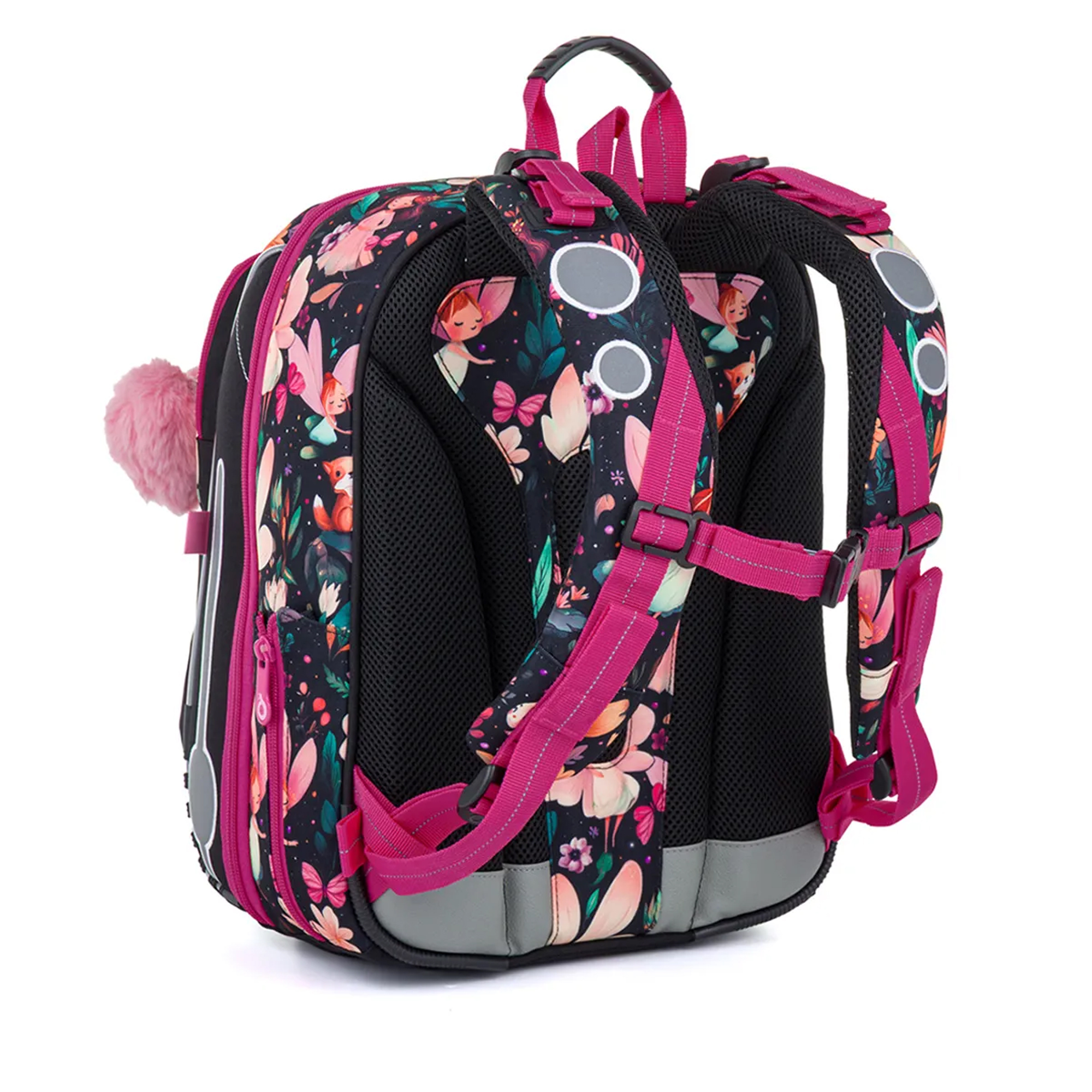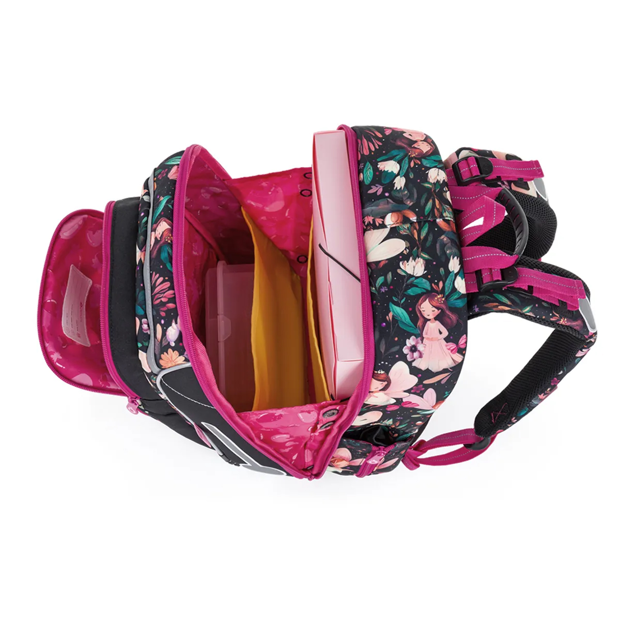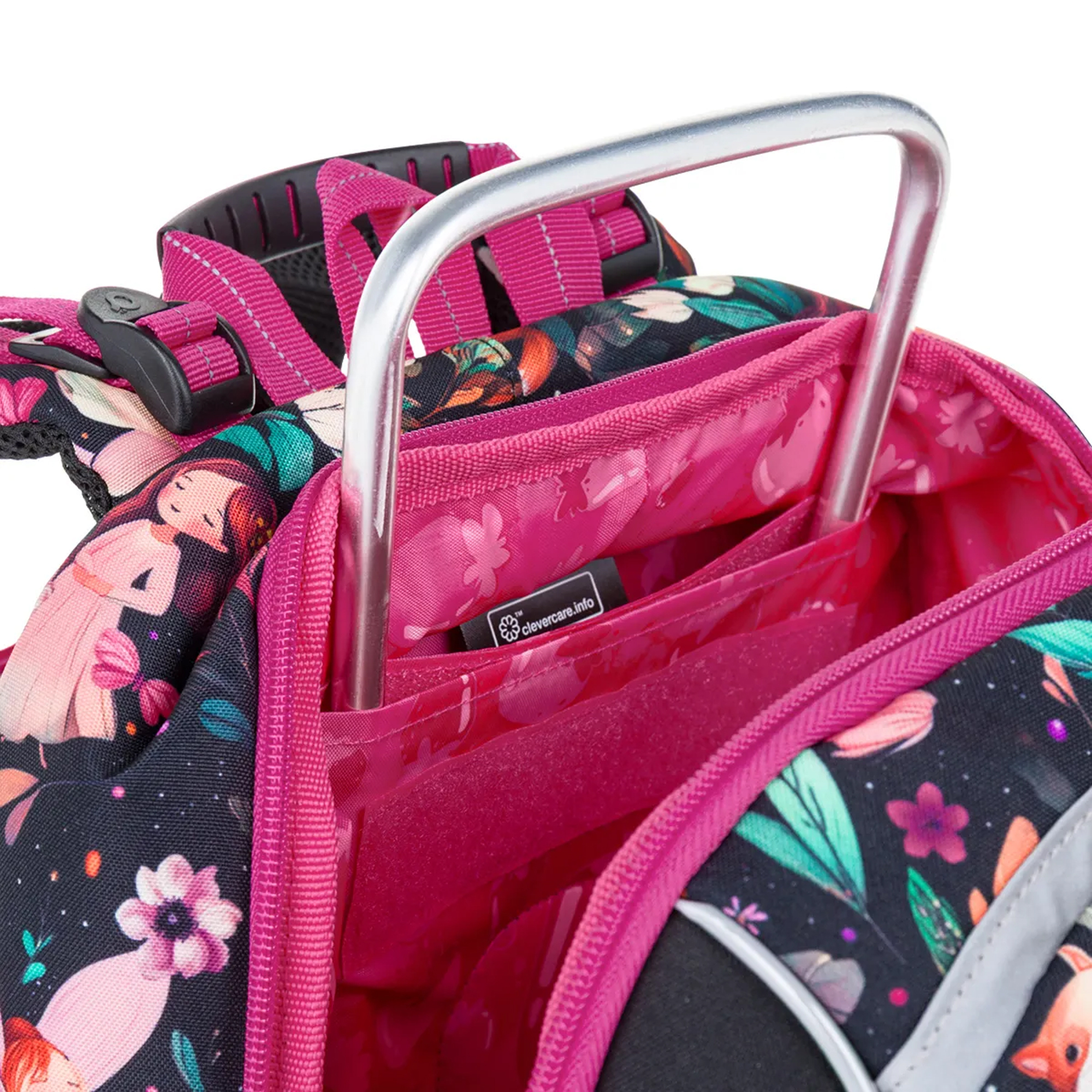 Iskolatáska Bűvös erdő a kisiskolások igényei szerint lett tervezve – könnyű, átlátható és gyönyörűen illeszkedik a hátra. A tündérek, virágok és erdei állatok romantikus motívuma rózsaszín részletekkel kombinálva olyan hátizsákot alkot, amelyet a kislánya első látásra megszeret.