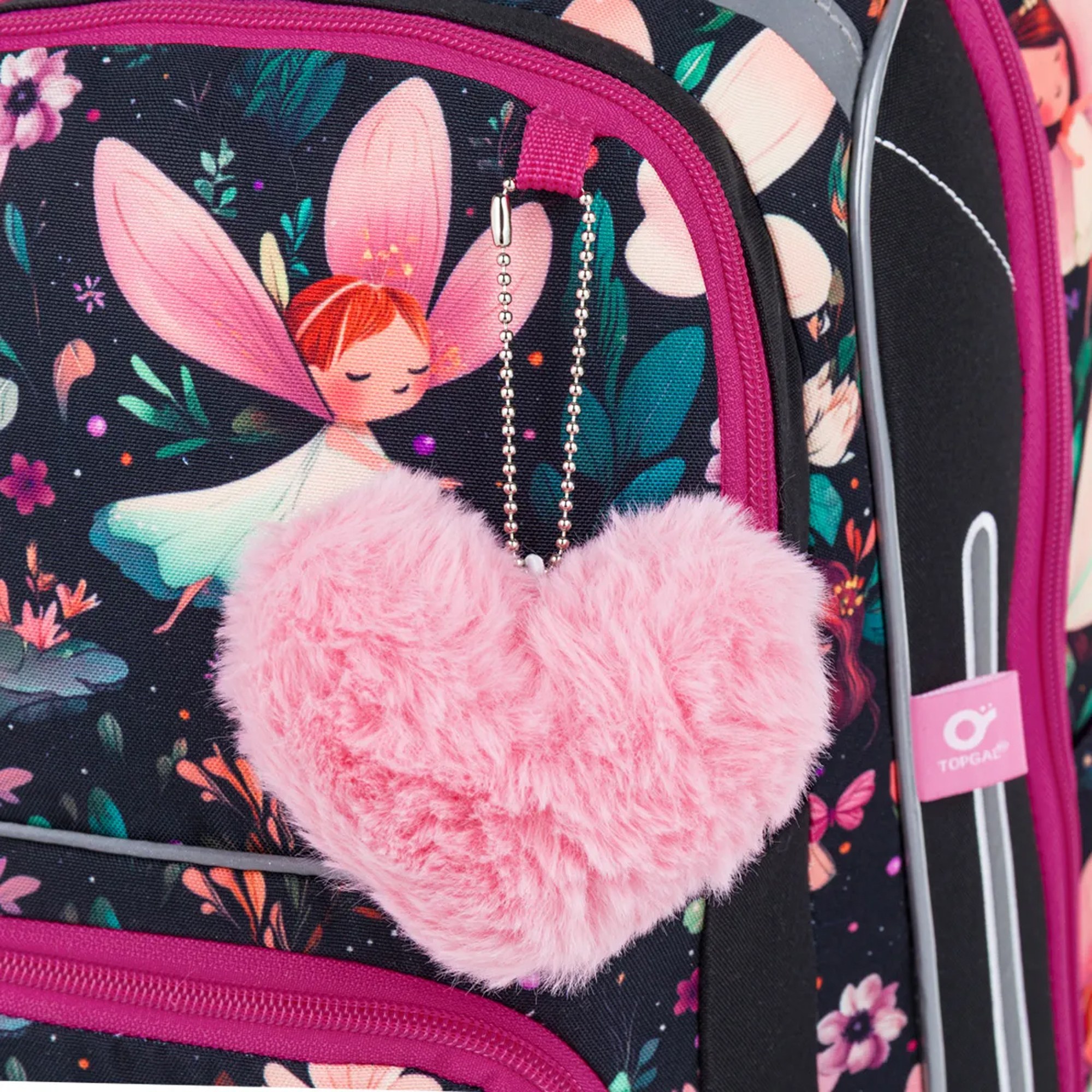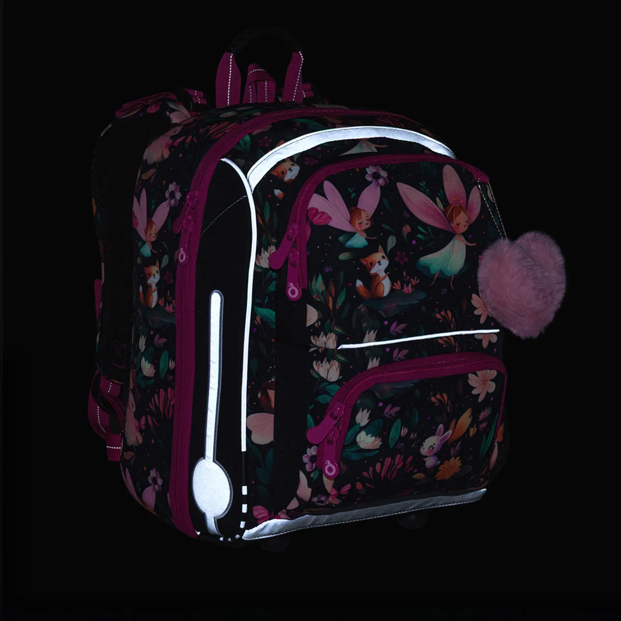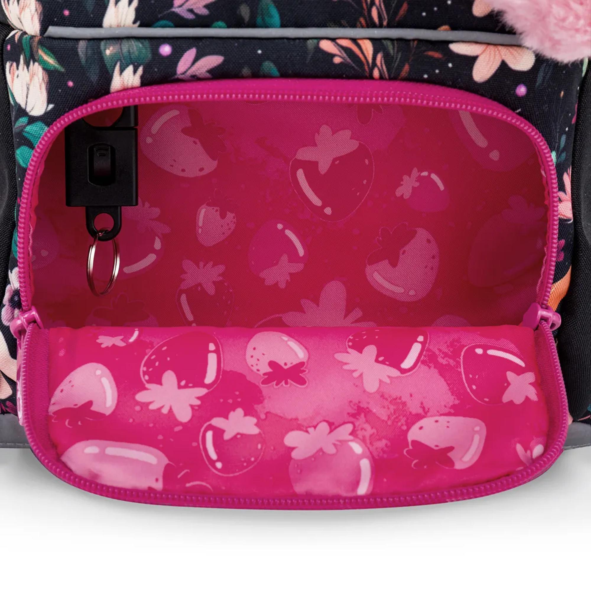 A belső tér praktikus elrendezésű, hogy az iskolai felszerelések könnyen rendszerezhetők legyenek. Nem hiányoznak a reflexiós elemek a jobb láthatóság és biztonság érdekében az iskolába vezető úton. A bájos szőrös kulcstartó játékos részletet ad a hátizsáknak, amely minden kis divatkedvelőt elbűvöl.