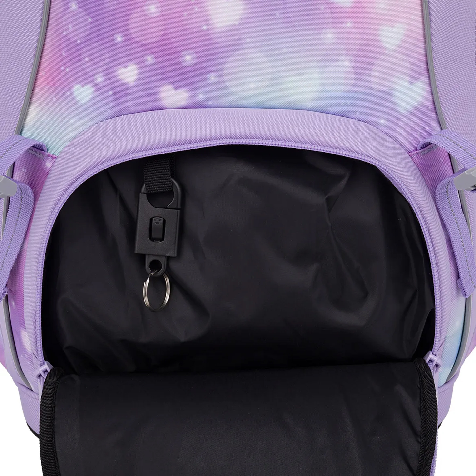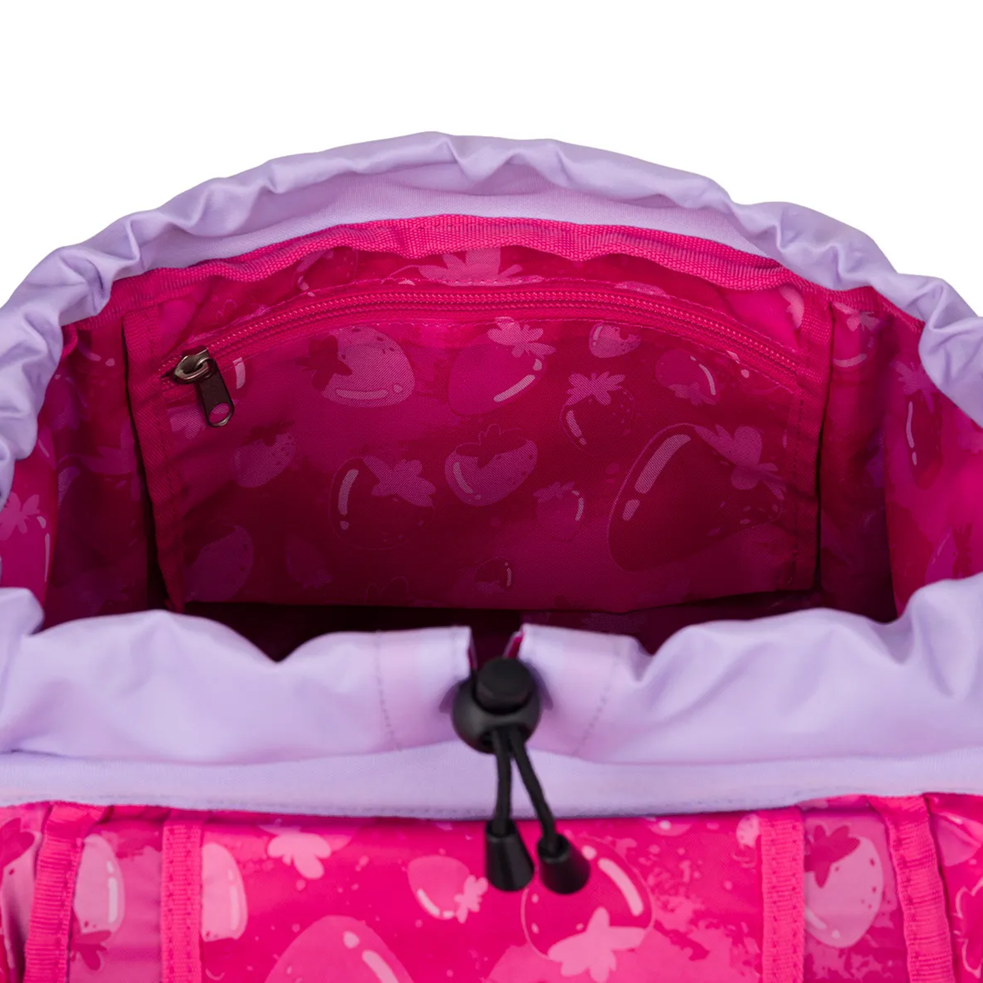 V objemnej hlavnej komore nájdete priehradku, dve malé vrecká na drobnosti a menovku, v prednom vrecku karabínku na kľúče. Na oboch stranách sa nachádzajú robustné vrecká na zdravú fľašu ZIVA s objemom 0,5 litra. Do predného vrecka sme pridali odnímateľnú karabínku na kľúče a zmestí sa doň aj PENN 25004 peračník v rovnakom dizajne alebo naše boxy na desiatu s priehradkou.