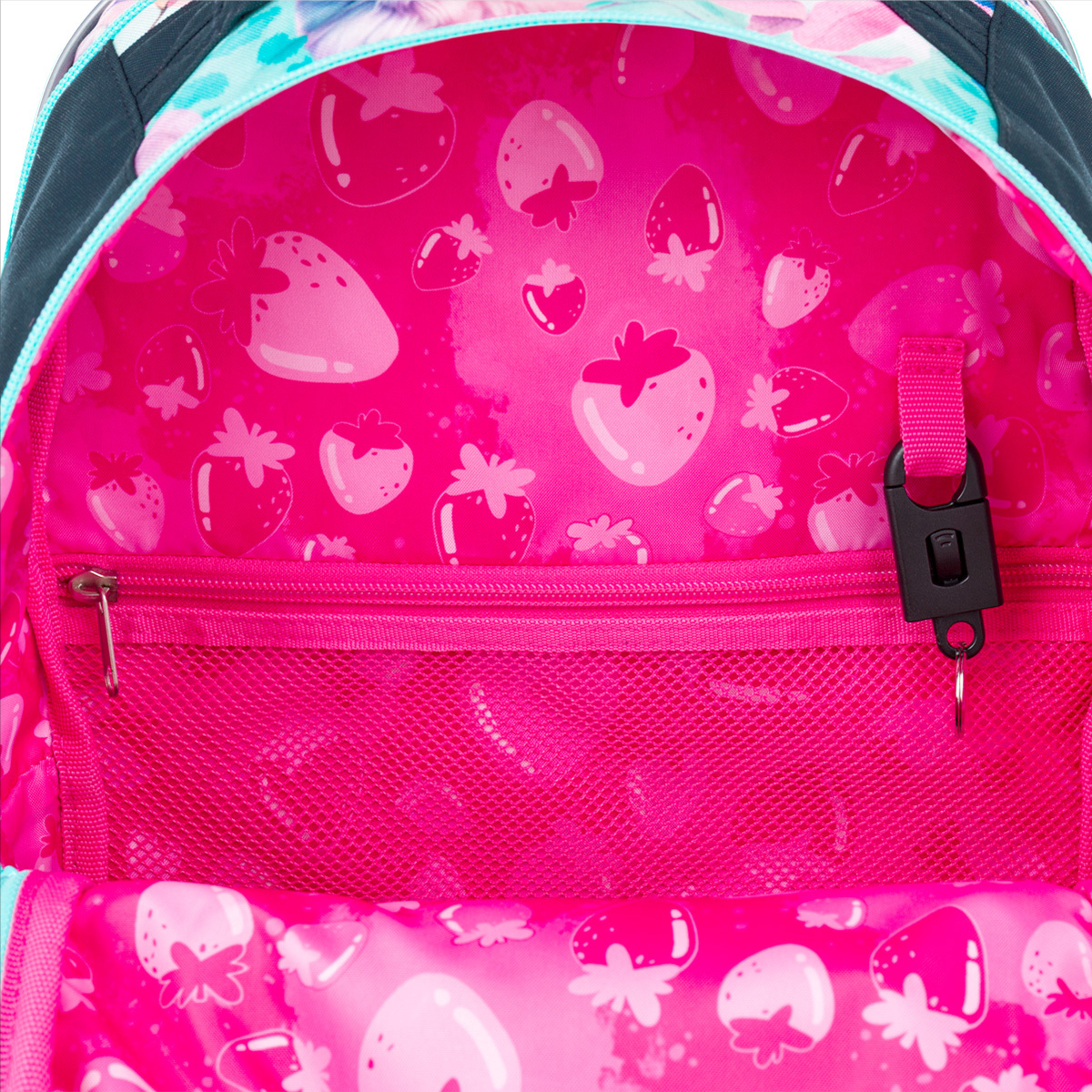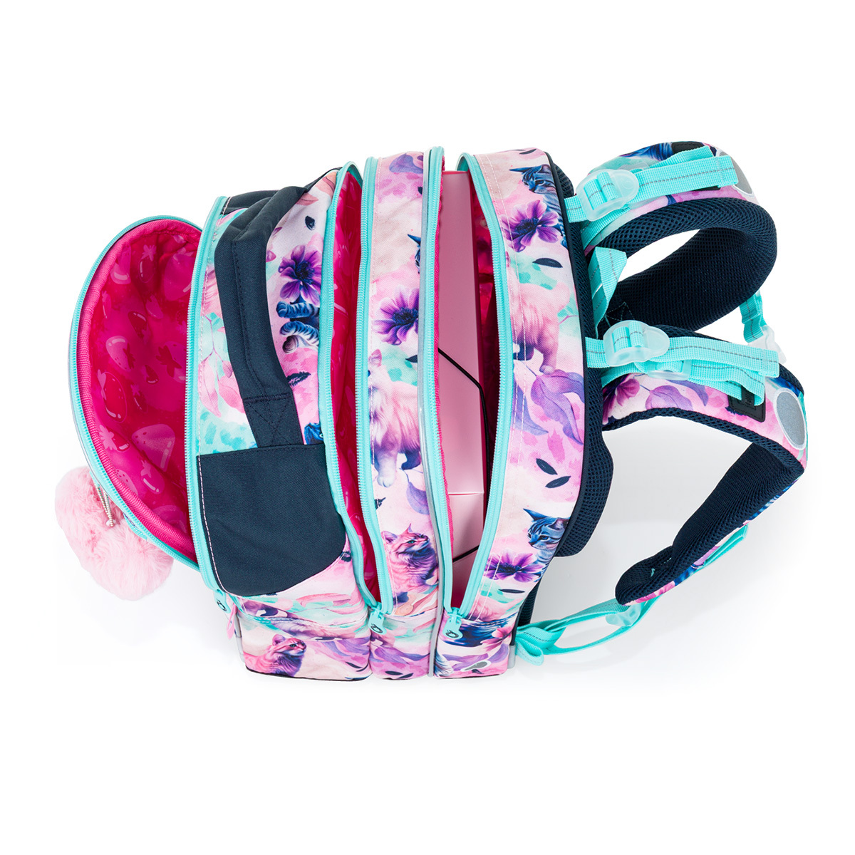 Vnútorný priestor je rozdelený na viacero priehradok, čo umožňuje jednoduchú organizáciu školských potrieb. Do zadnej časti batohu odporúčame uložiť ťažšie učebnice alebo dosky na zošity.