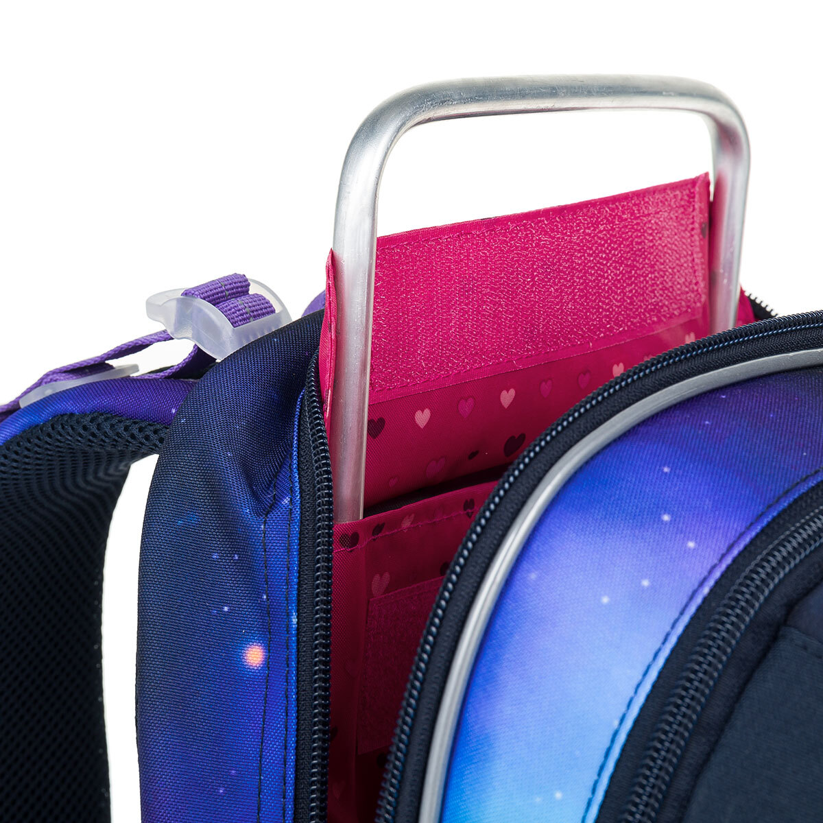 Zadná komora je širšia - odporúčame k chrbtu dávať najťažšie učebnice alebo dosky na zošity. Predná komora je o niečo užšia a je v nej umiestnené ešte malé sieťované vrecko na zips a menovka.