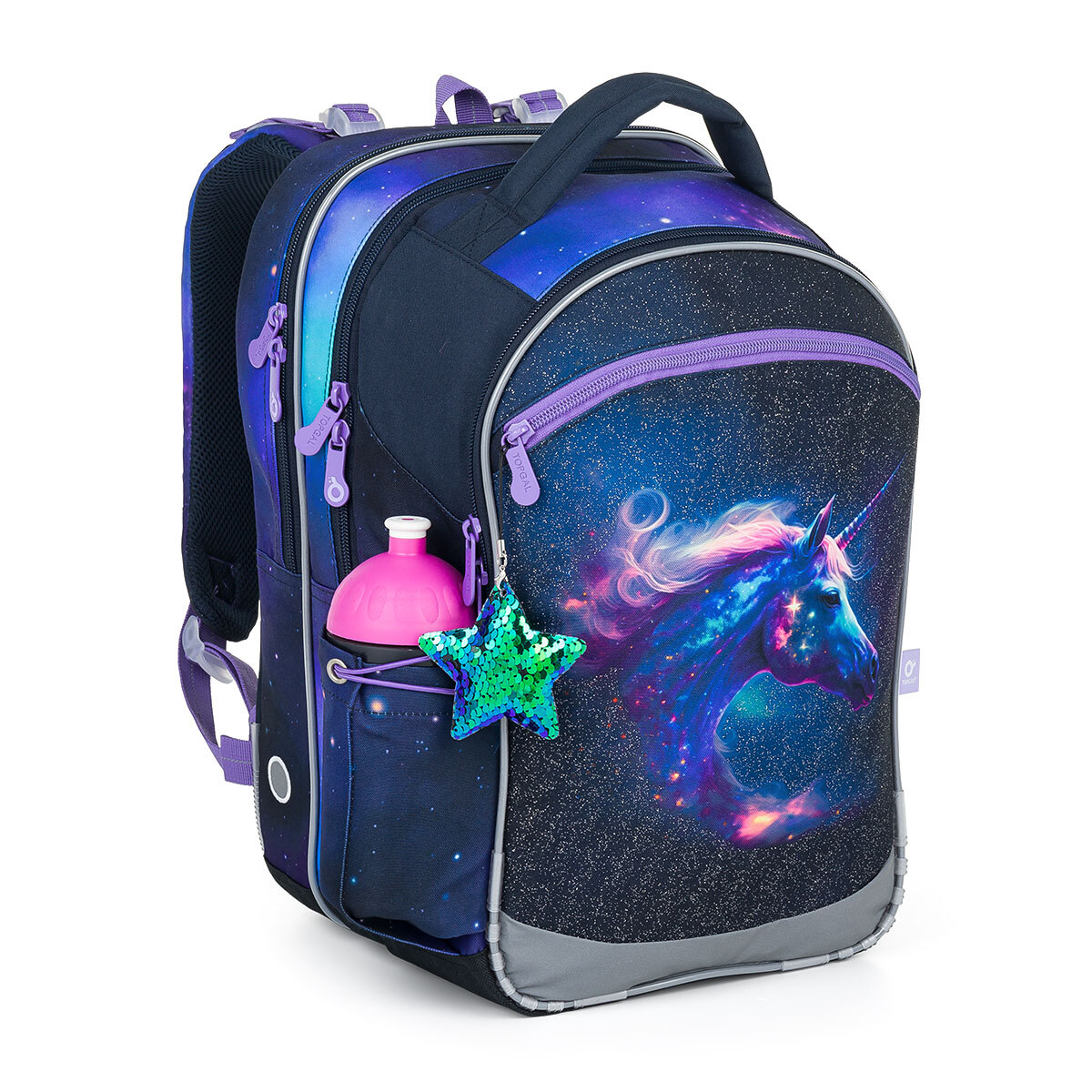 Ľahučký dvojkomorový model ENDY neváži ani kilogram a skvele padne drobnejším školákom od prvej do tretej triedy ZŠ. Vďaka rozkošnému motívu koníka a hebkému prívesku v tvare srdiečka sa rýchlo stane obľúbeným každodenným spoločníkom každej malej princeznej. Do priestrannej zadnej komory odporúčame ukladať tie najťažšie učebnice alebo dosky na zošity, smerom dopredu potom ľahšie školské potreby. Predná komora je užšia, obsahuje praktické sieťované vrecko na zips a menovku. Ideálna na peračník v rovnakom dizajne alebo box na desiatu. Do bočného vrecka sa pohodlne zmestí fľaša ZIVA s objemom 0,5 litra. Hlavná charakteristika: nízka hmotnosť – len 880 gramov pevne tvarovaná chrbtová časť dve komory a menšie sieťované vrecko vo vnútri reflexné prvky vpredu, na bokoch aj na ramenných popruhoch konce ramenných popruhov sú vybavené magnetmi (pre ľahšie uchytenie vlajúcich koncov) silné dno z materiálu TOPDURA s plastovými nožičkami pútka na bedrový pás TOP 24021 alebo TOP 24022 praktické pútko na zavesenie batohu na lavicu výškovo nastaviteľná hrudná pracka odnímateľná karabínka na kľúče nastaviteľné ramenné popruhy batoh testovaný v ITC Zlín PU záter proti dažďu