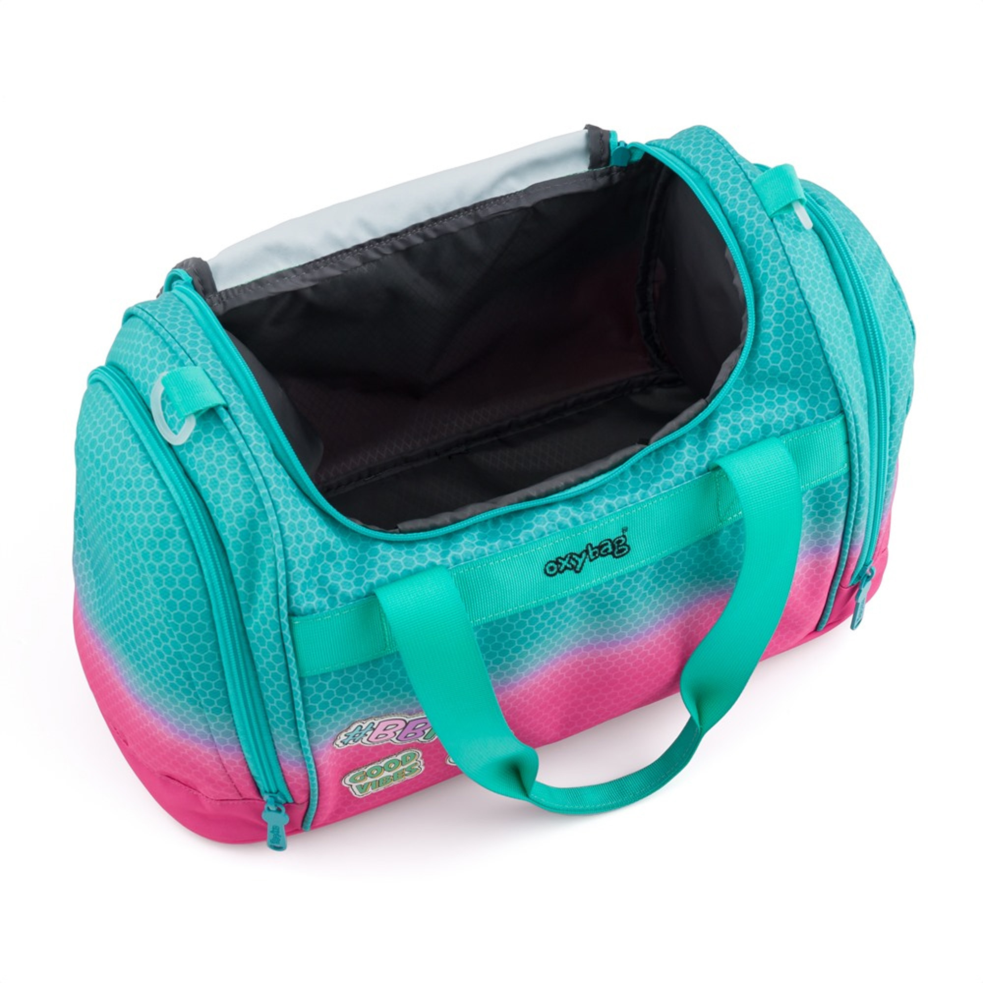 Športová taška Ombré s pevným dnom a ochrannými nožičkami je ideálna pre malých športovcov. Ponúka priestranné hlavné vrecko na všetko potrebné vybavenie, samostatné bočné vrecko na topánky a dve menšie vrecká na drobnosti.