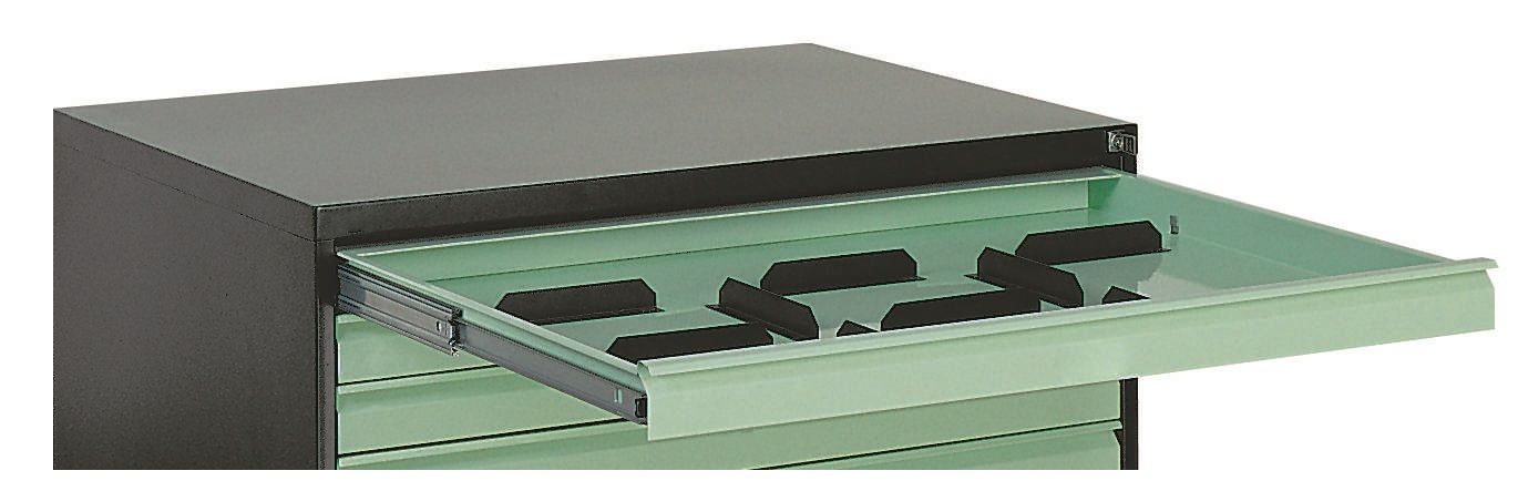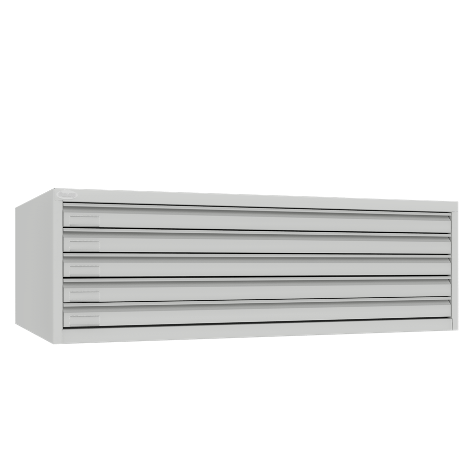 Kovová zásuvková skriňa na vodorovné ukladanie. Vyrobená z kvalitného oceľového plechu povrchovo upraveného práškovou farbou v odtieni šedej RAL 7035. Zásuvky sú osadené guľovým vedením so 100% výsuvom, čo umožňuje ľahký prístup k dokumentom v celej dĺžke zásuvky. Uzamykanie je riešené centrálne jedným cylindrickým zámkom.