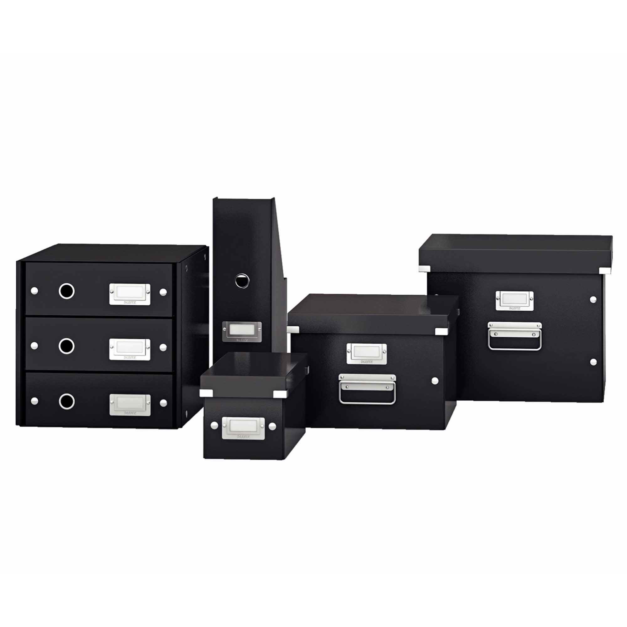 Atraktívna čierna škatuľa v tvare kocky na prehľadné ukladanie vyšších, alebo objemnejších predmetov. Veľkostne dokonale zapadne do polic a knižníc (napr. Ikea Billy). Má pevné kovové držadlá na pohodlnú manipuláciu a prenášanie. Kvalitné kovové rámčeky na popis obsahu s kontrastnými bielymi štítkami. Moderný dizajn, ktorý sa vyníma v každej kancelárii. Dodajte svojmu pracovnému miestu alebo domácnosti farbu a skombinujte škatuľu s ostatnými kancelárskymi výrobkami z radu Leitz WOW. Vyrobené z hrubého kartónu s laminovaným povrchom a kovovými rohmi pre spoľahlivú ochranu. Lesklé PP vyhotovenie vytvára prvotriedny vzhľad škatule a umožňuje dlhodobé používanie a jednoduché utieranie prachu. Patentovaná konštrukcia zaručuje stohovateľnosť a vyššiu ochranu proti náhodnému rozloženiu škatule pri prenášaní ťažkých vecí. Premyslená skladacia konštrukcia na rýchle a jednoduché zloženie bez nutnosti použitia skrutiek. Možnosť opätovného rozloženia a uloženie do veka keď škatuľu práve nepotrebujete. Váha 0,87 kg. Rozmery 260 x 240 x 260 (mm).