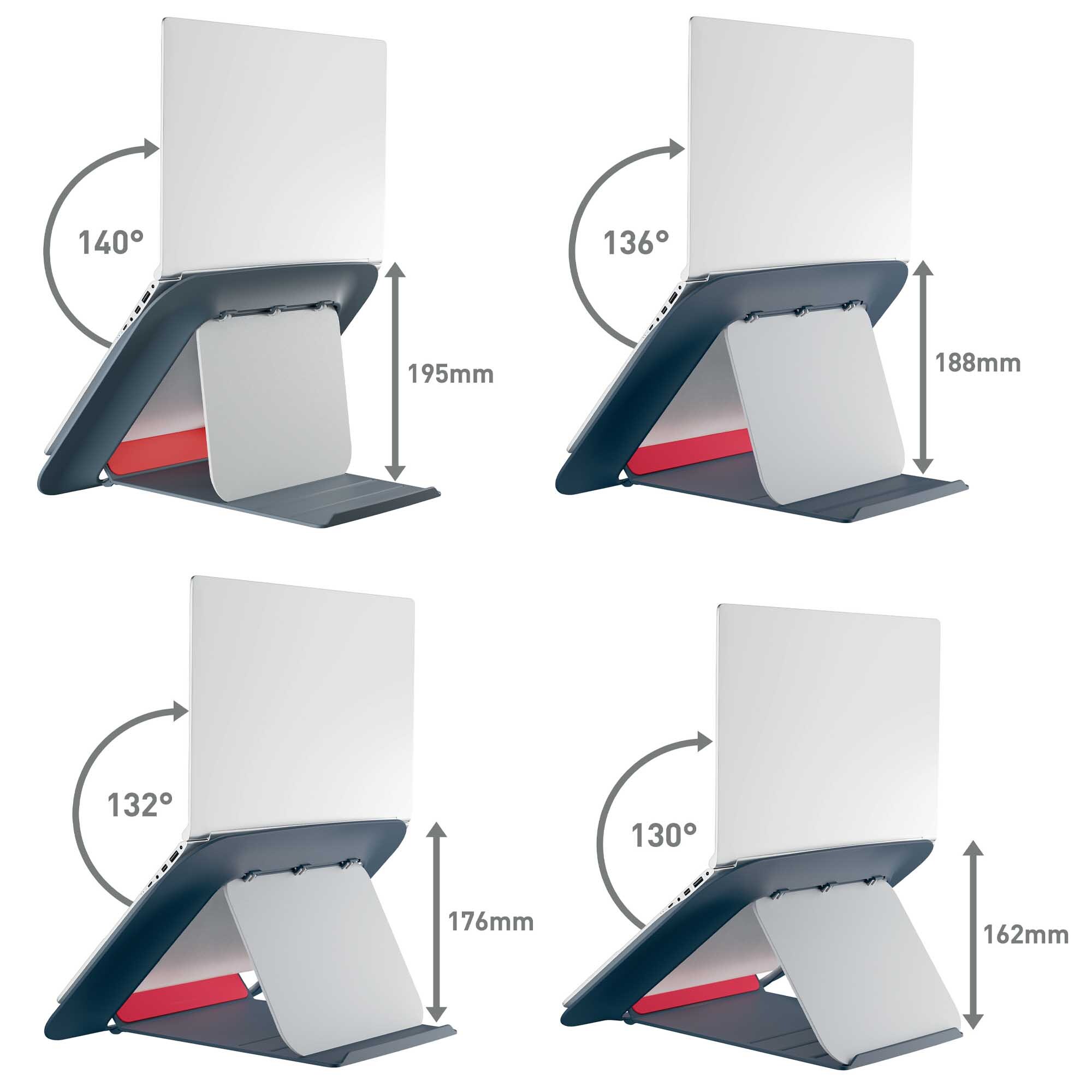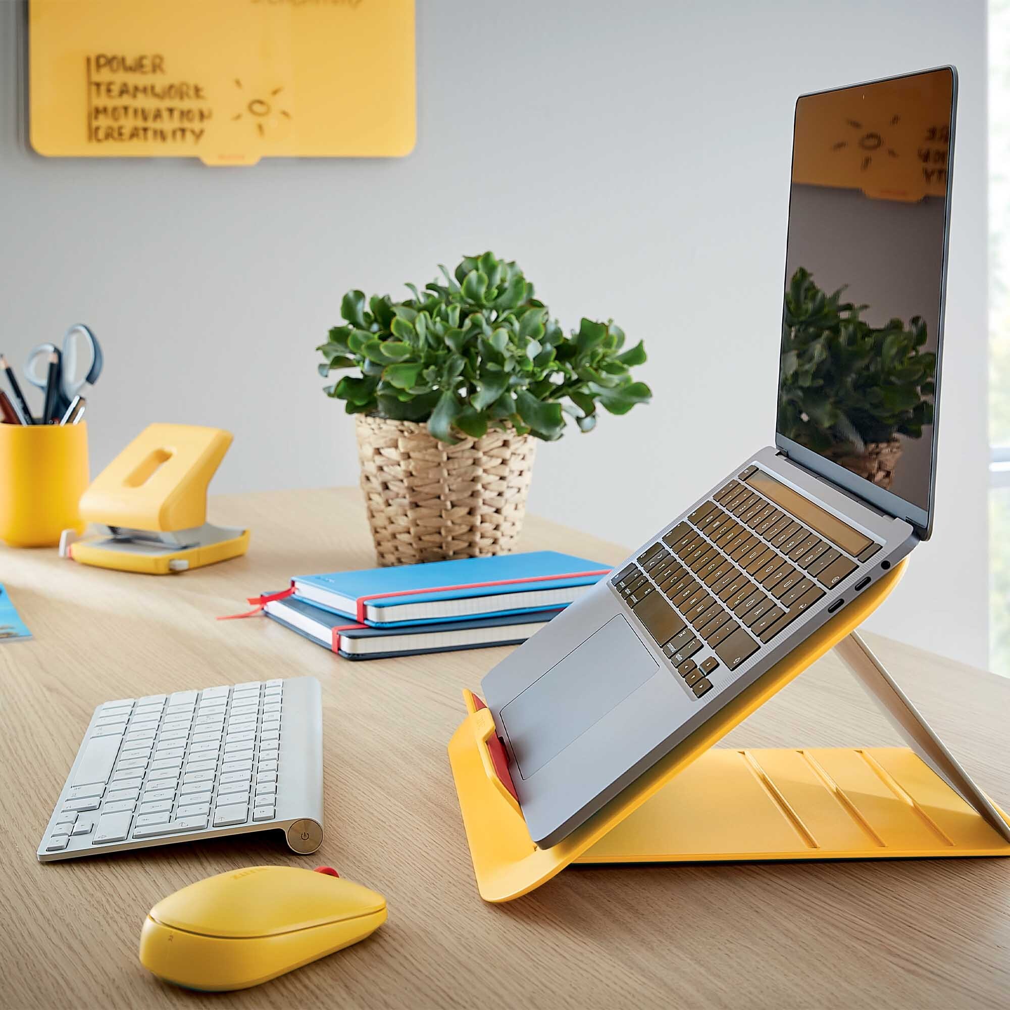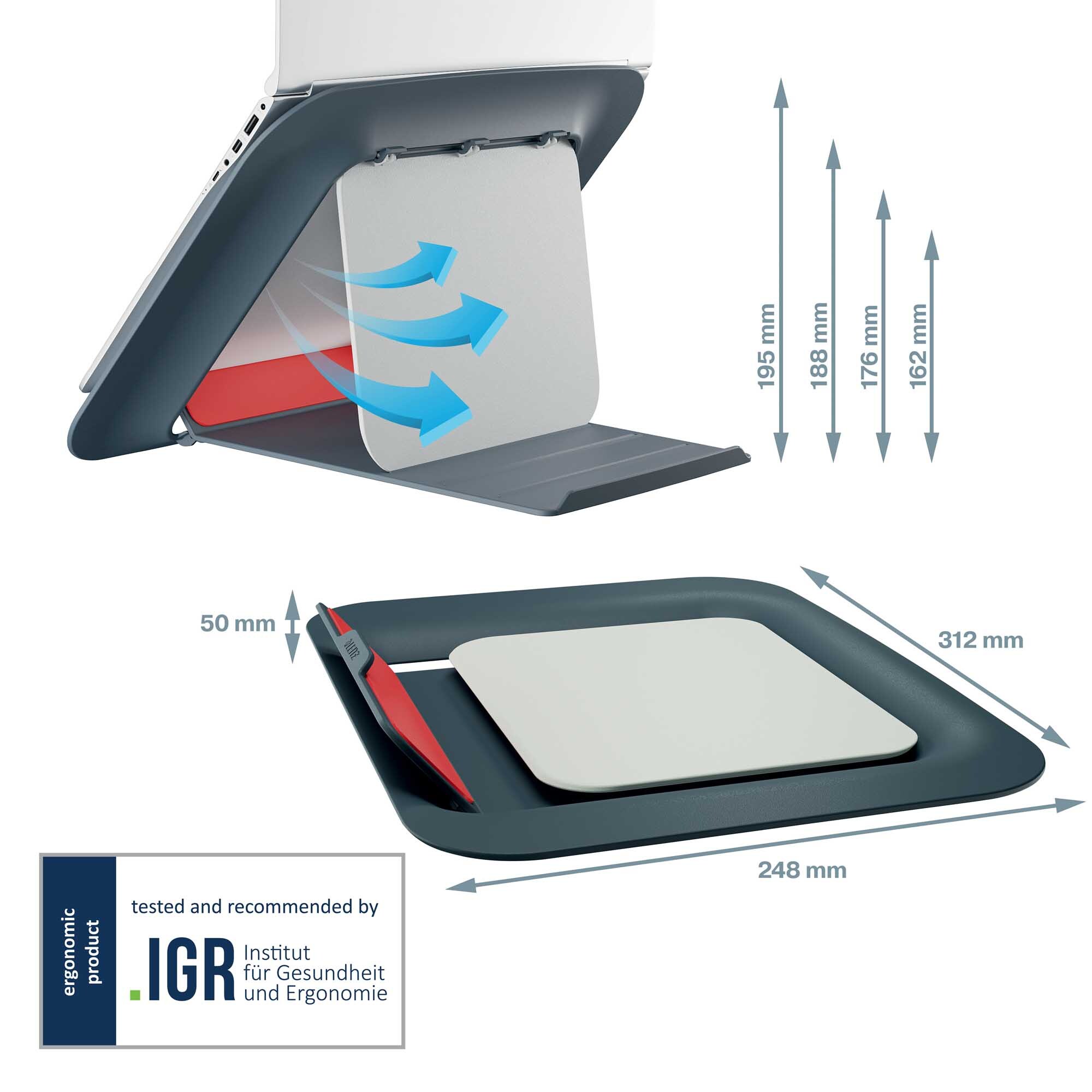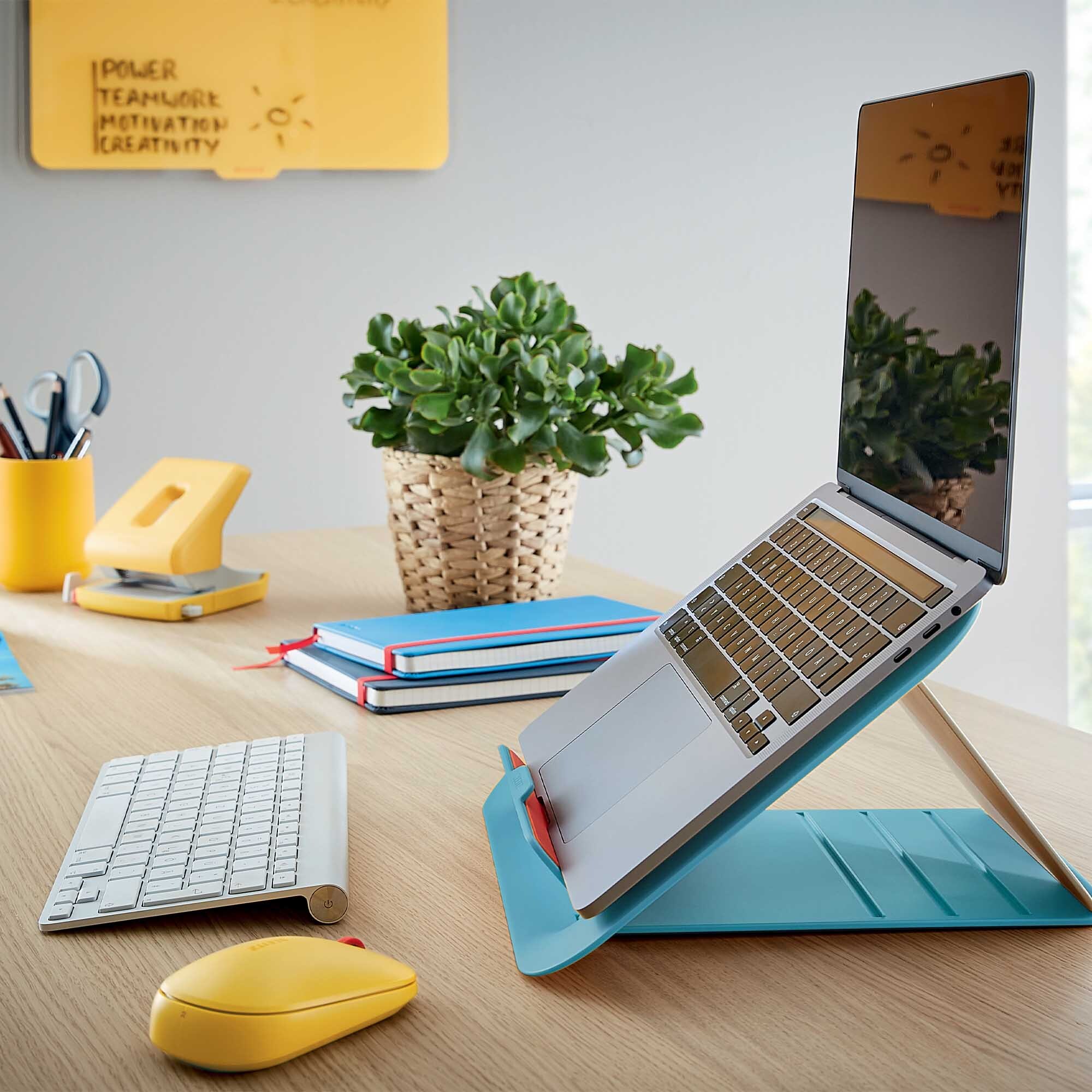 Ergonomický stojan na notebook Leitz Cosy Ergo nadvihne notebook, zvýši tak pohodlie pri jeho sledovaní a pomôže zlepšiť držanie tela. Ideálny na prácu posediačky alebo postojačky pri výškovo nastaviteľnom stole, čo ešte viac zlepšuje celkové zdravie a pohodu. Stojan na notebook udržiava batériu a ostatné komponenty v perfektnom stave vďaka chladeniu prúdením vzduchu. Rýchle a jednoduché individuálne prispôsobenie stojana na notebook. Štyri rôzne výšky na výber, Vďaka ktorým je ideálnym doplnkom každého pracovného stola.
